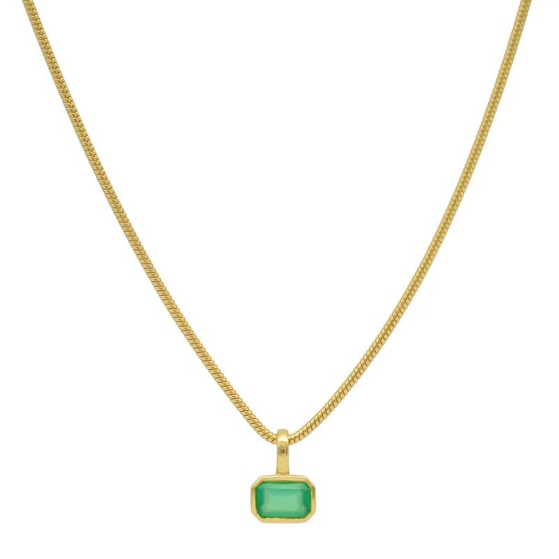 Our Gemme Pendant set with a natural green onyx on a round snake chain necklace. The pendant is removable, so the chain can be work with or without for versatility.