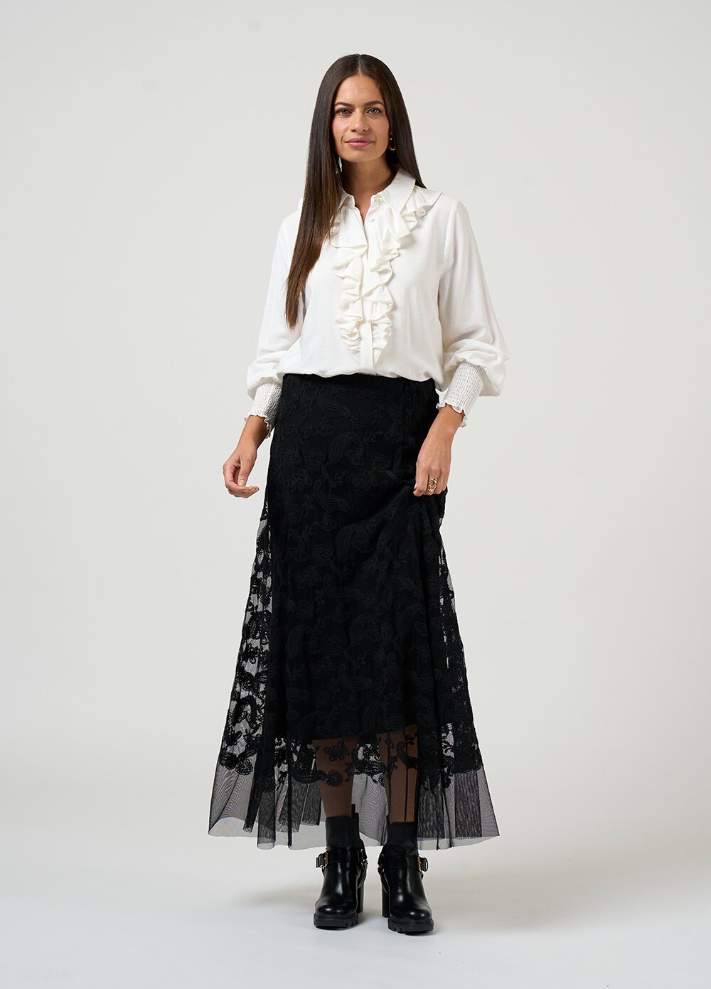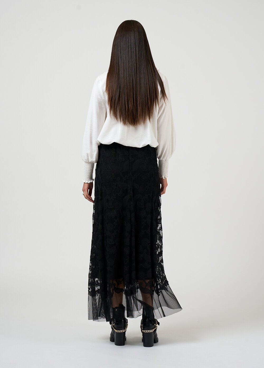 Embroidered tulle midi skirt, with the intricate embroidery is placed to stop short of the hem, creating a subtle border. Featuring a stretch jersey lining, with an elasticated side-back waist, and zip entry for ease and comfort.