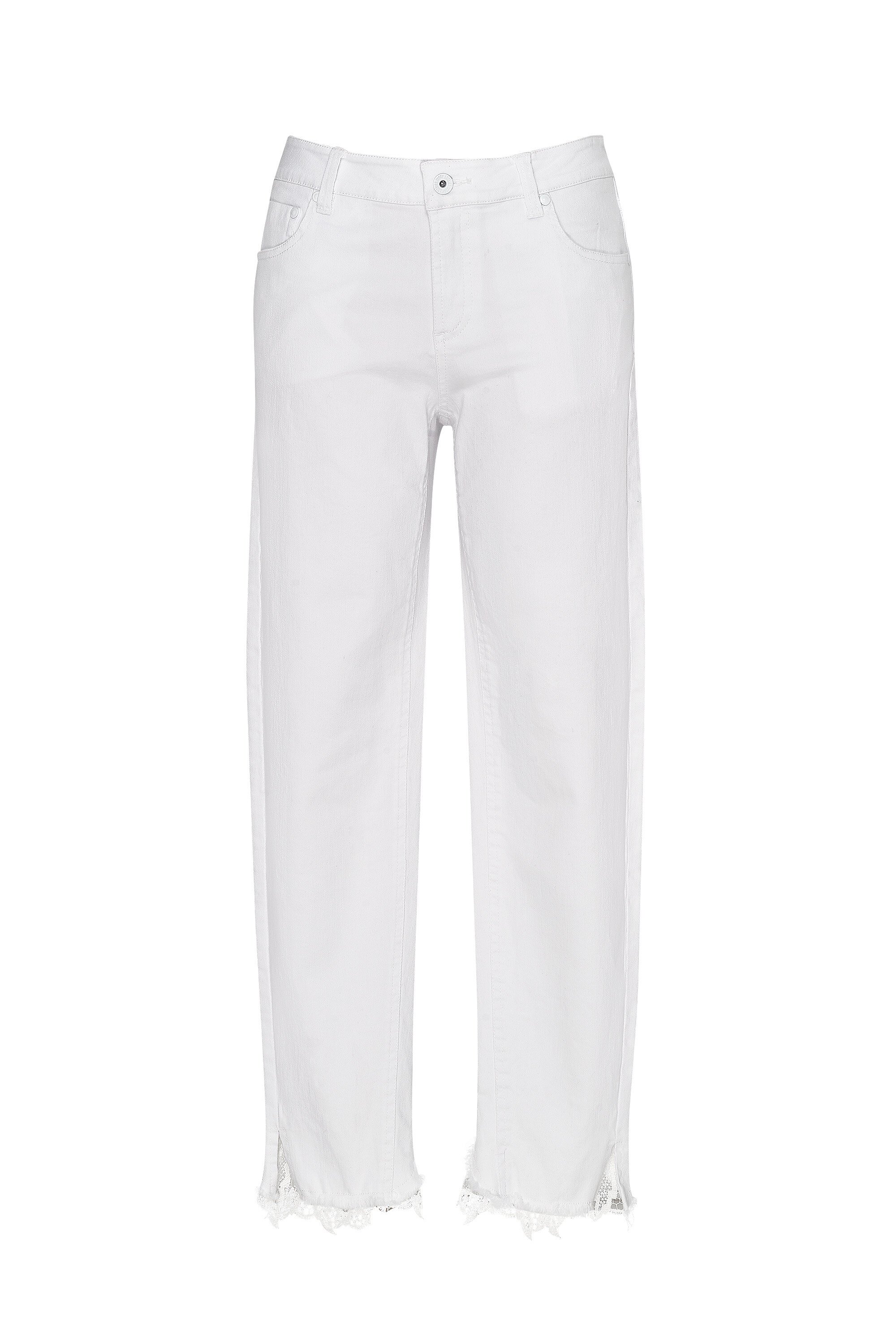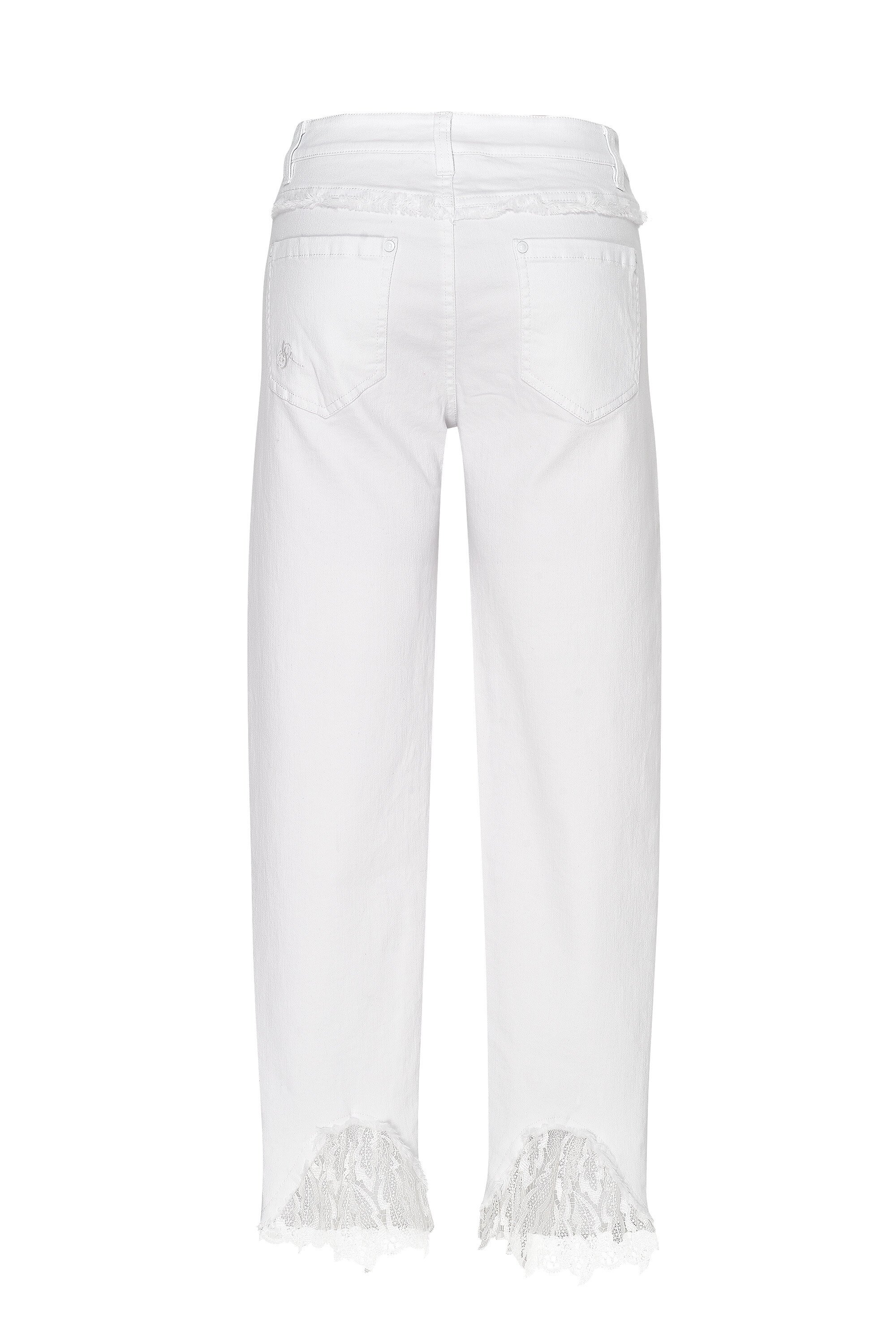 Loobie's Story signature mid rise jean in white stretch denim. 7/8 leg length with soft frayed edging at the hem and lace feature at the back hem. White coated hardware.
