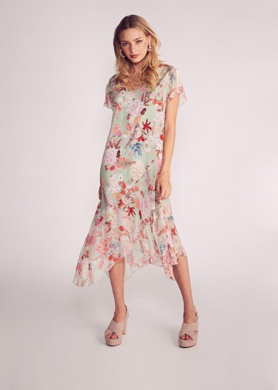Midi length dress in stretch silk fabrication to create great shape on the body. Soft sheer sleeve and hem panel cut in sheer print creates softness and fluidity.