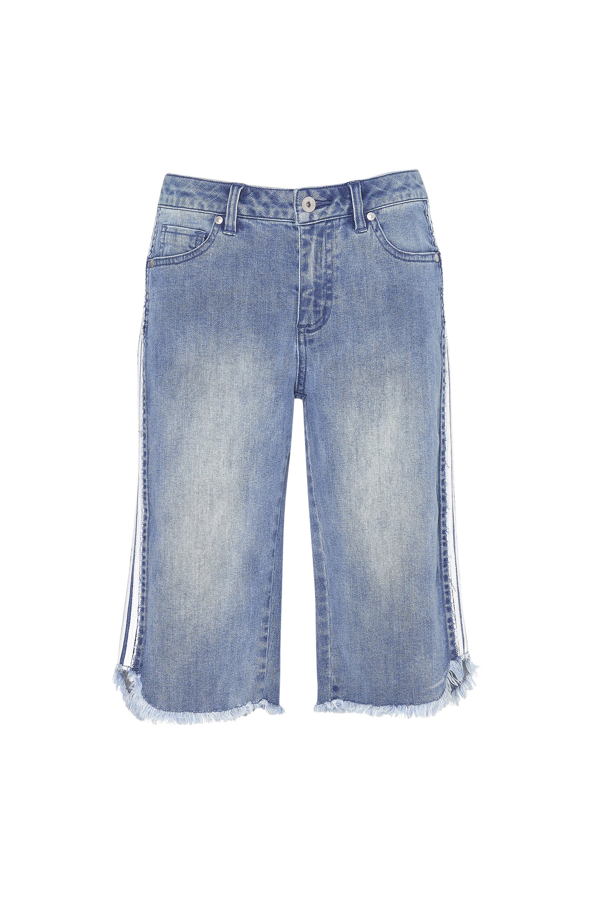 Loobie's Story signature mid rise short to the knee, in mid wash stretch denim. Soft frayed edging at the hem and side seam panel. White herringbone tape feature along side panel. Silver hardware.