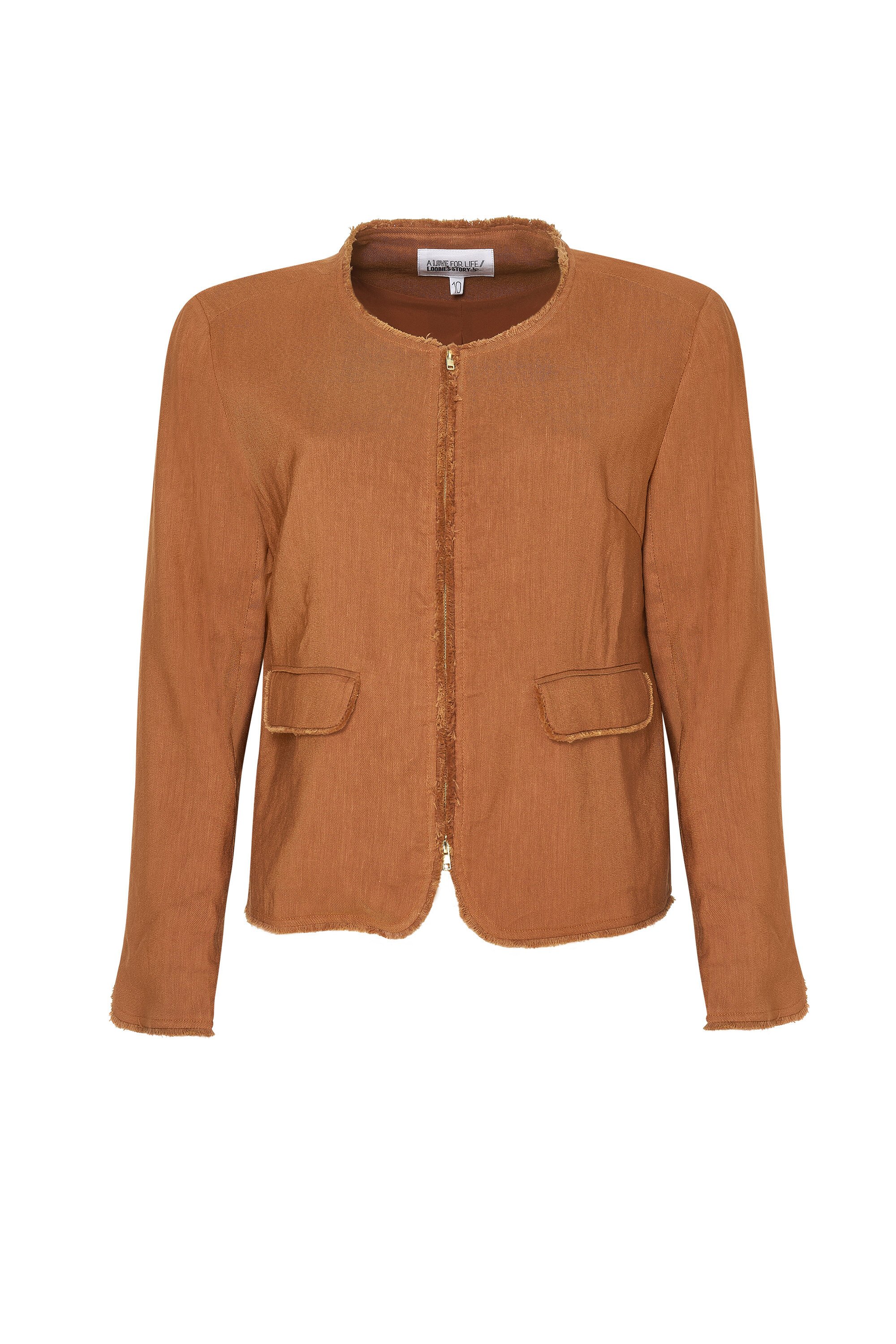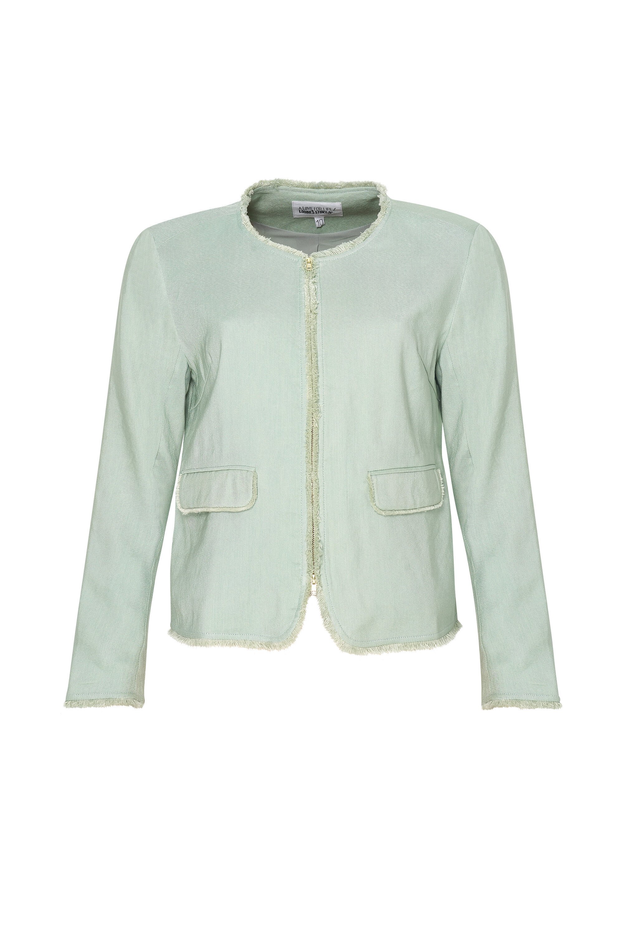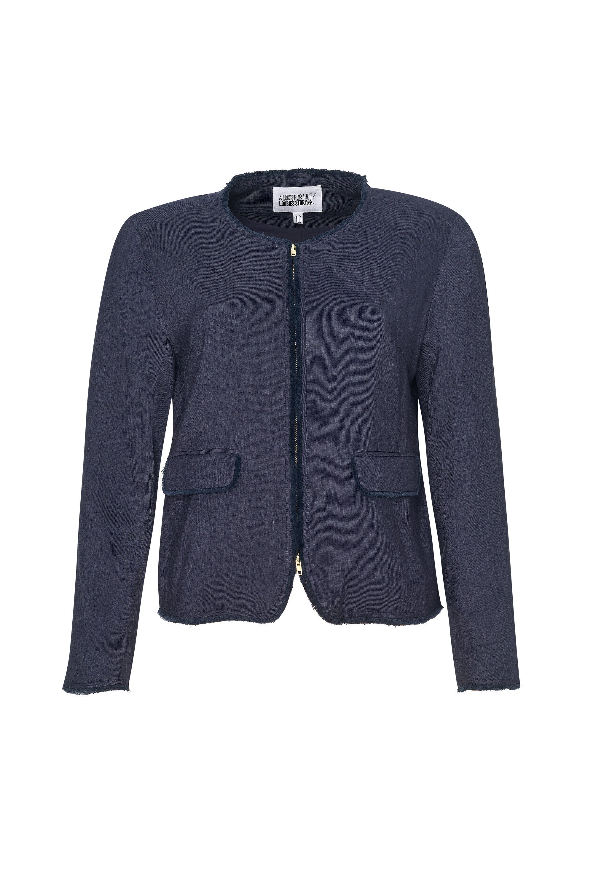 Classic crew neck tailored jacket in soft stretch twill with fine fray trimming. Both the main and lining fabric are woven stretch fabrications, so this jacket will mould to your body and move with you.
