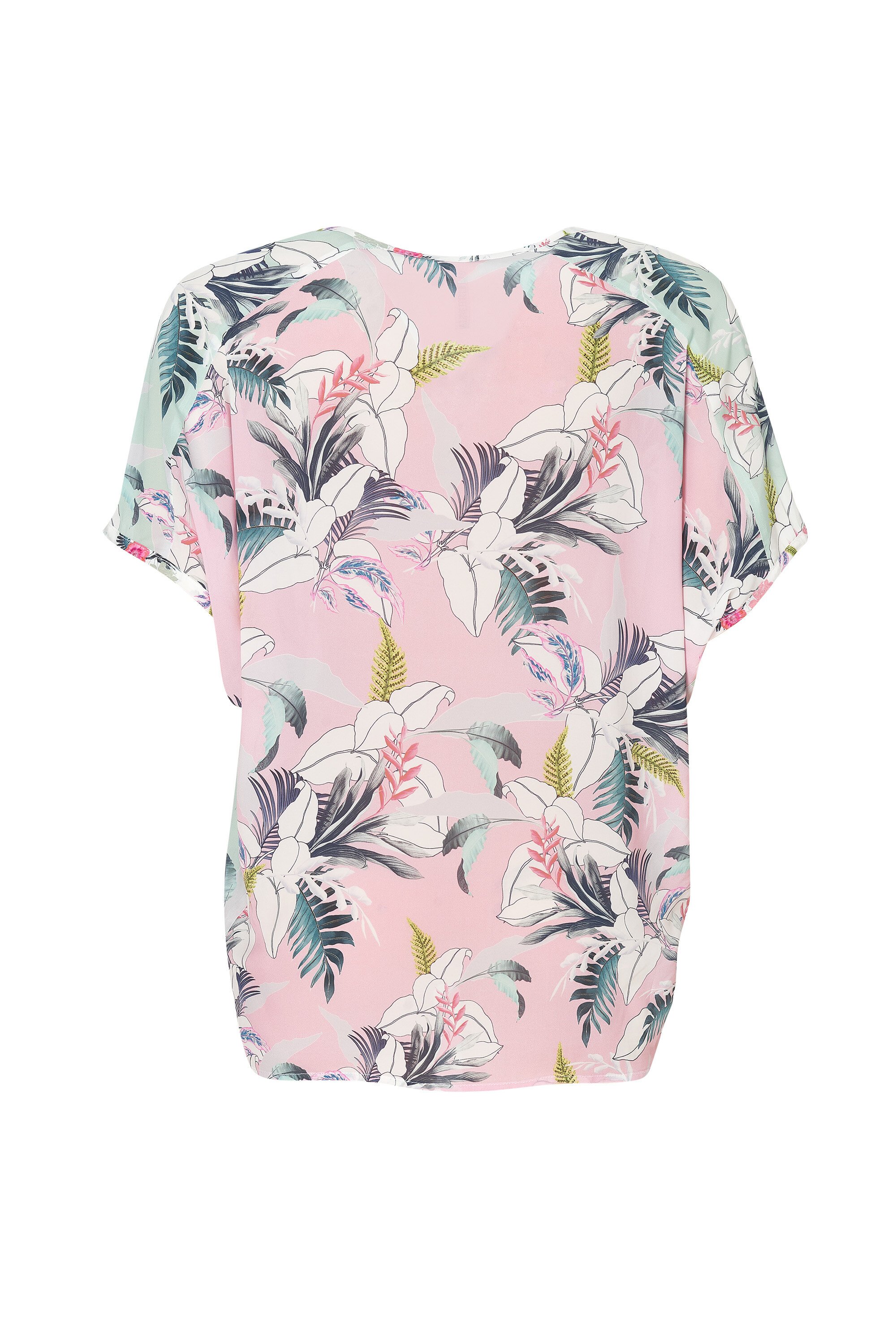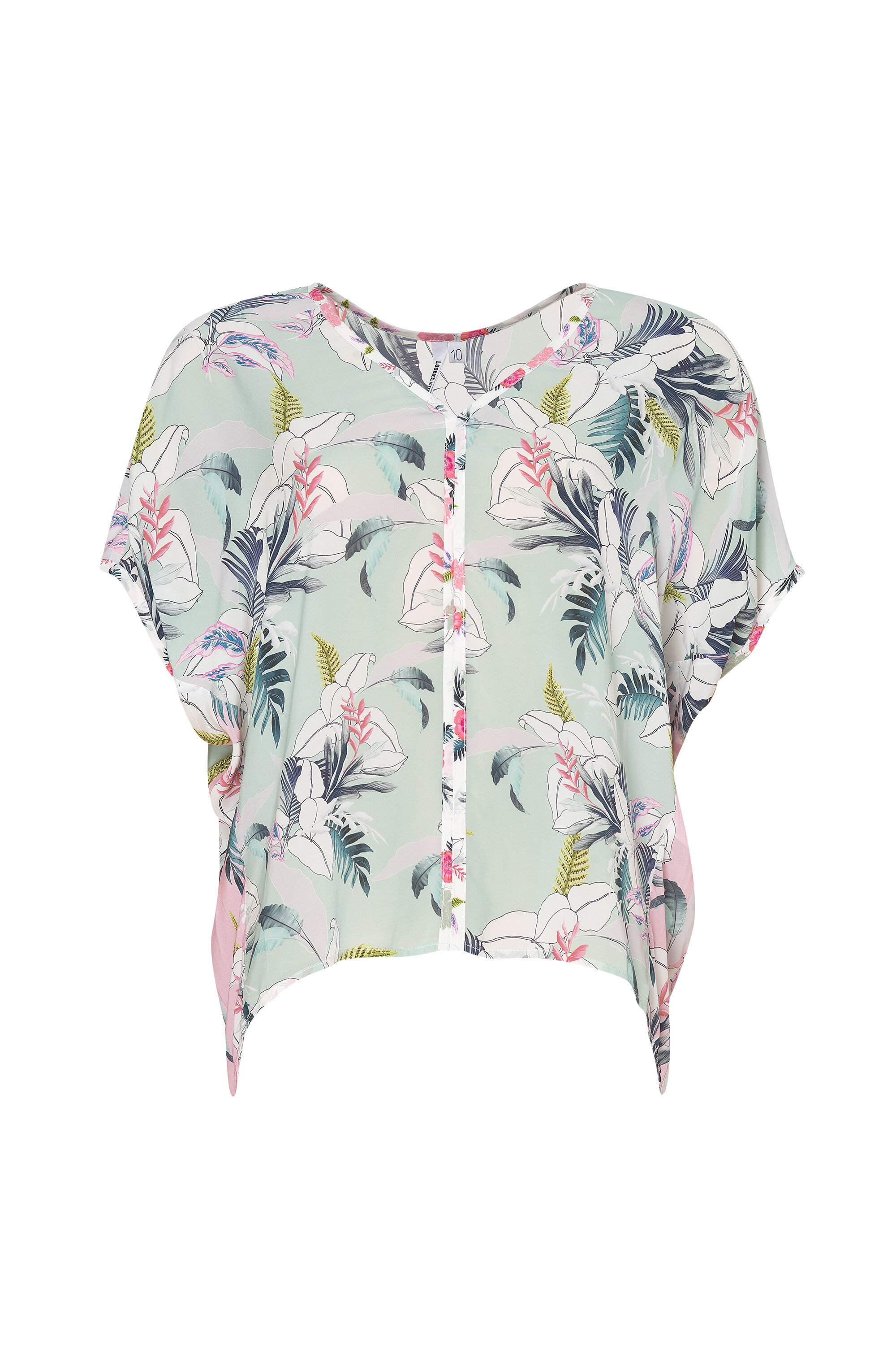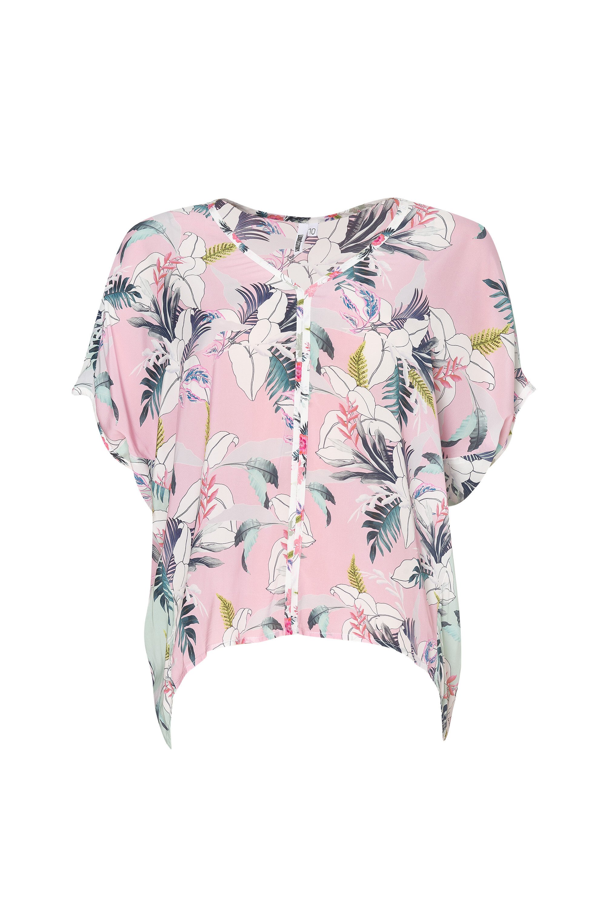 Batwing style top creating a cocoon shape when on the body. Soft contrasting print on the back panel.