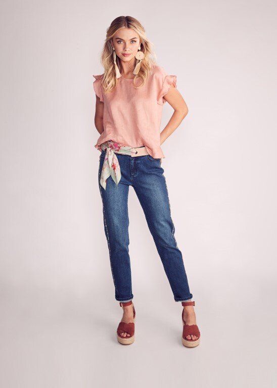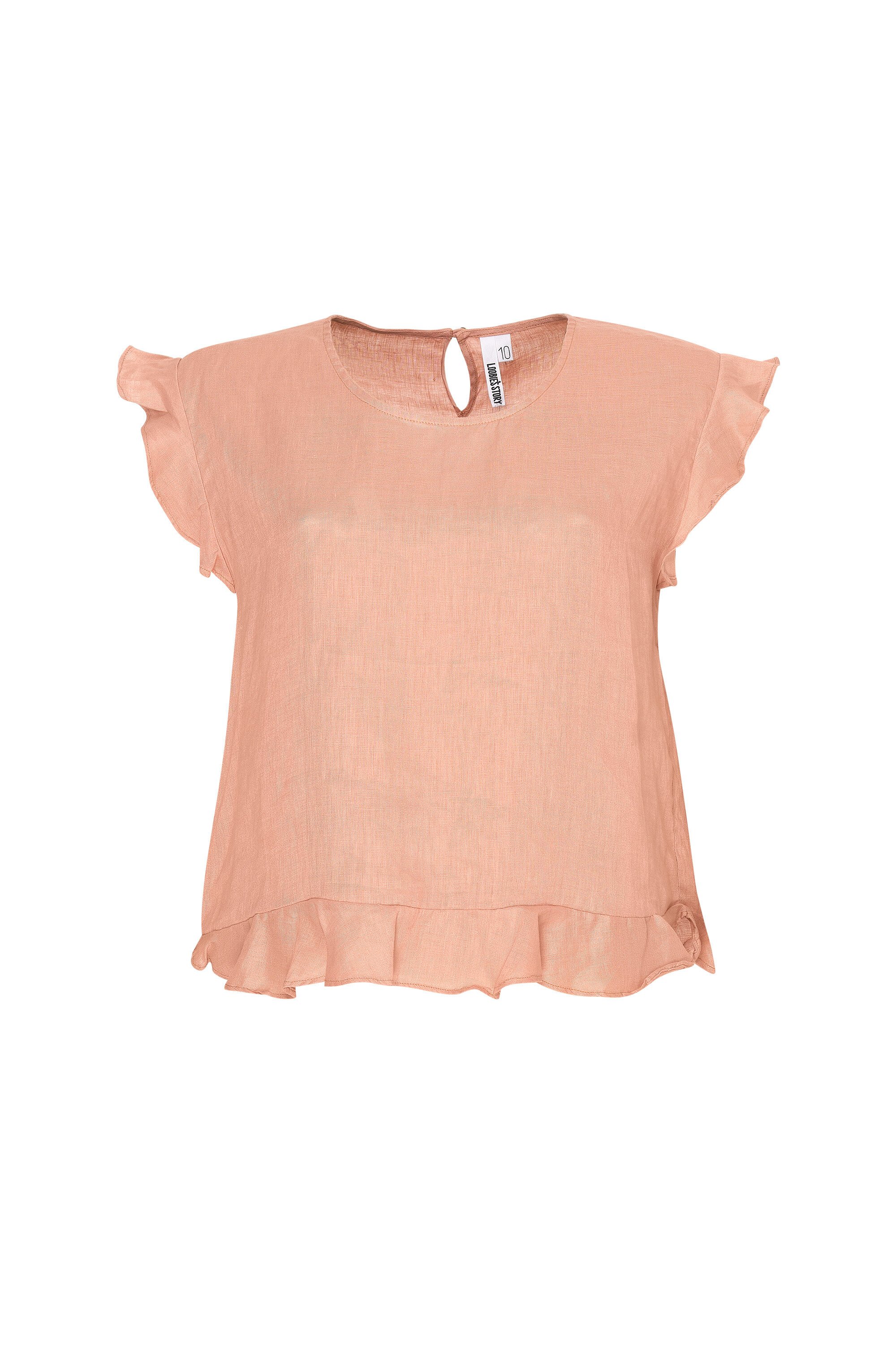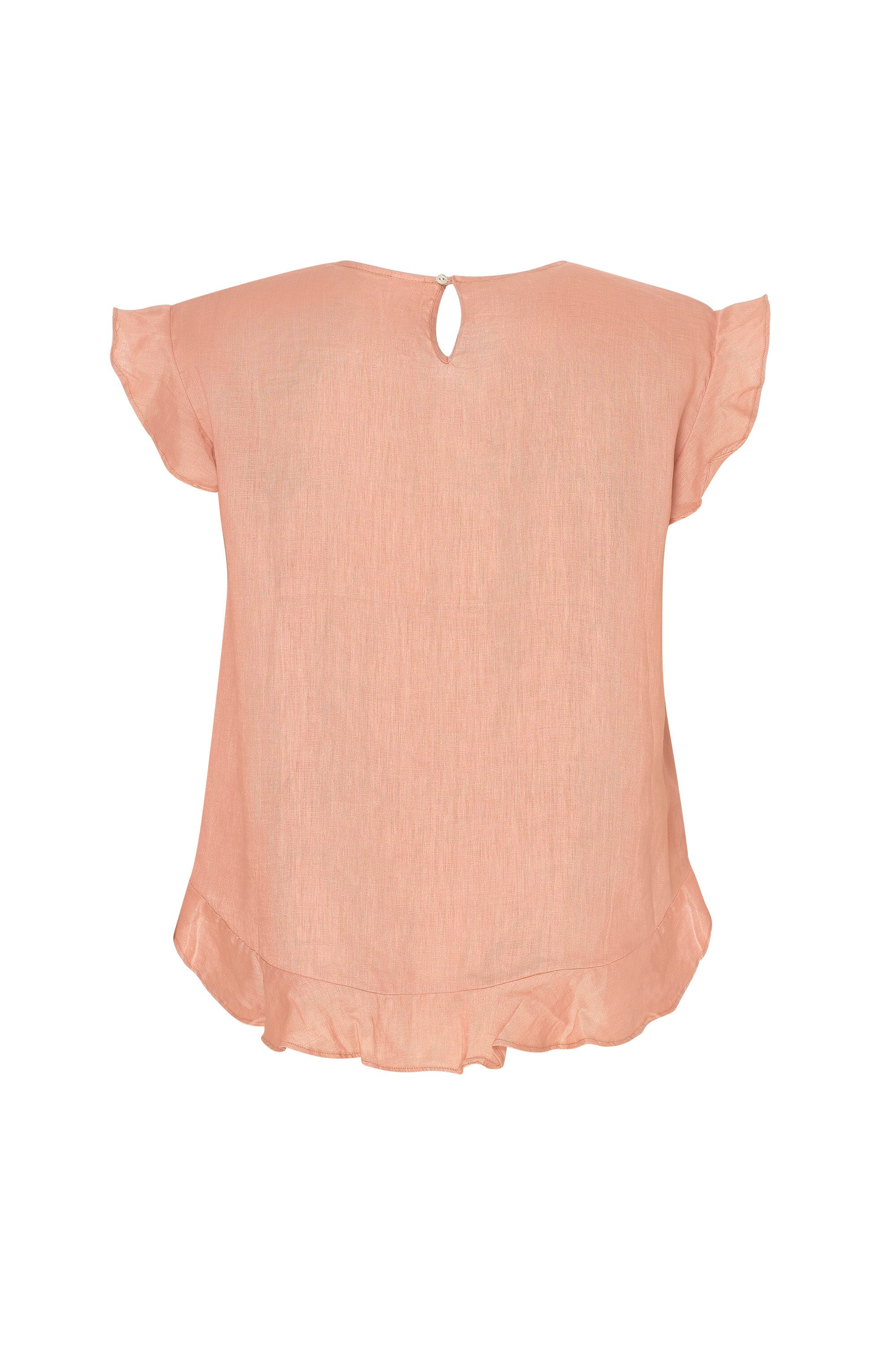 Tank style linen top with a soft cap sleeve and hem flounce. Slightly shaped hemline with a longer back length than front.