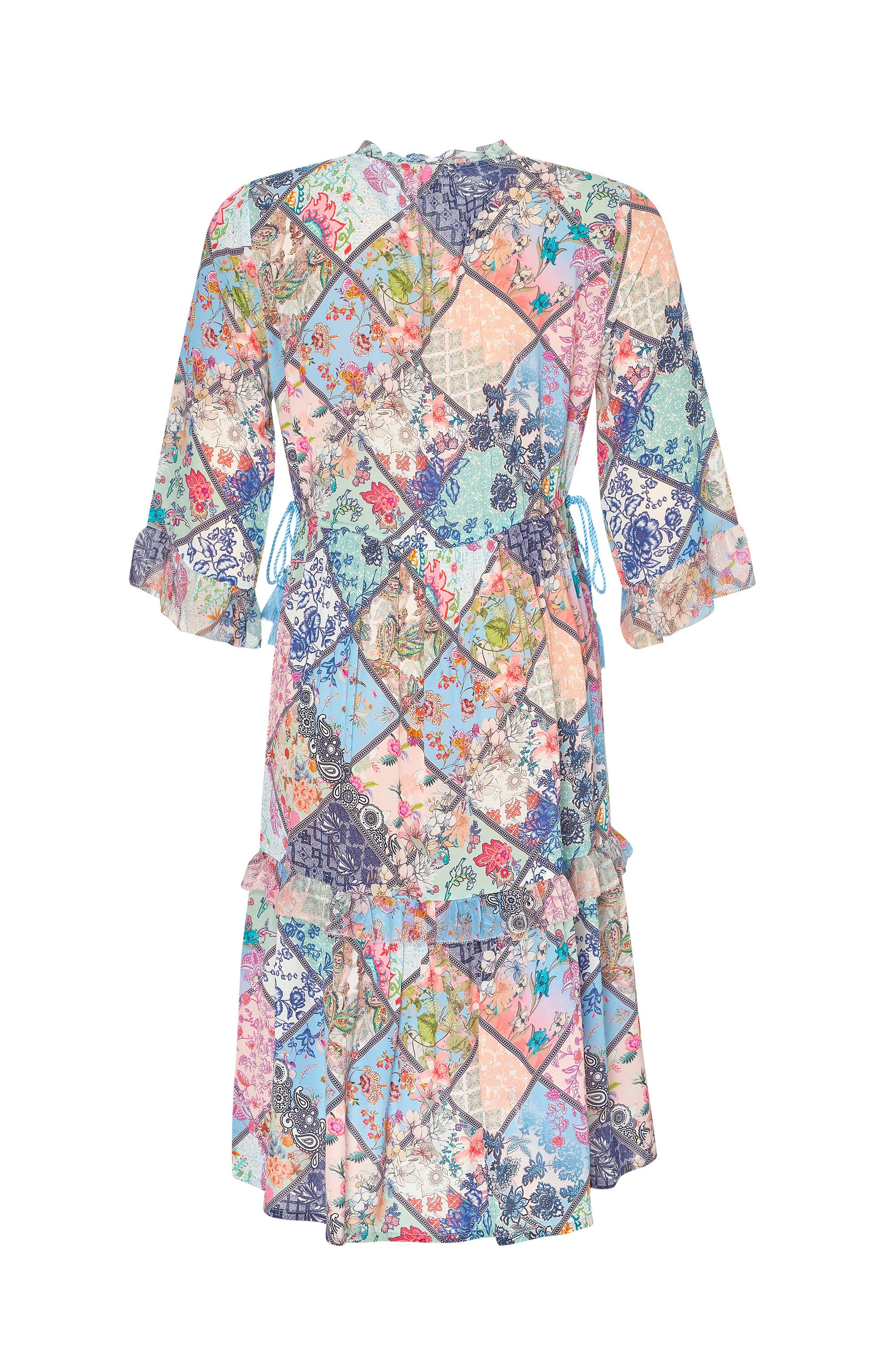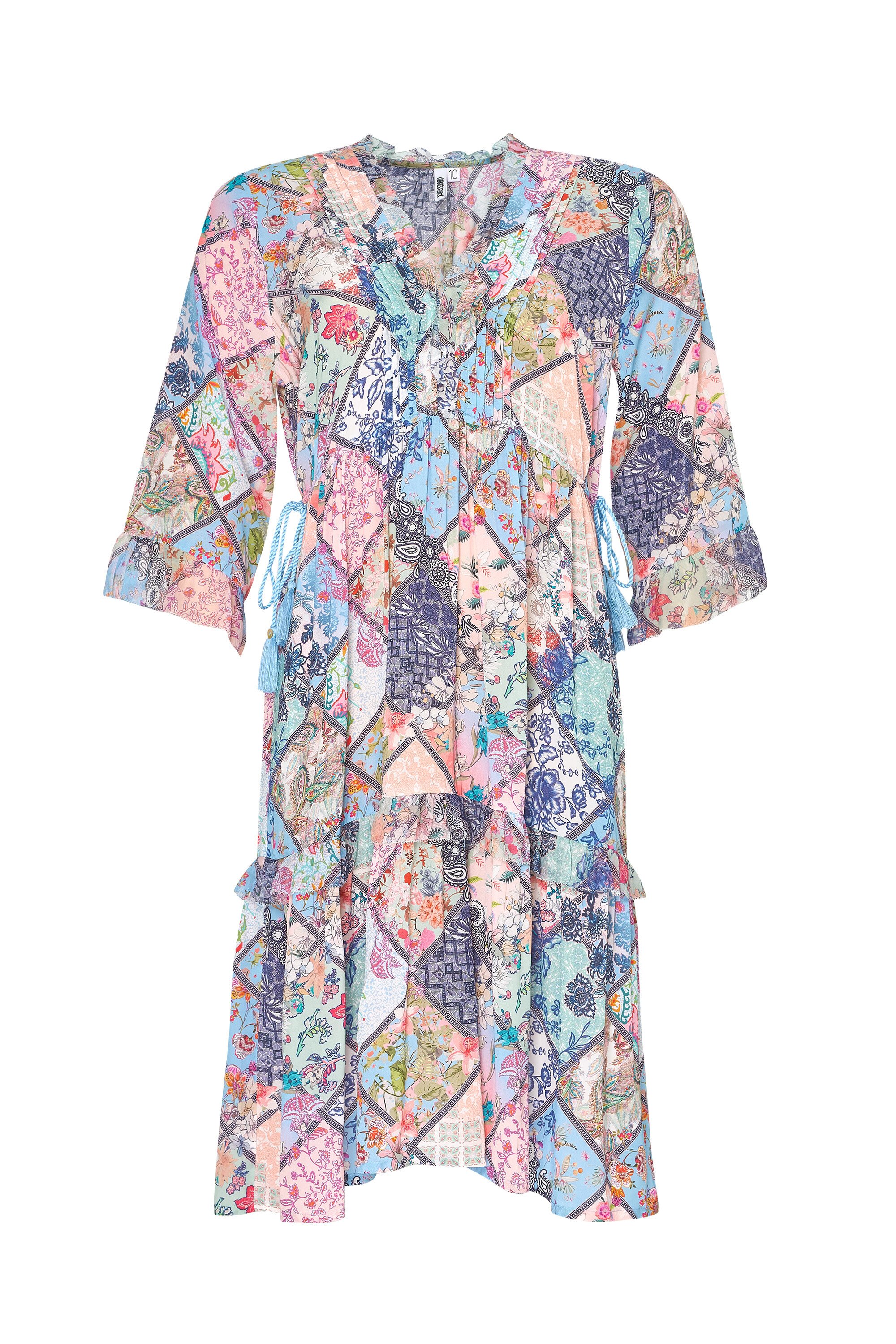 A fun and flirty dress with an elbow length sleeve and tiers to the knee. Under bust drawstring detail allows for more shape if desired.