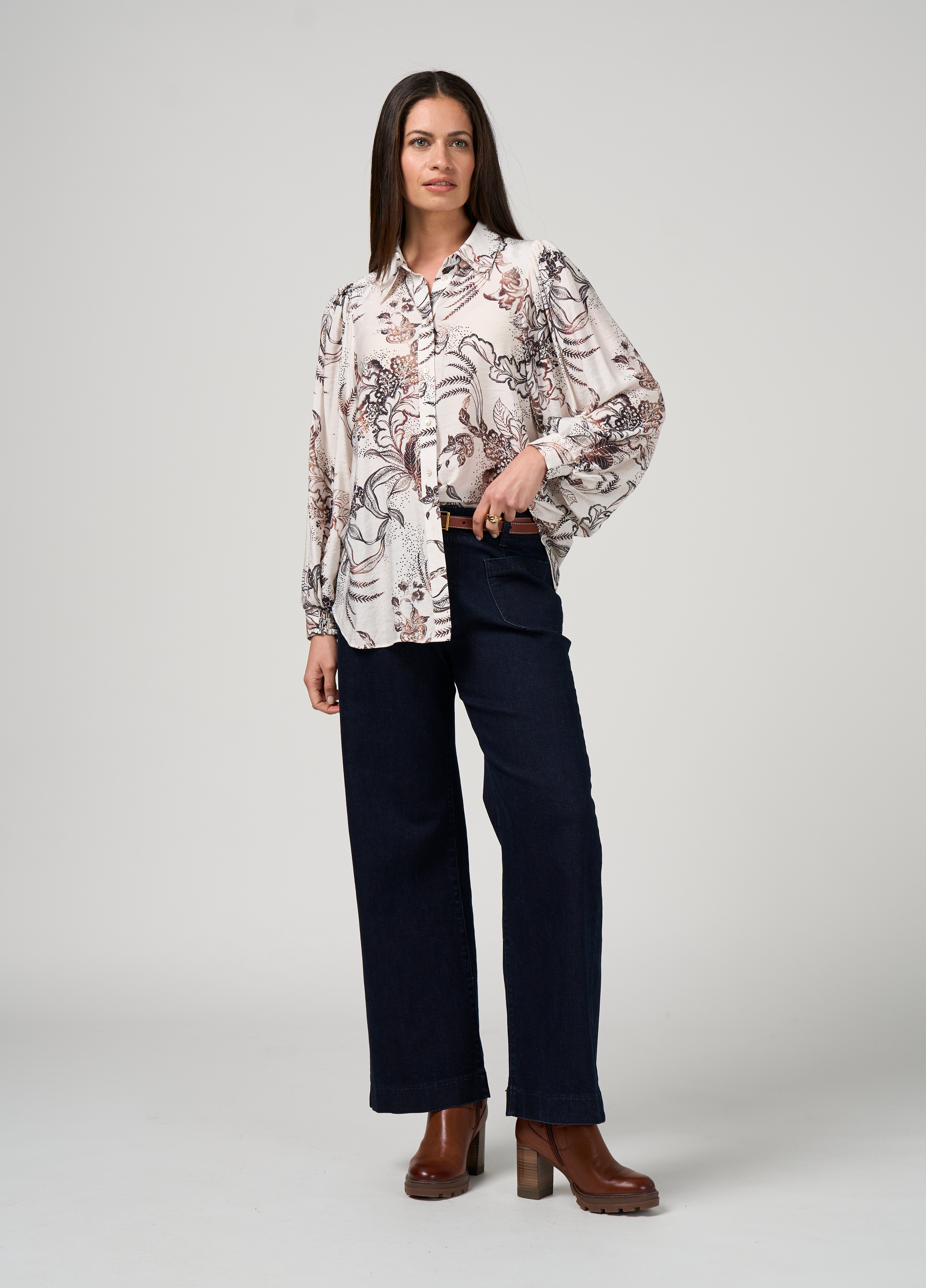 Floaty button-through blouse with a classic shirt collar and a curved tail hemline, with gathered lantern sleeves and half-shirred cuffs.