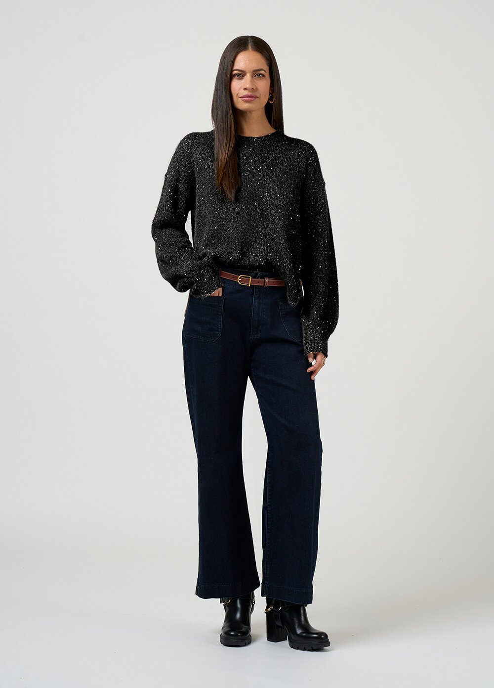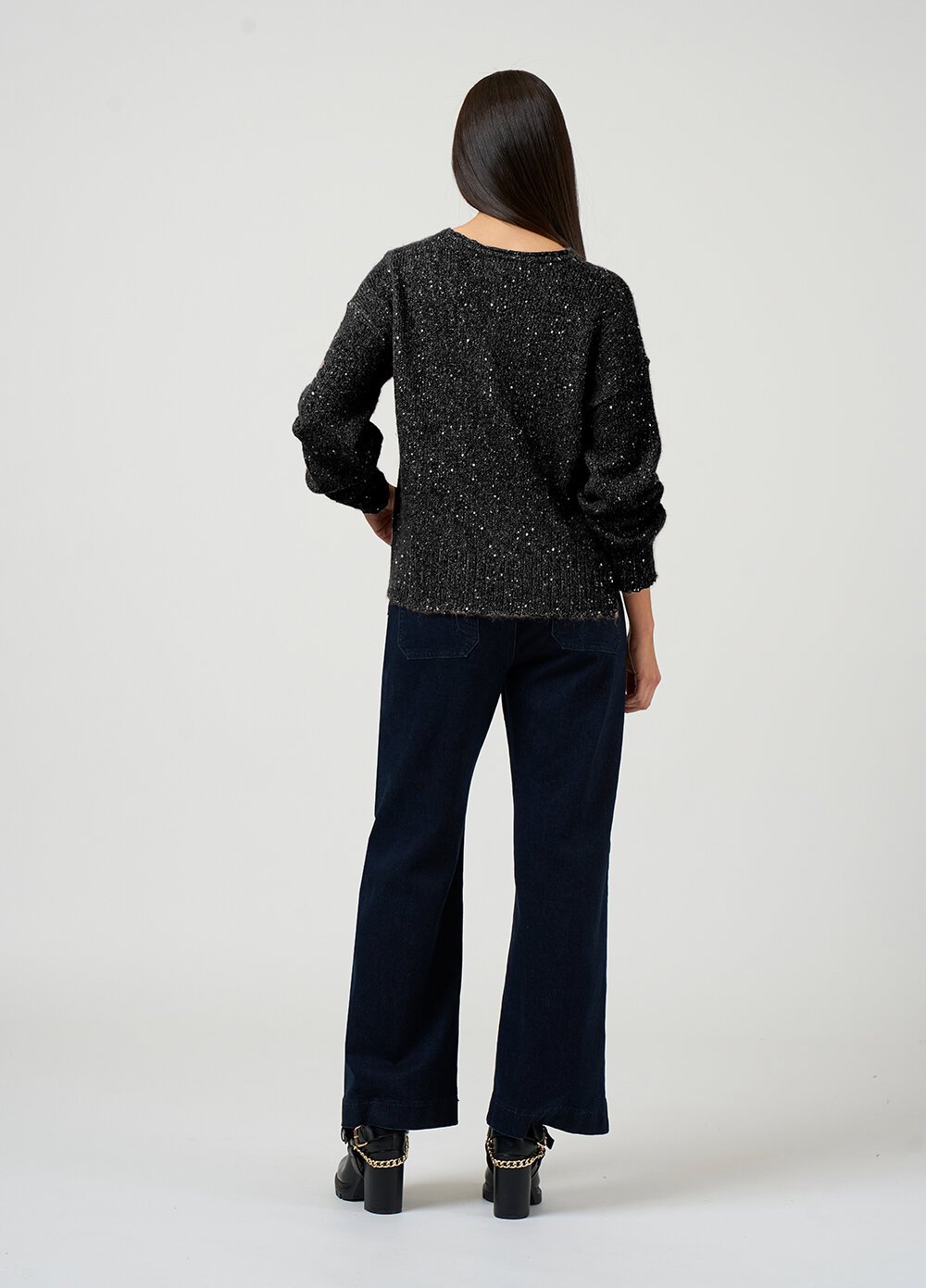 Crew neck cardigan in a soft alpaca–merino blend, featuring subtle sequin sparkle, and finished with a colour-matched dome placket for a refined touch.