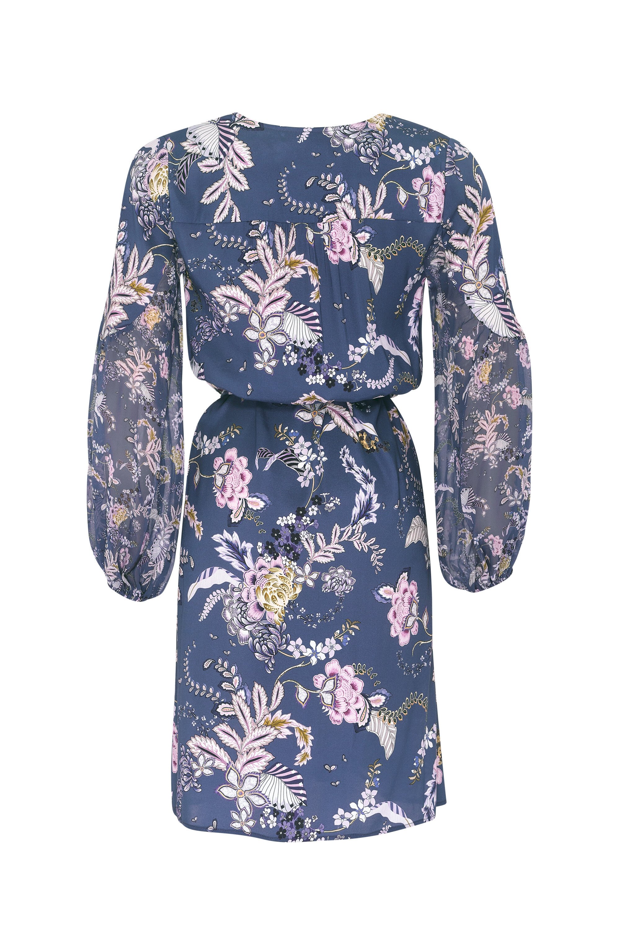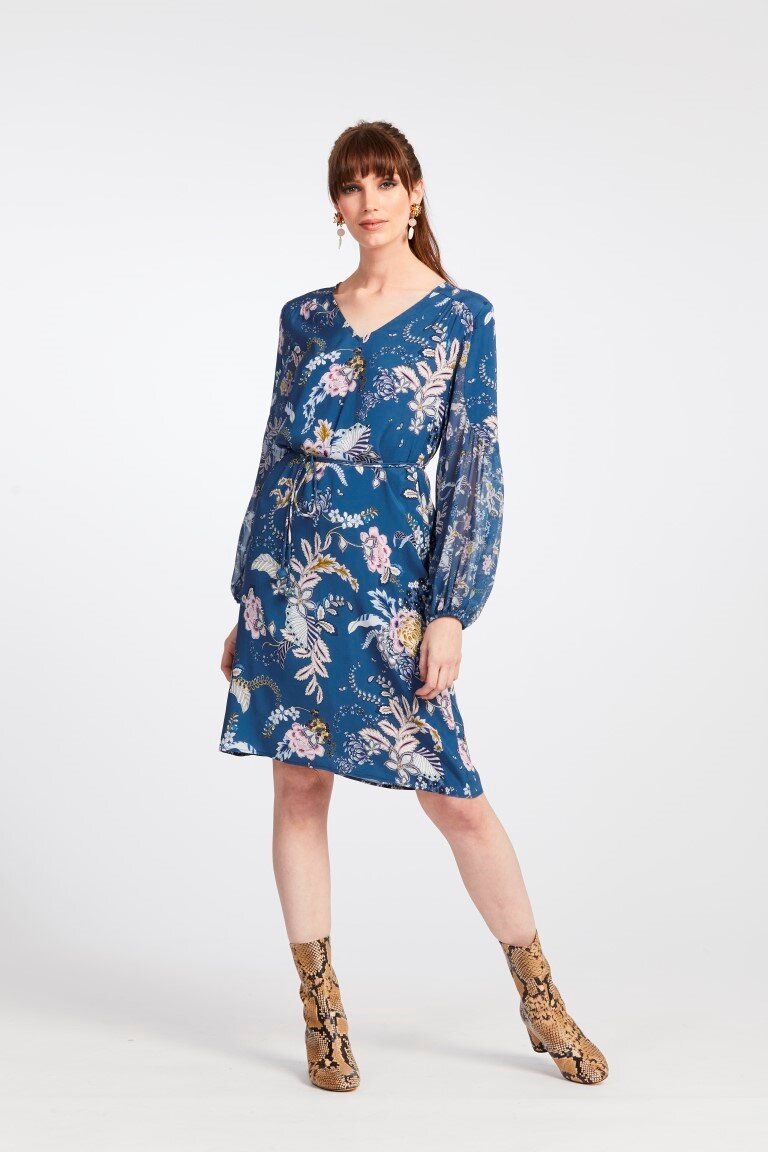 Stretch silk v-neck dress with separate tie for waist, a georgette sleeve that has stretch silk insert at shoulder and soft gathers to an elasticated cuff.