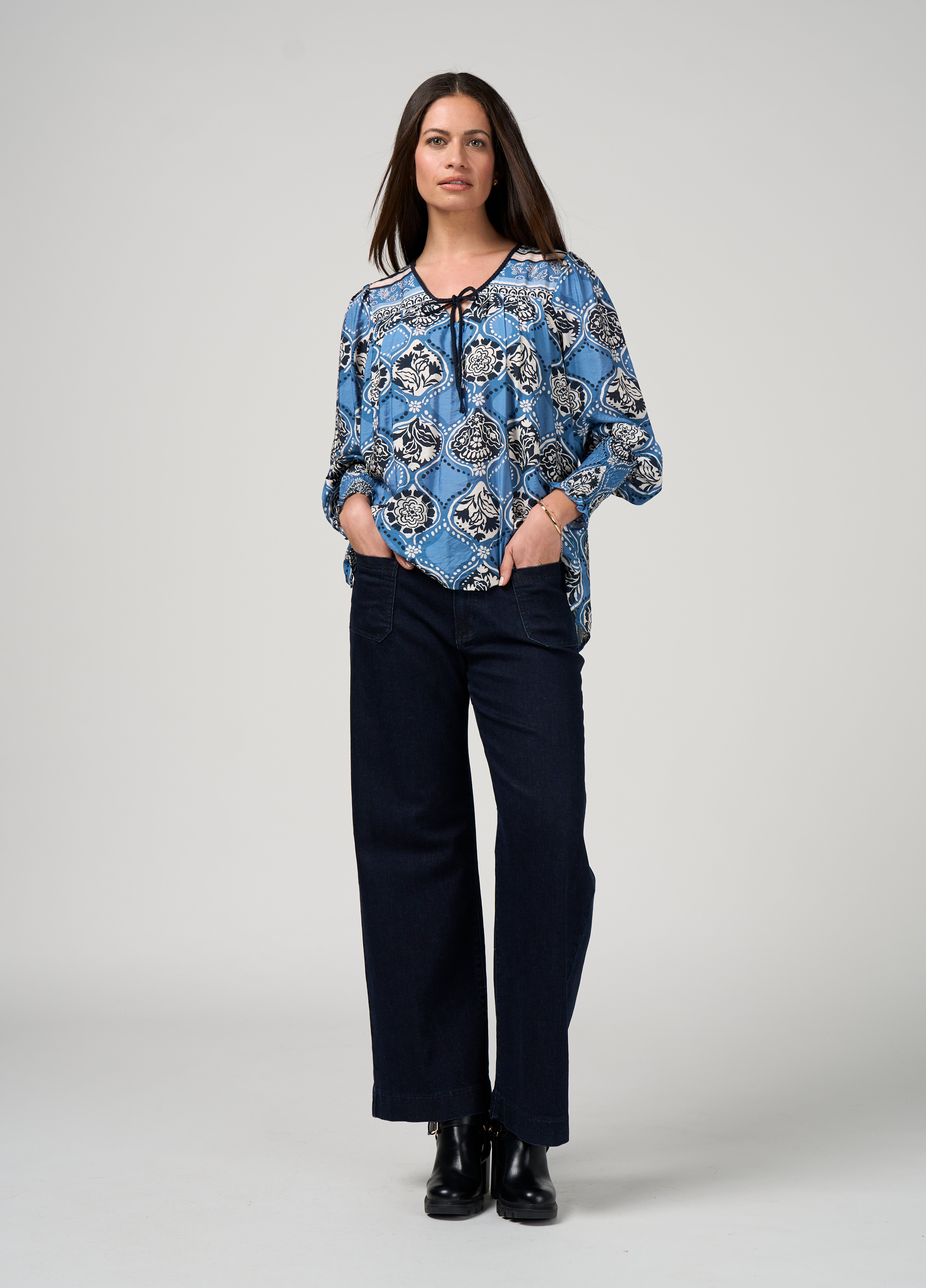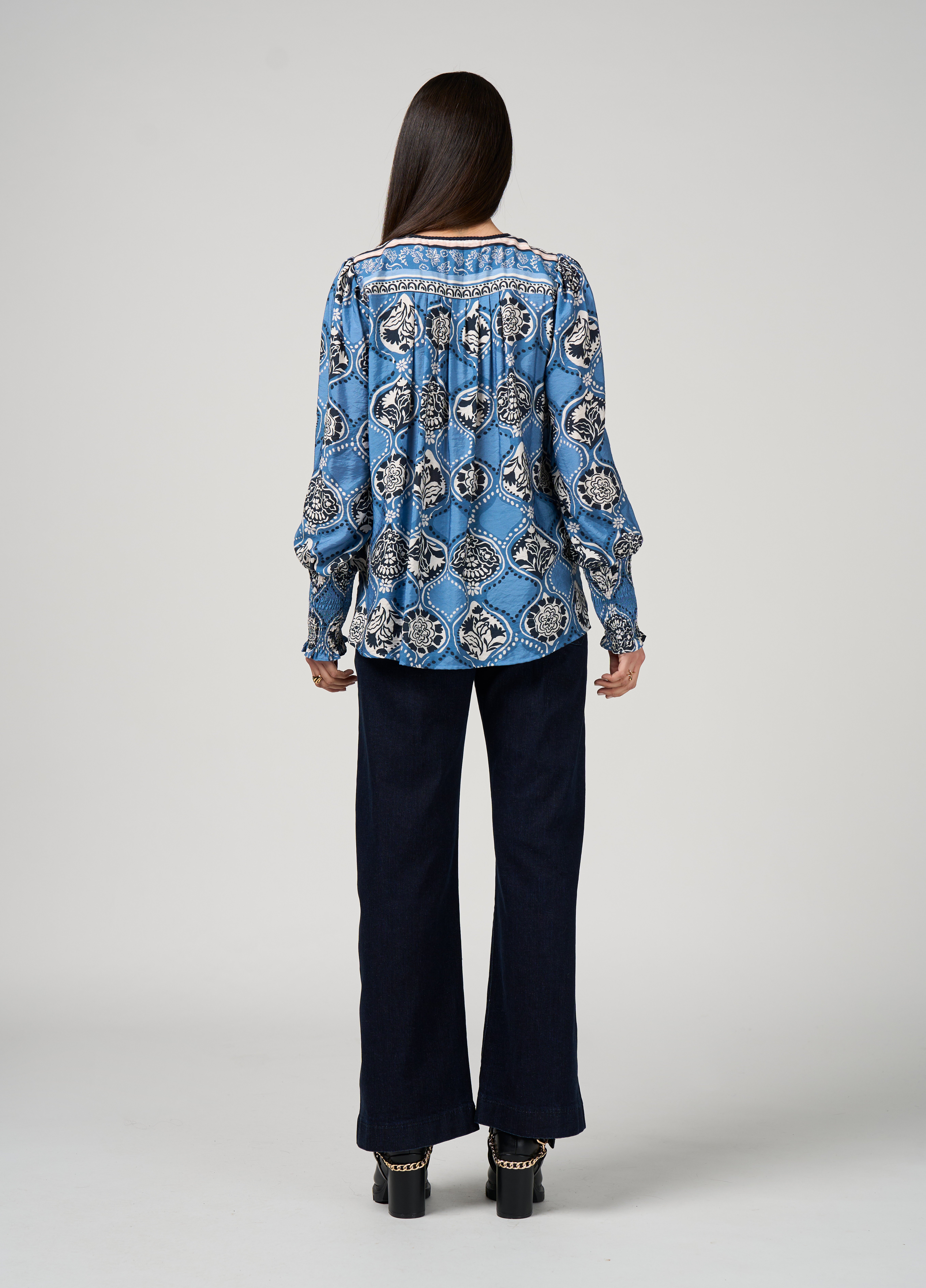 Floaty button-through blouse with a classic shirt collar and a curved tail hemline, with gathered lantern sleeves and half-shirred cuffs.