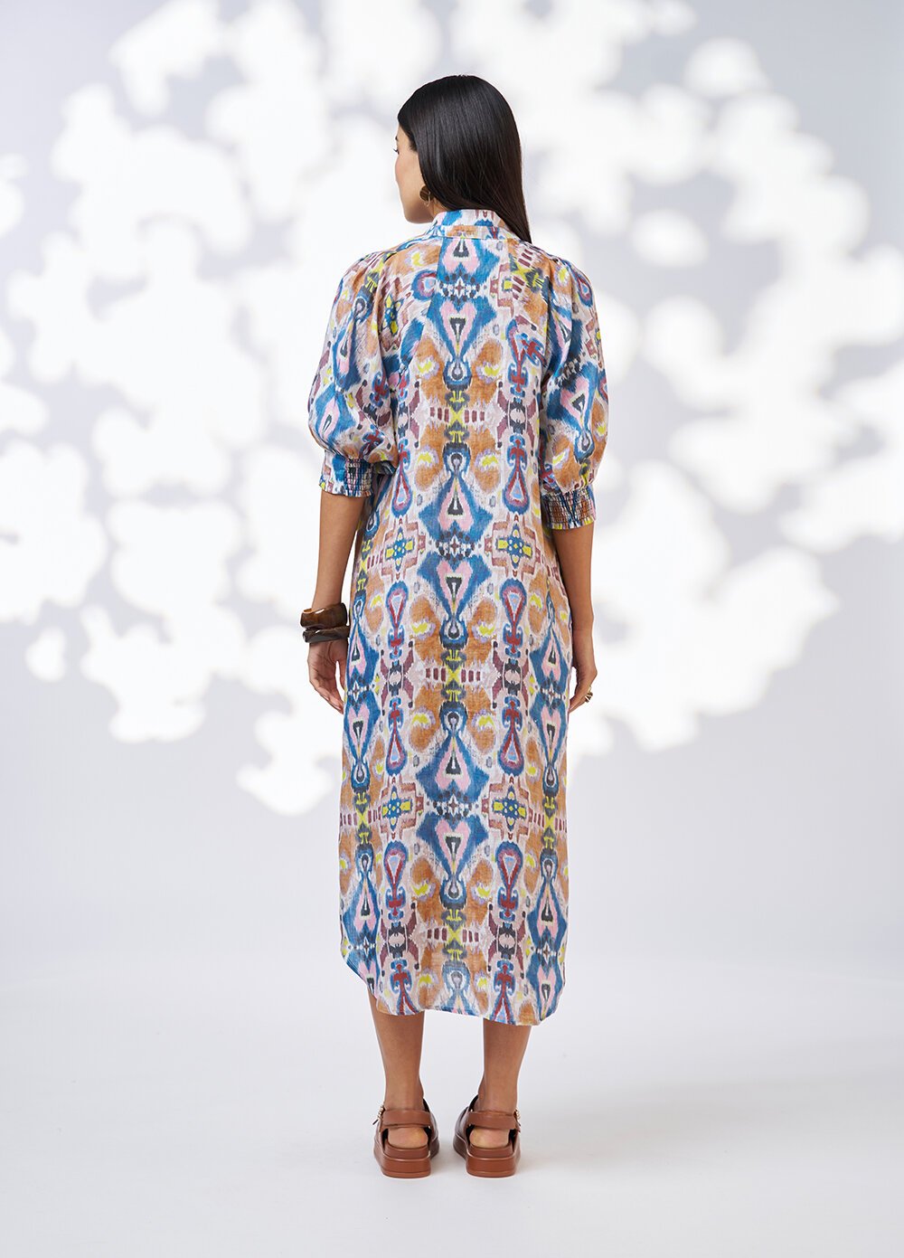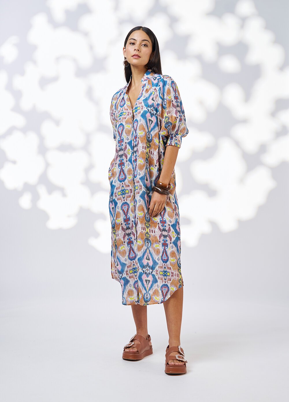 Printed shirt dress with a flattering collared neckline with tucks to create a V neck. Sleeves gather into half shirred cuffs, with side splits & in-seam pockets.