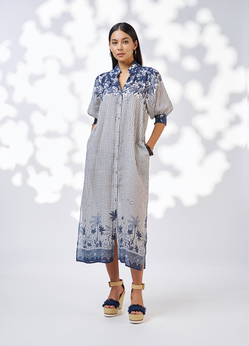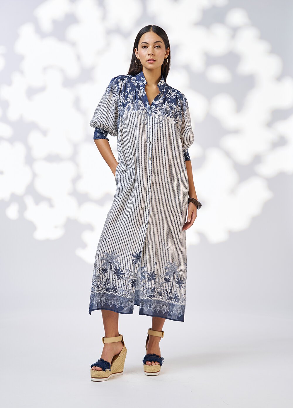 Button-through printed shirt dress with a flattering collared neckline with tucks at seams to create a V neck. Sleeves gather into half shirred cuffs. Featuring side splits and in-seam side pockets