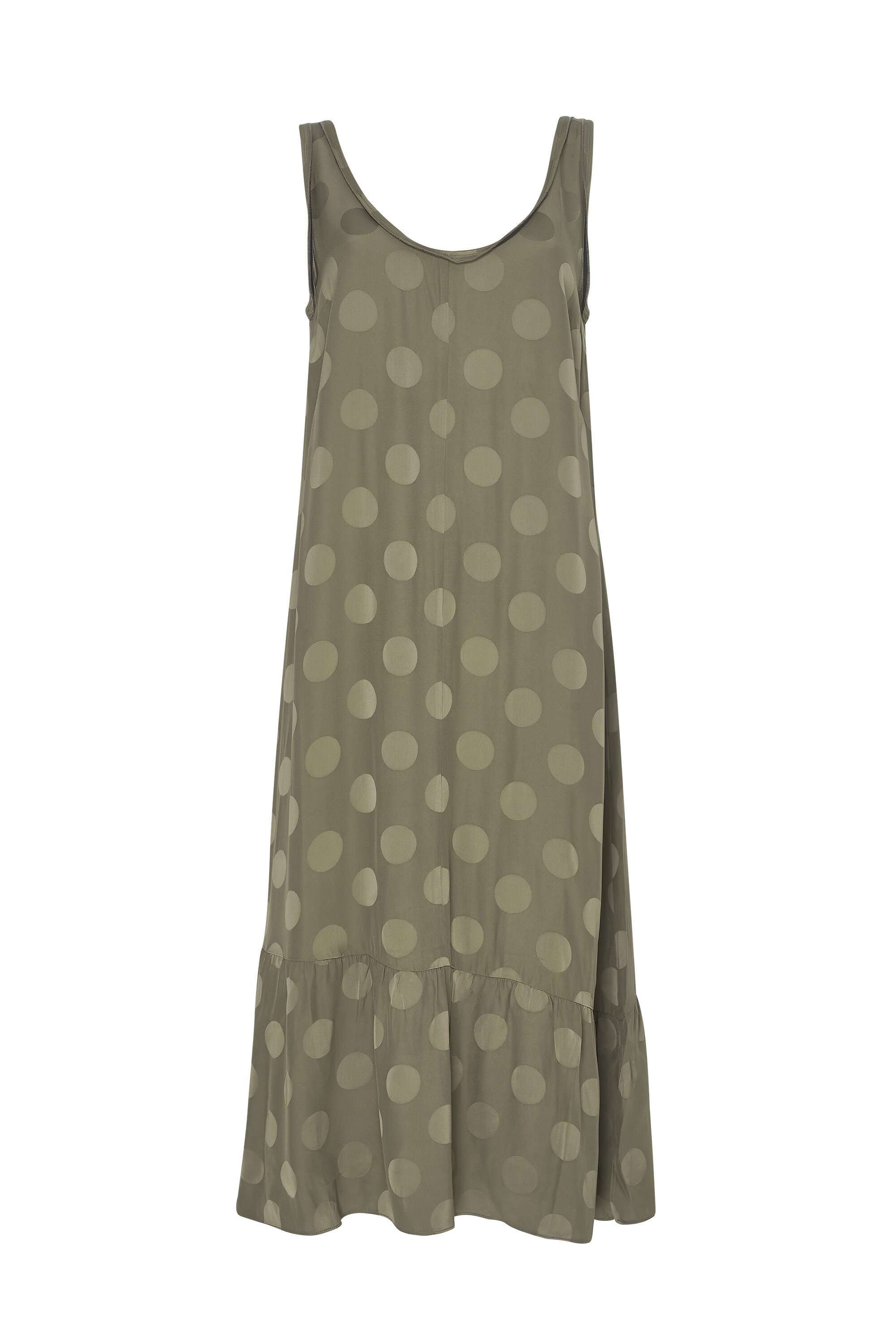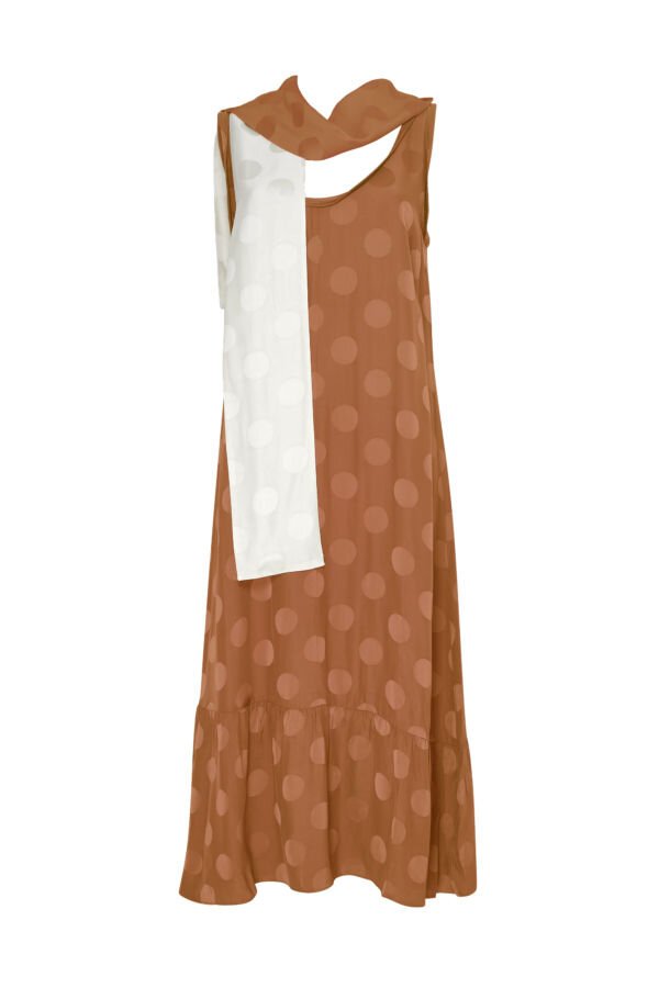 Sleeveless sun dress with large frill around hem. Feature two tone tie can be worn as a waist belt to create shape or as a scarf.