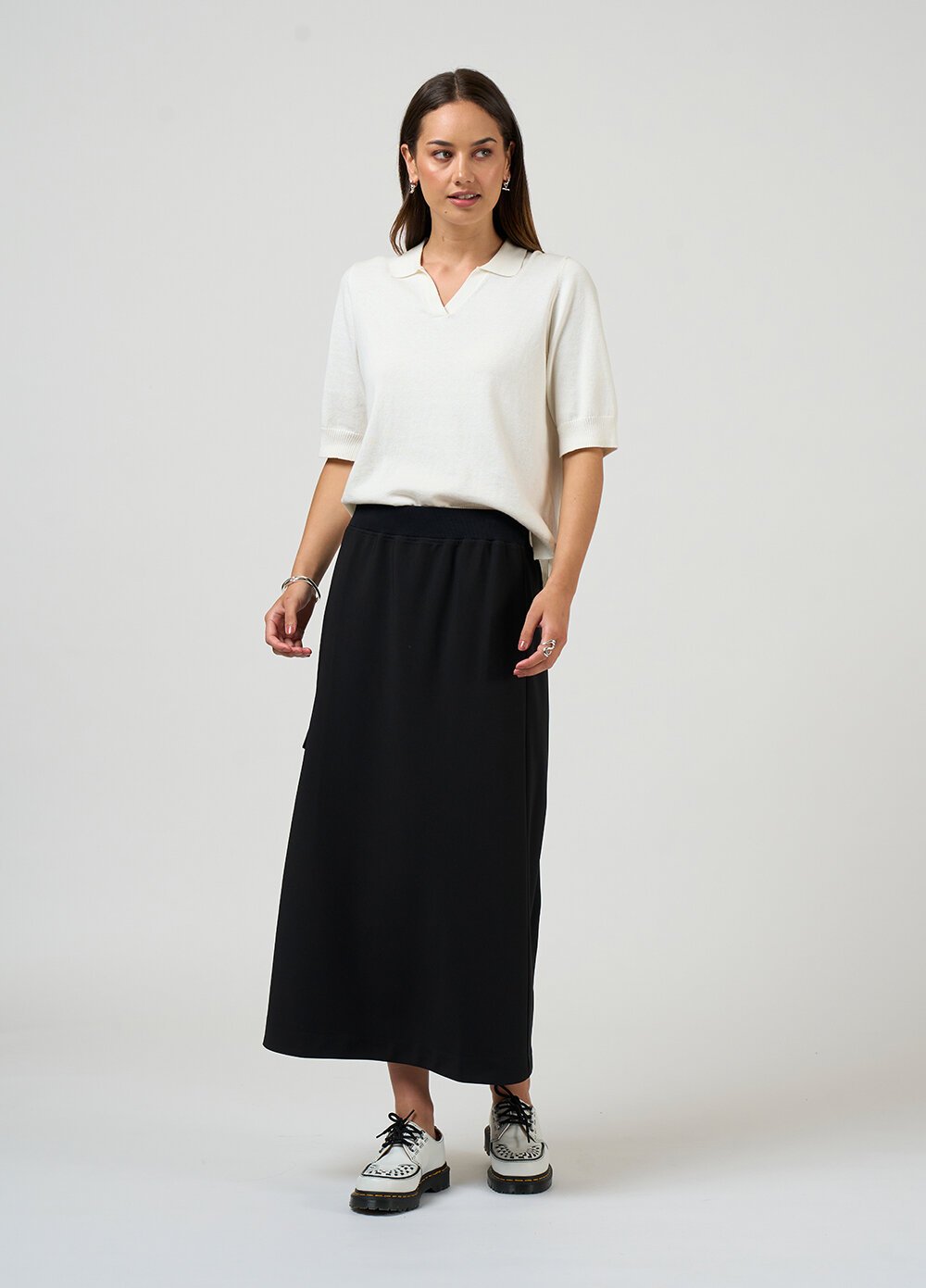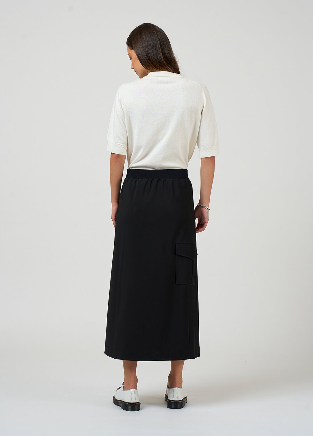 A-line bias cut skirt with a rib waist band, featuring a single style pocket with a top flap and cutaway corner detail.