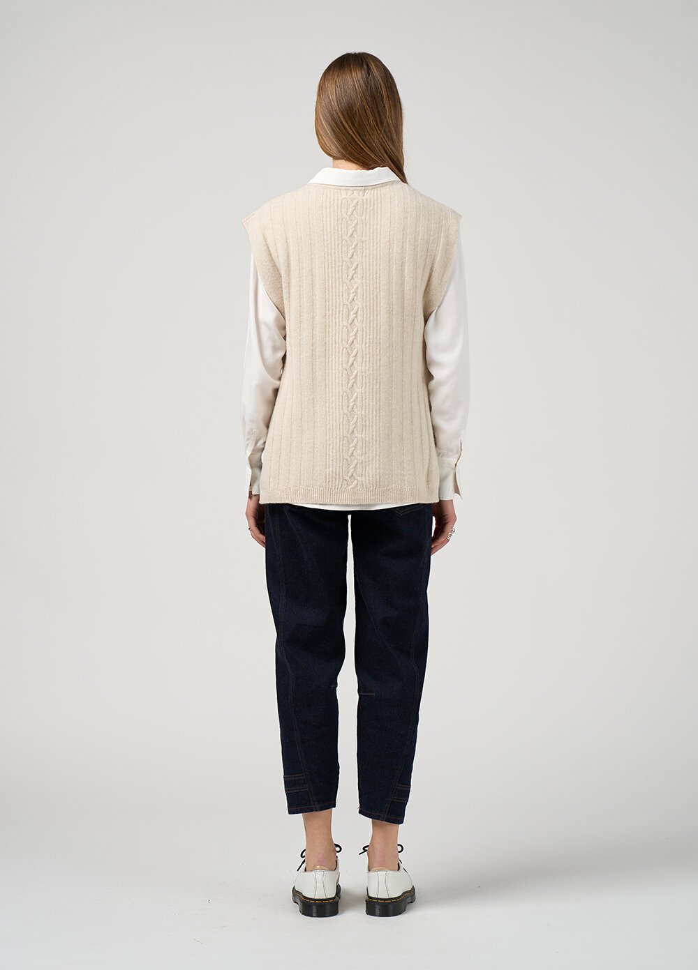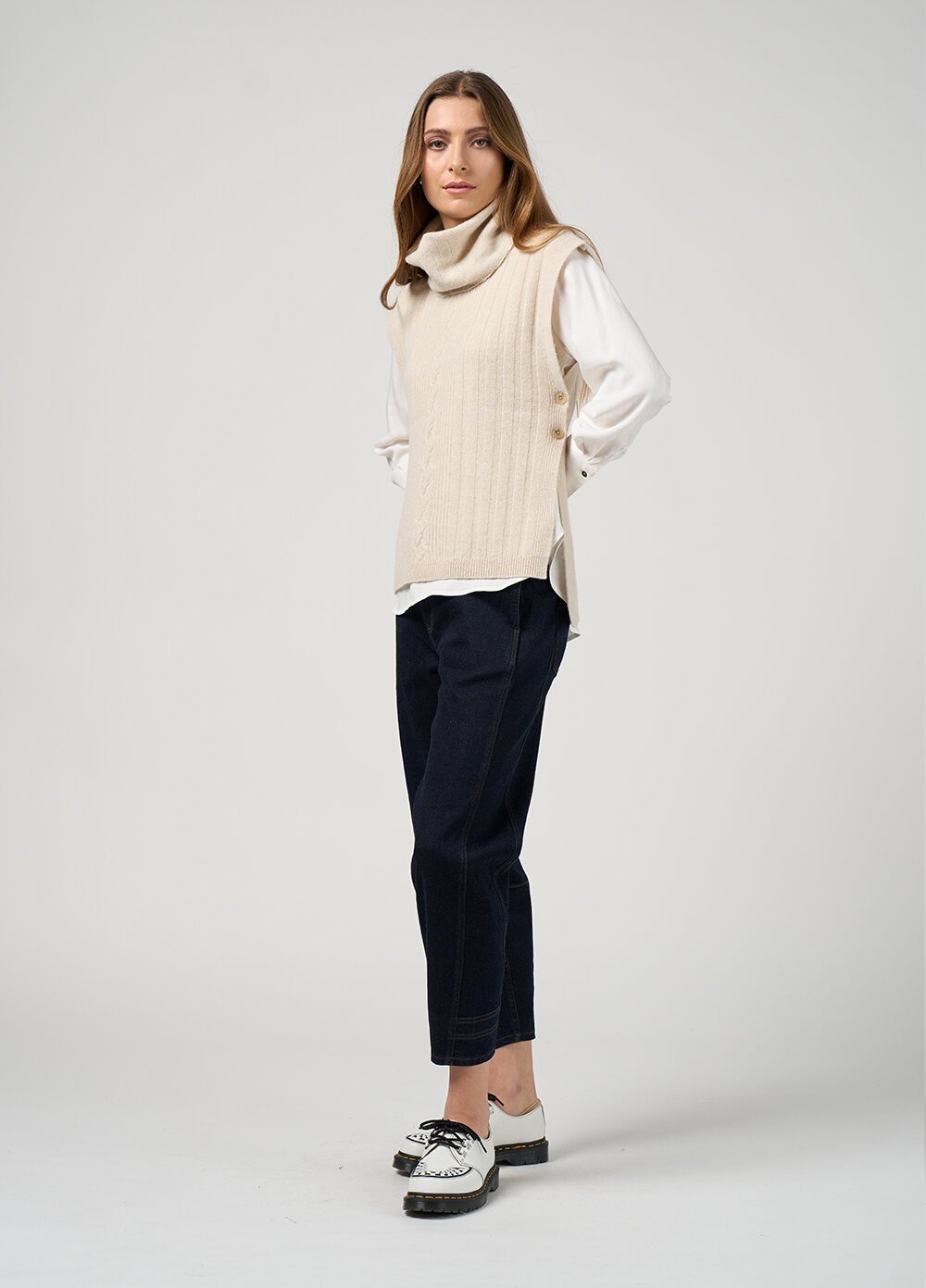 Tabard knit featuring a cable detail, with button closures at the side seams and a removeable neck piece for multiple styling options.