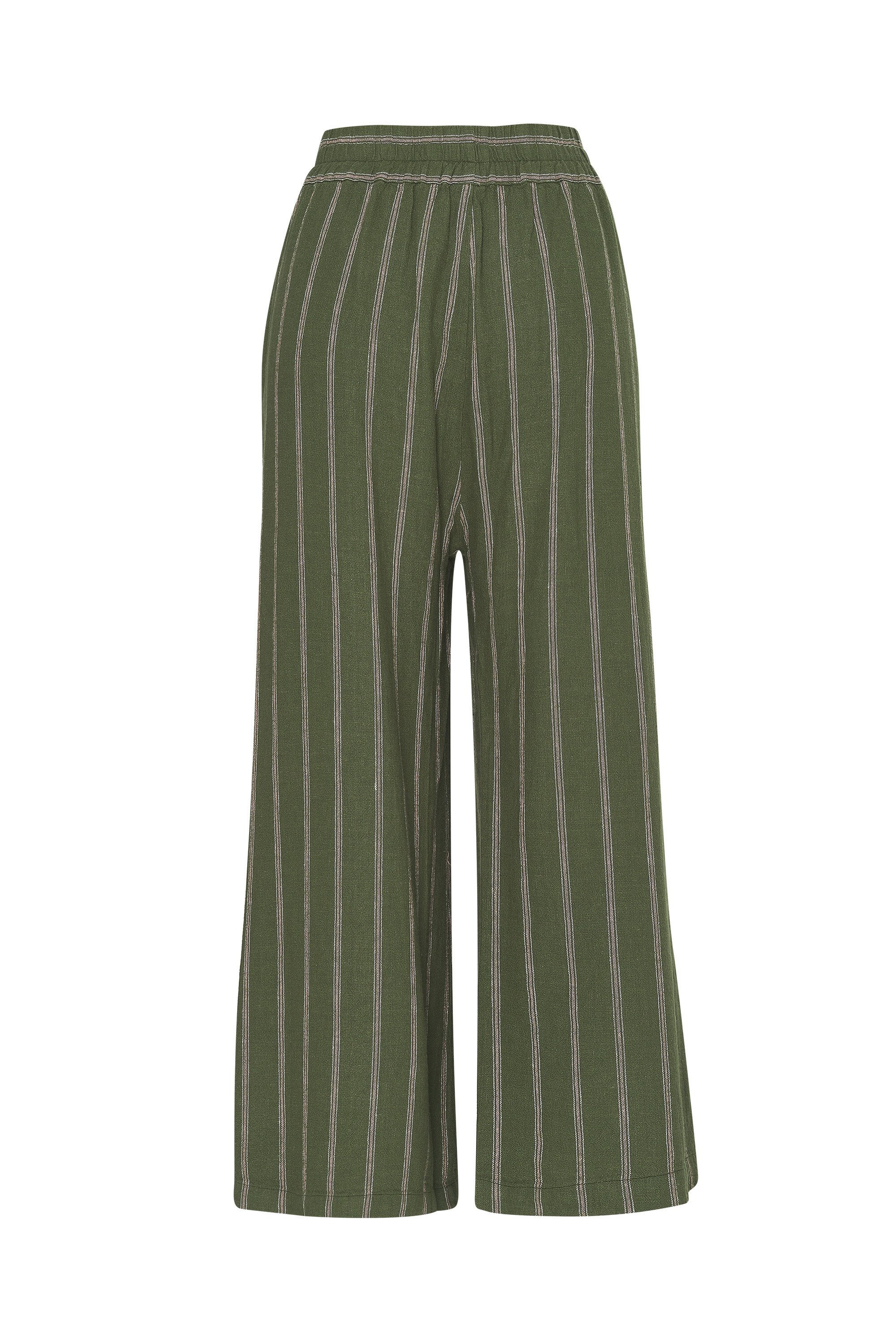 Linen mix loose fit pant with elasticated waistband, side front pockets and splits at hem on side. Contrast tape feature down side seam.