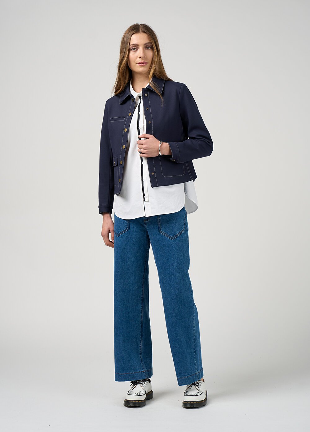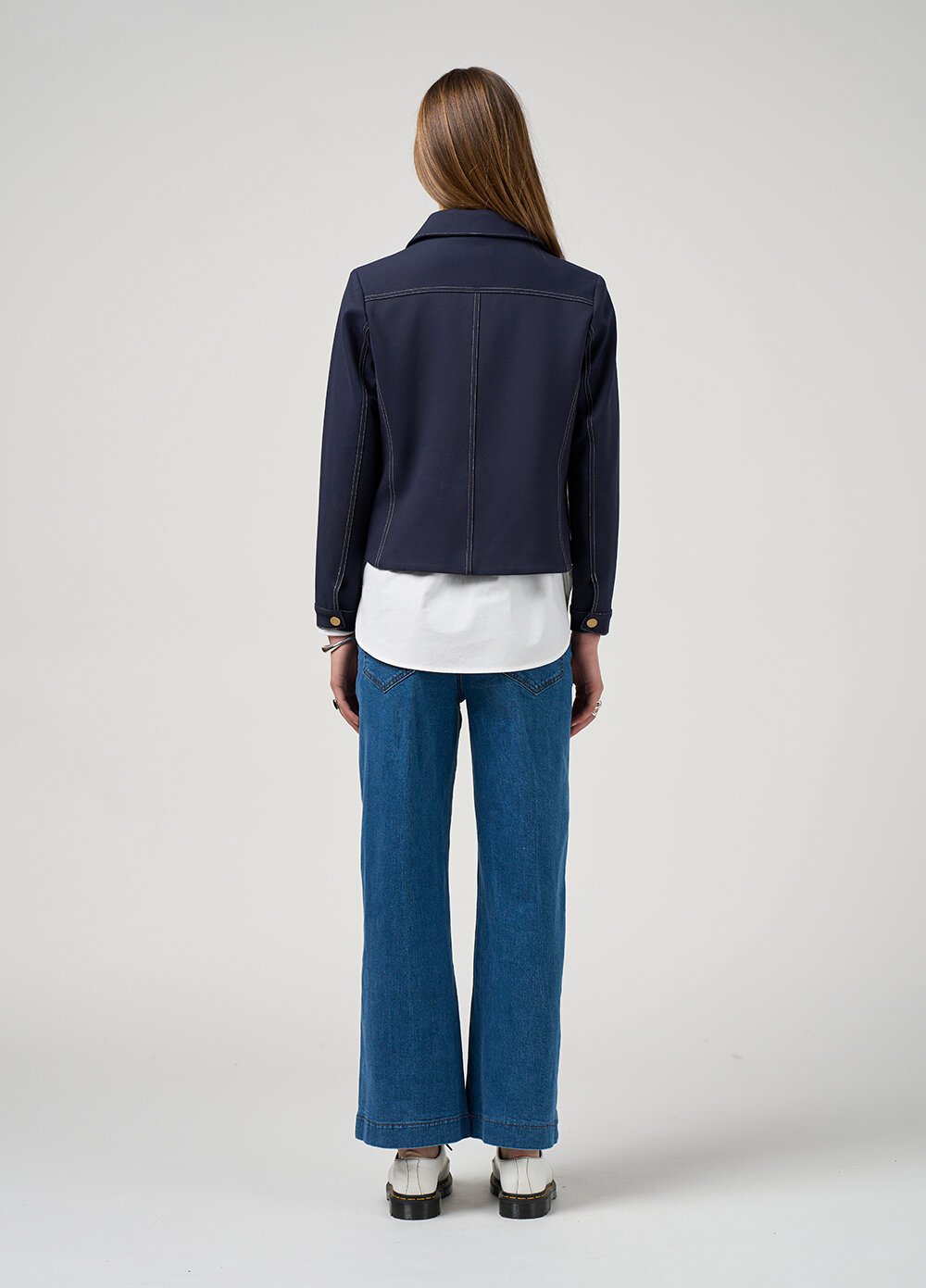 Slim fitting collared ponte jacket, with front pockets, featuring constrast stitching highlighting panel seams and pocket details.