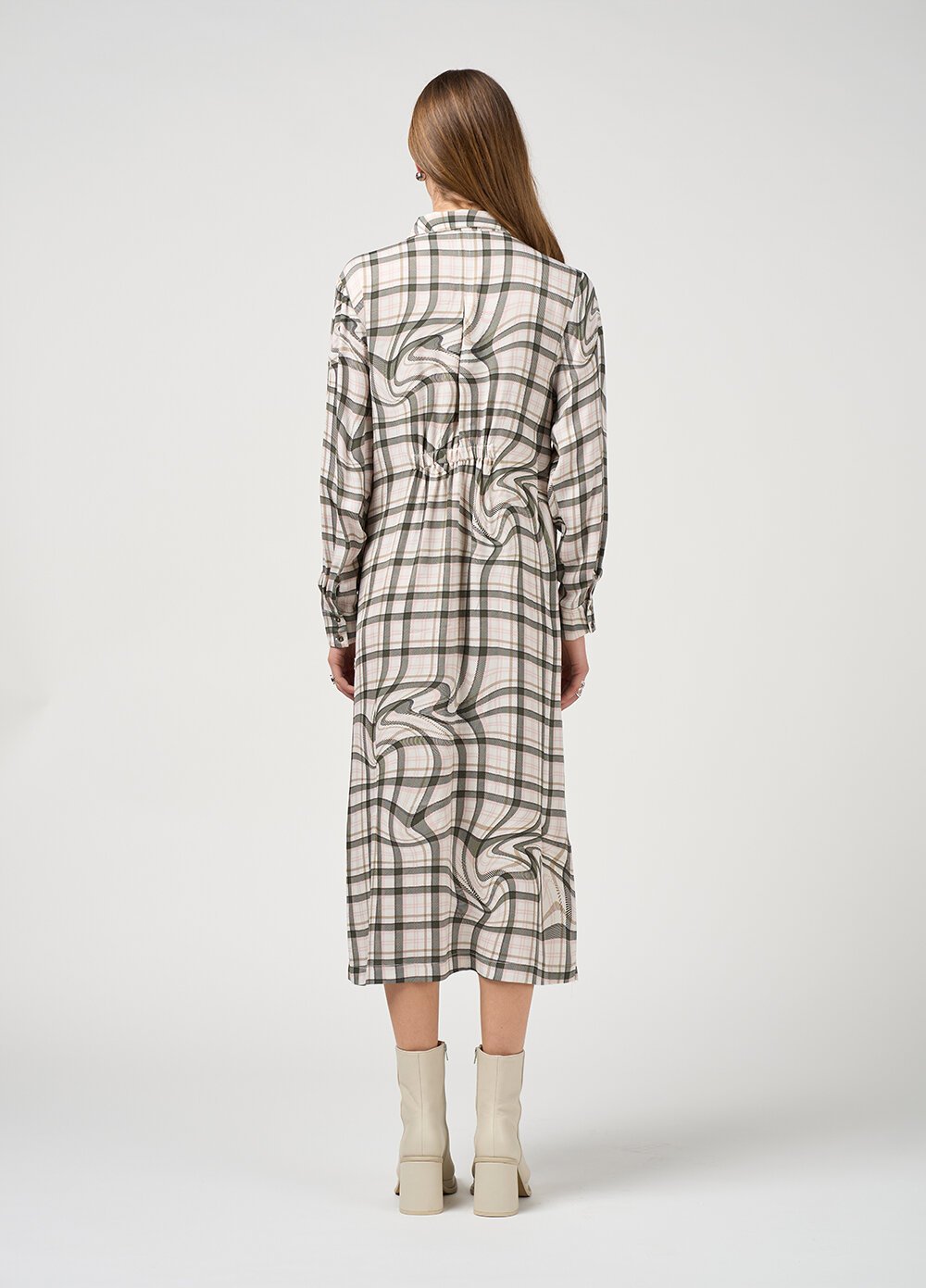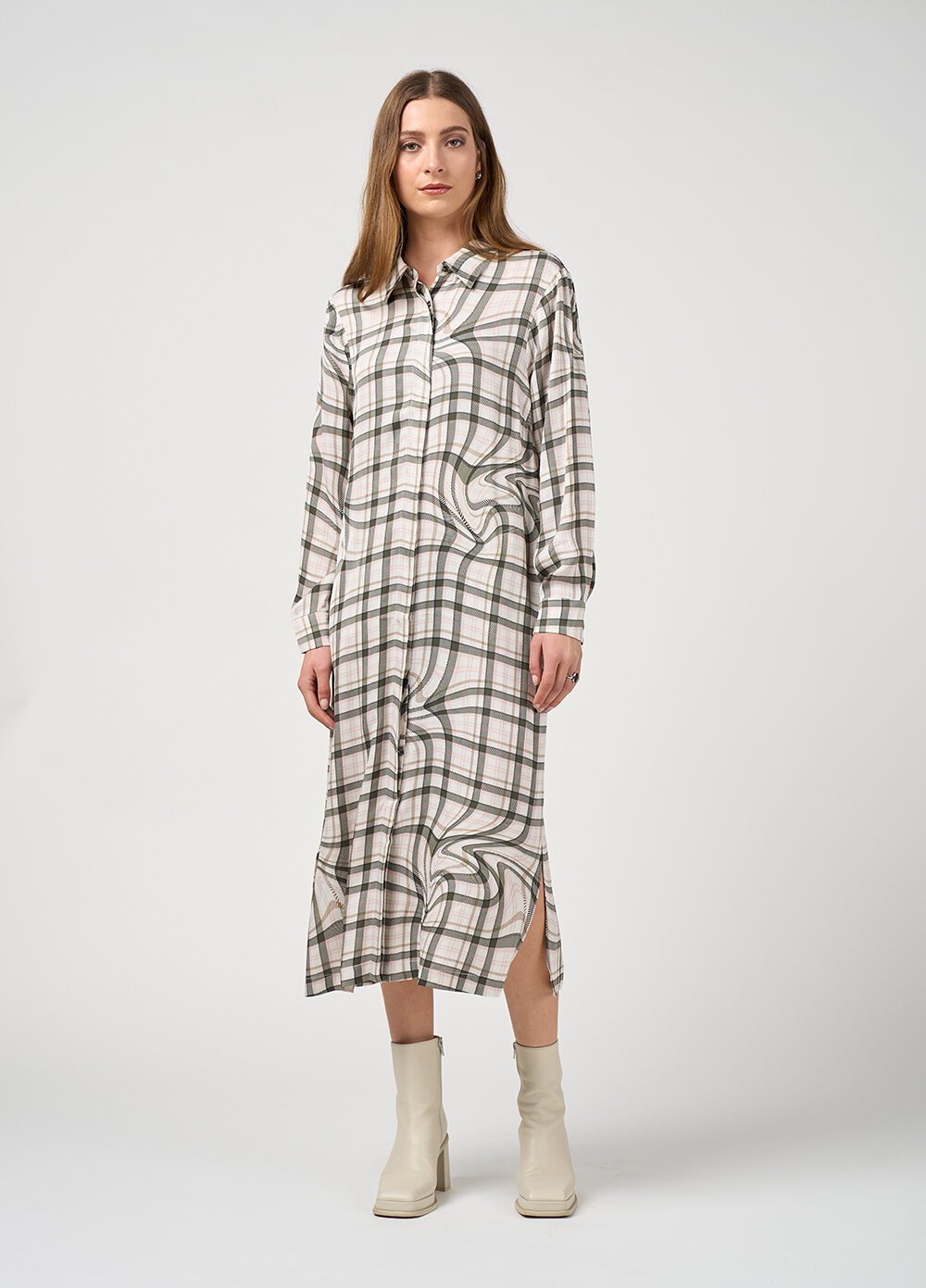 Modern,midi-length shirt dress features a collar, concealed button placket, with topstitched side seam pockets. Has deep side splits, with an elasticated back waist, and buttoned cuffs.