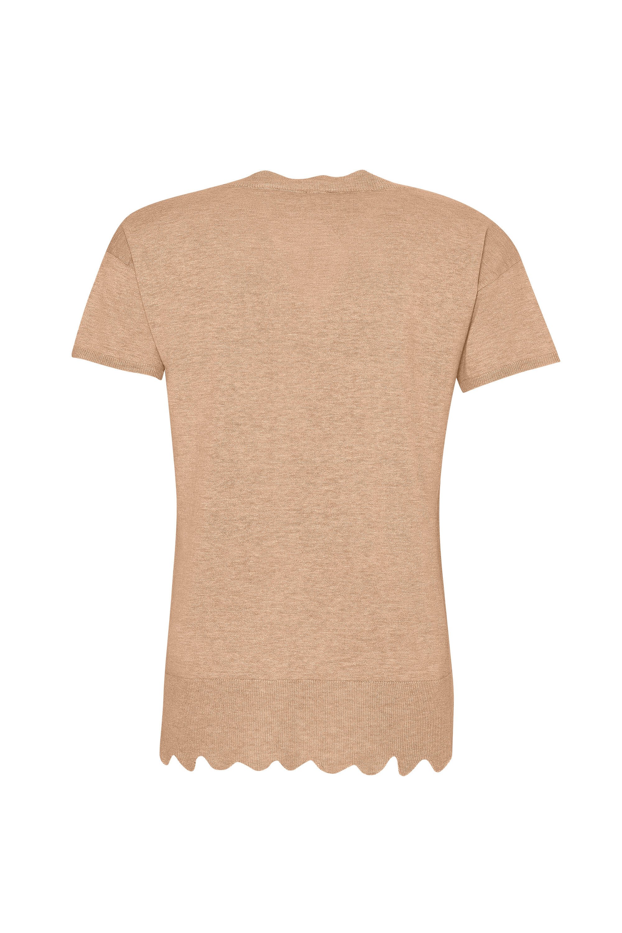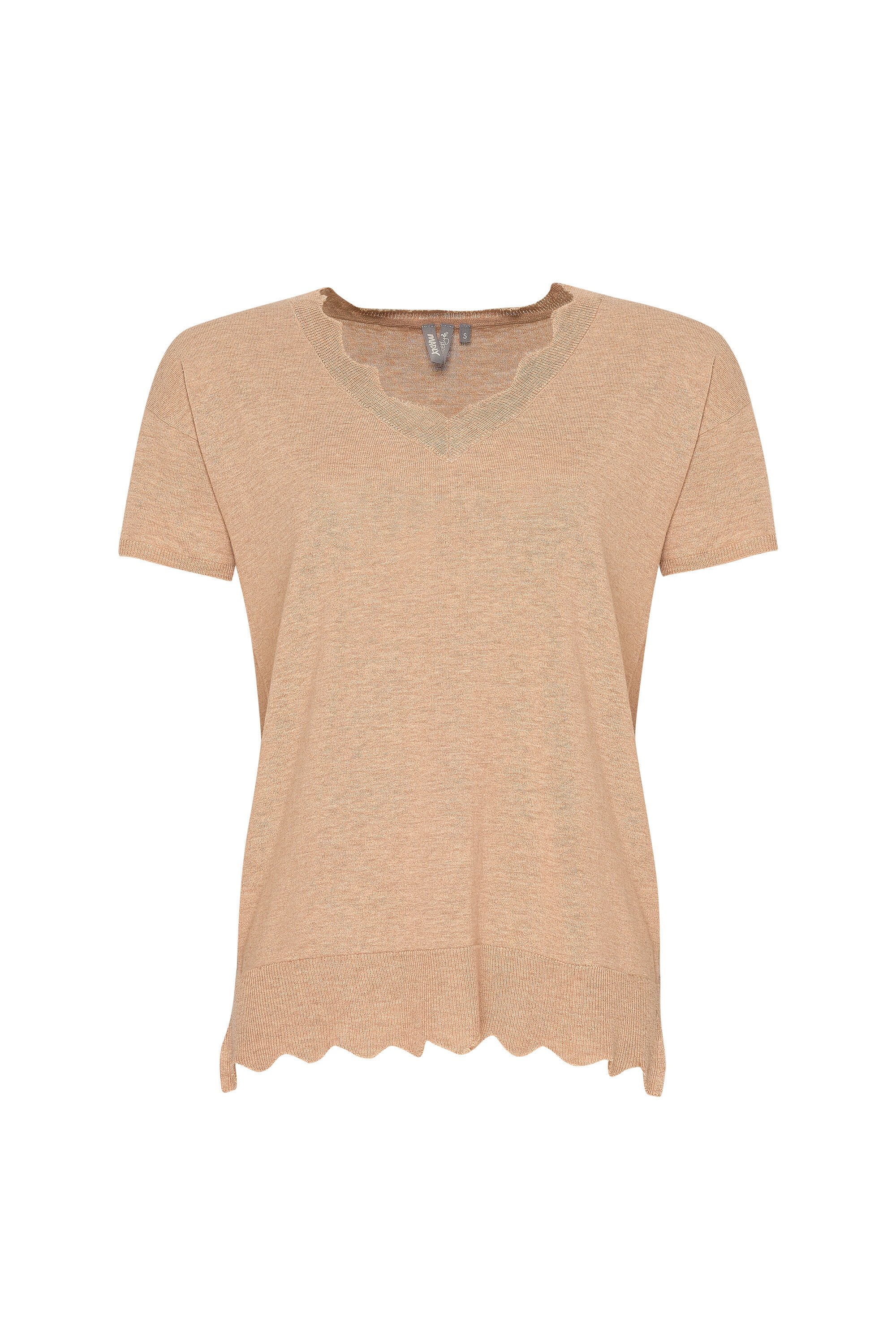 Fully fashioned v neck tee with frayed neck detail and scalloped hem.