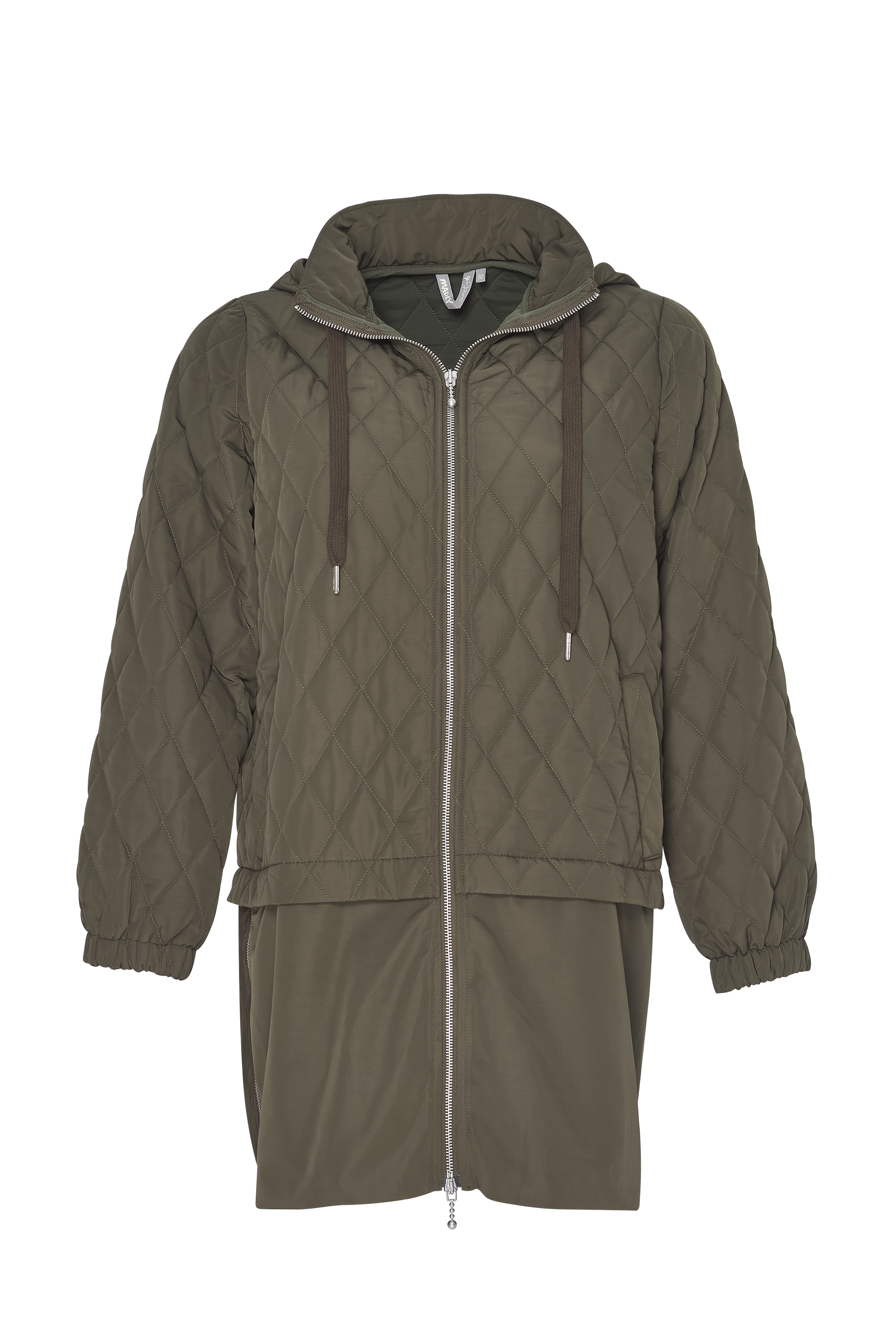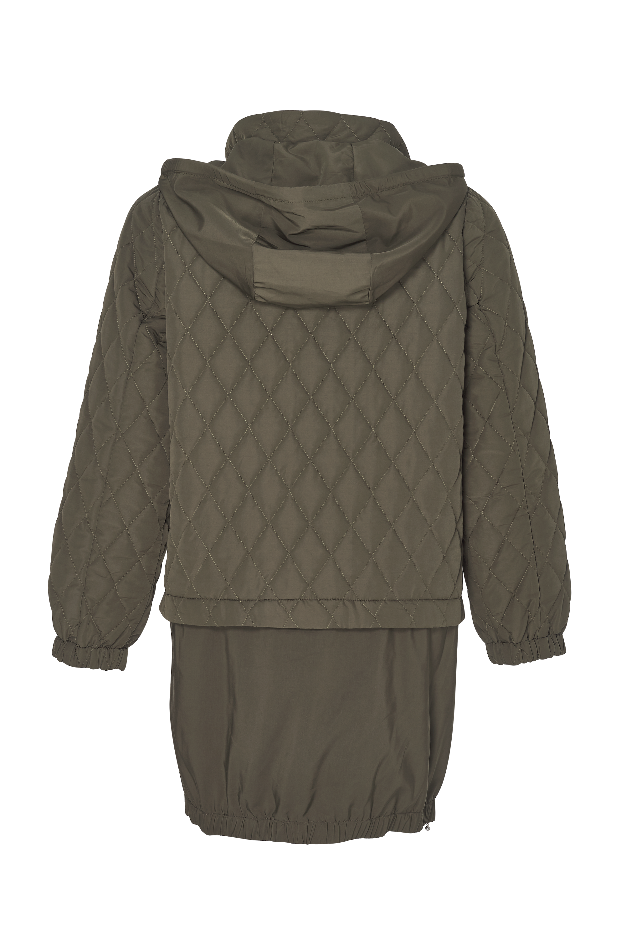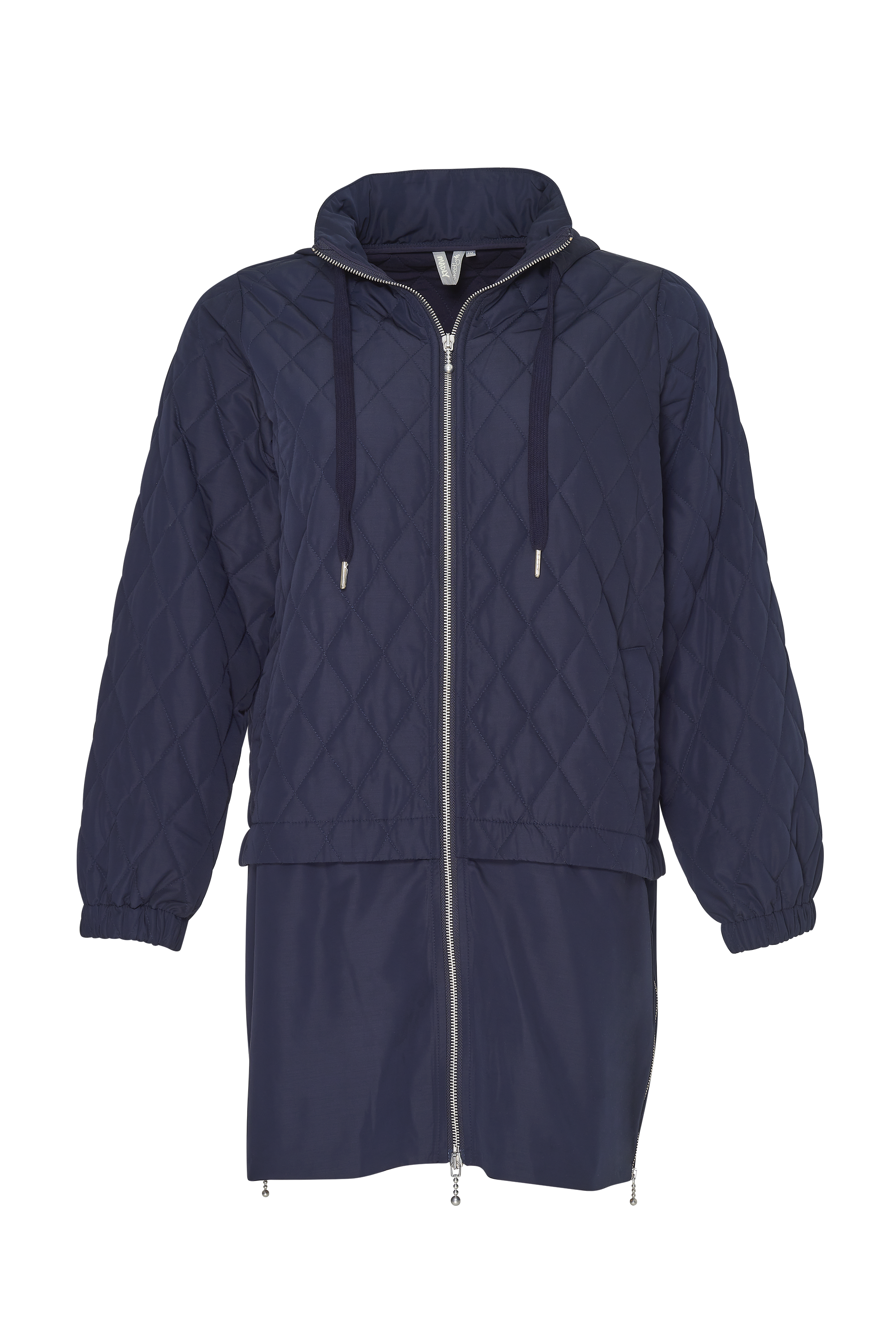 Quilted parka with removable hood and two way front zip closure. Featuring long sleeves with stretch cuffs, front welt pockets and zip open side splits