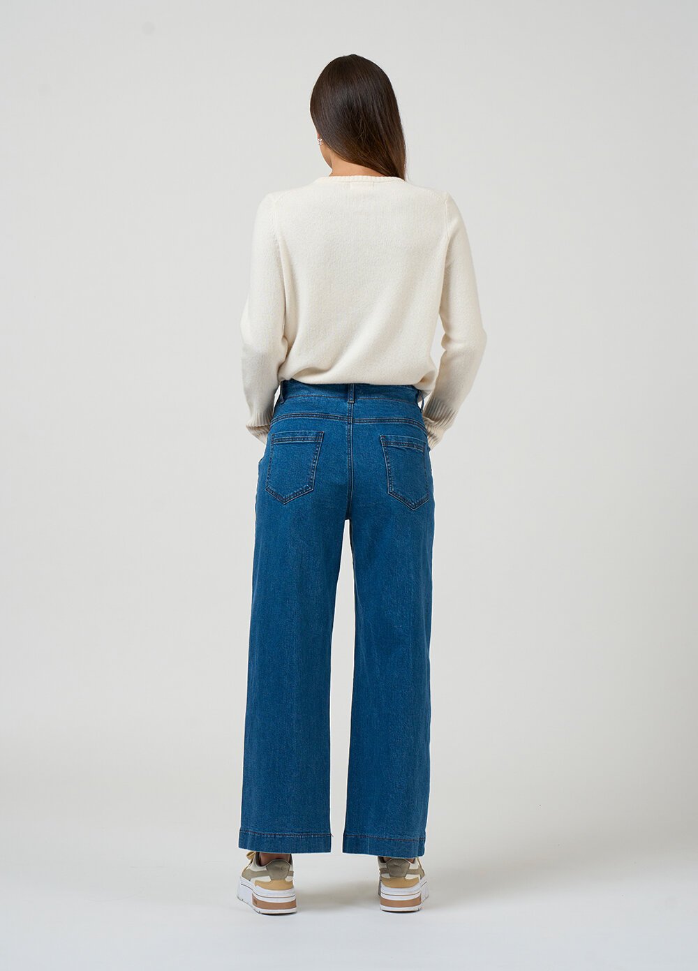 Staight leg jean in a stretch denim with a drawstring waist and angled front pockets featuring a small coin pocket.