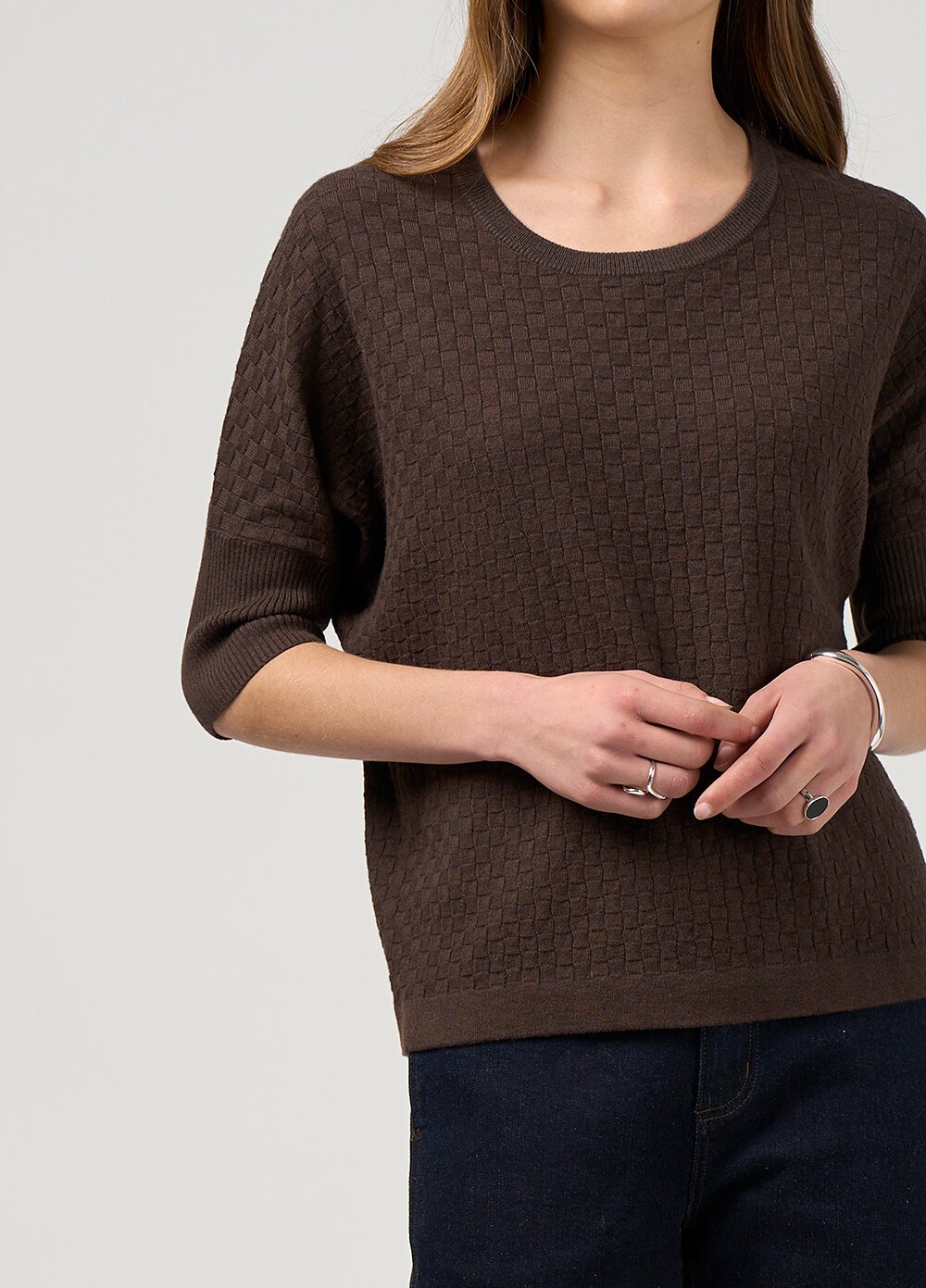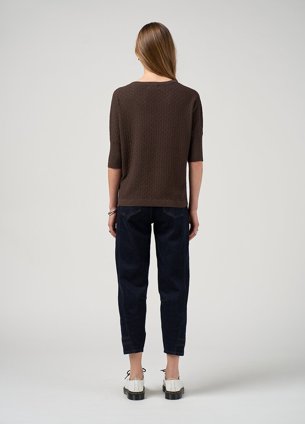 Batwing style tee, with a crew neckline in a soft cotton-cashmere blend. Featuring a basket-weave stitch throughout and deep ribbed cuffs. Perfect for layering.