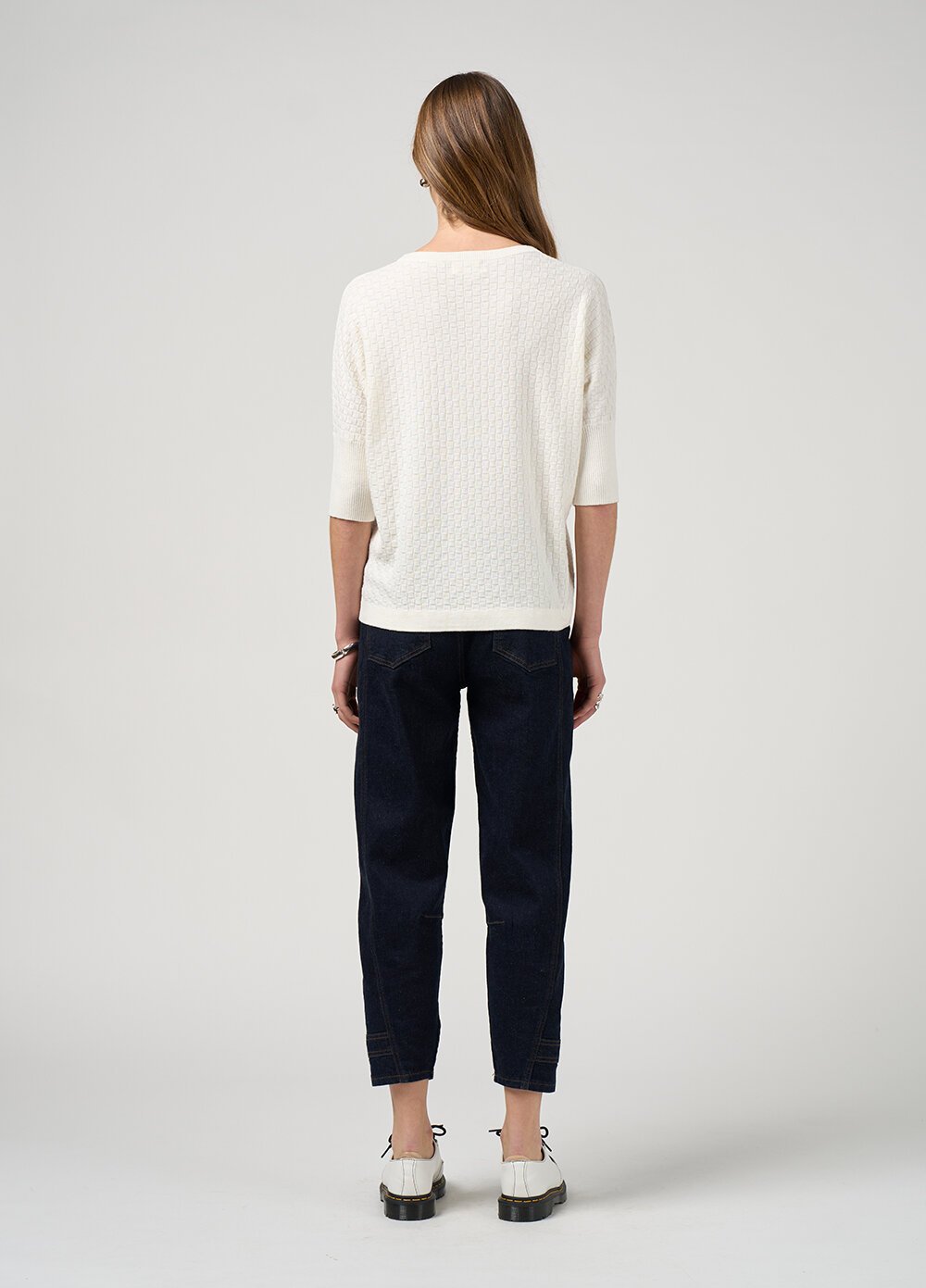 Batwing style tee, with a crew neckline in a soft cotton-cashmere blend. Featuring a basket-weave stitch throughout and deep ribbed cuffs. Perfect for layering.