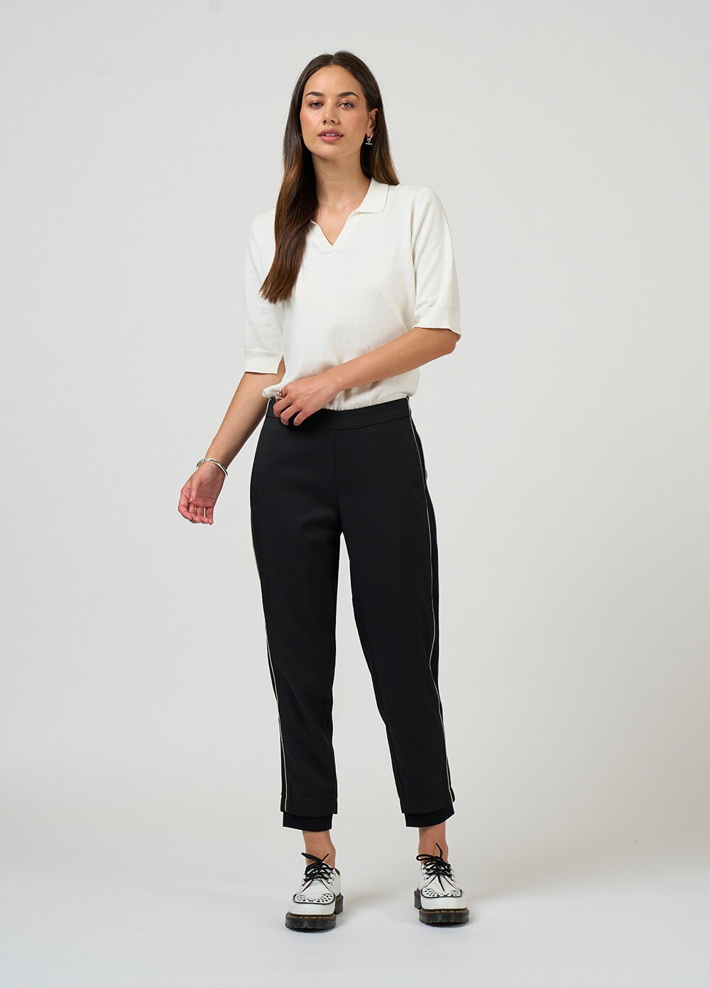 Relaxed fitting, pull-on pant with a tapered leg, with front and back pockets and elasticated back waist for ease and comfort. Featuring rib side panels and cuffs and fine contrast insert piping detail.