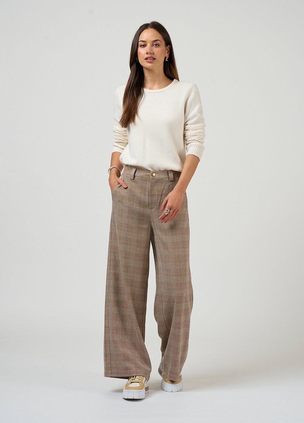 Wide leg pant with a fly front, with angled front pockets and elasticated back waist for ease and comfort.