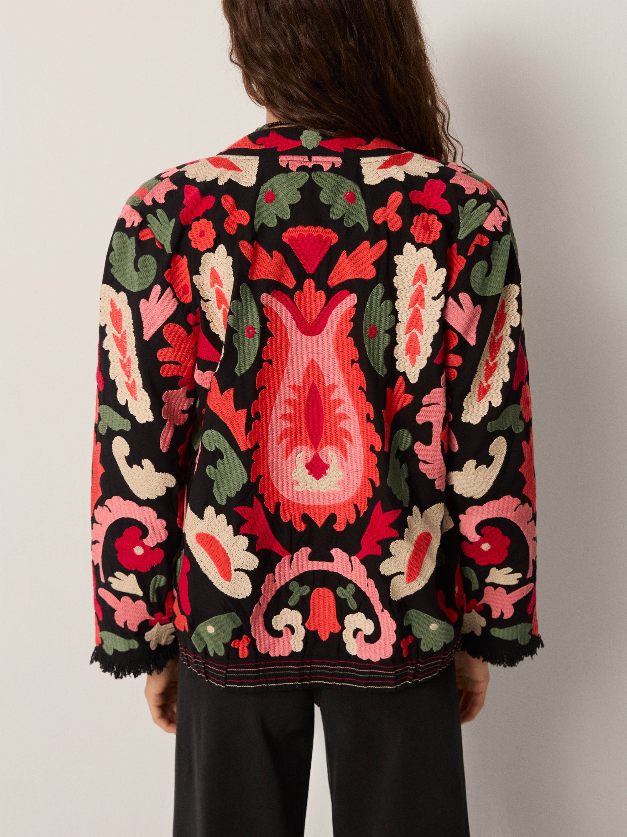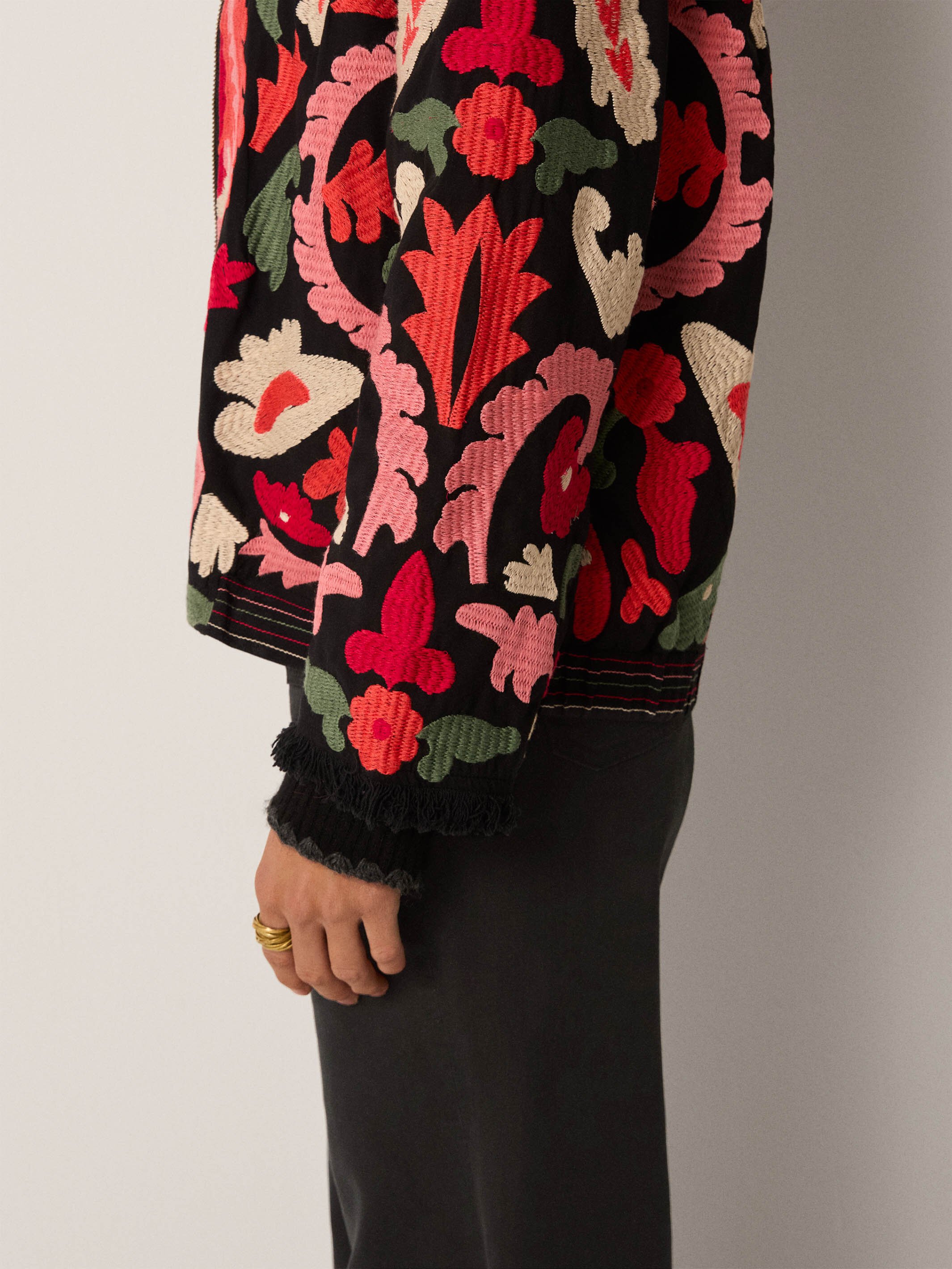 Florals in pink, red, and green bloom across the surface, thickly embroidered and raised to the touch. Borders frame the edges, giving the jacket its crafted, ornamental structure.