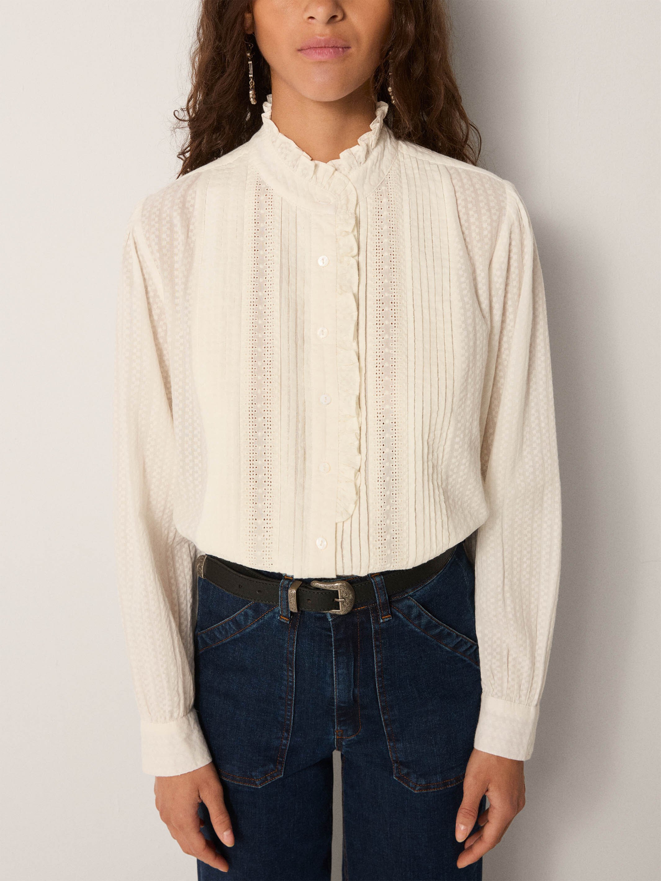 Crafted in soft cotton dobby with shiffly, the Bella Blouse brings a subtle play of textures with delicate pin-tucks and ruffle detailing along the front.