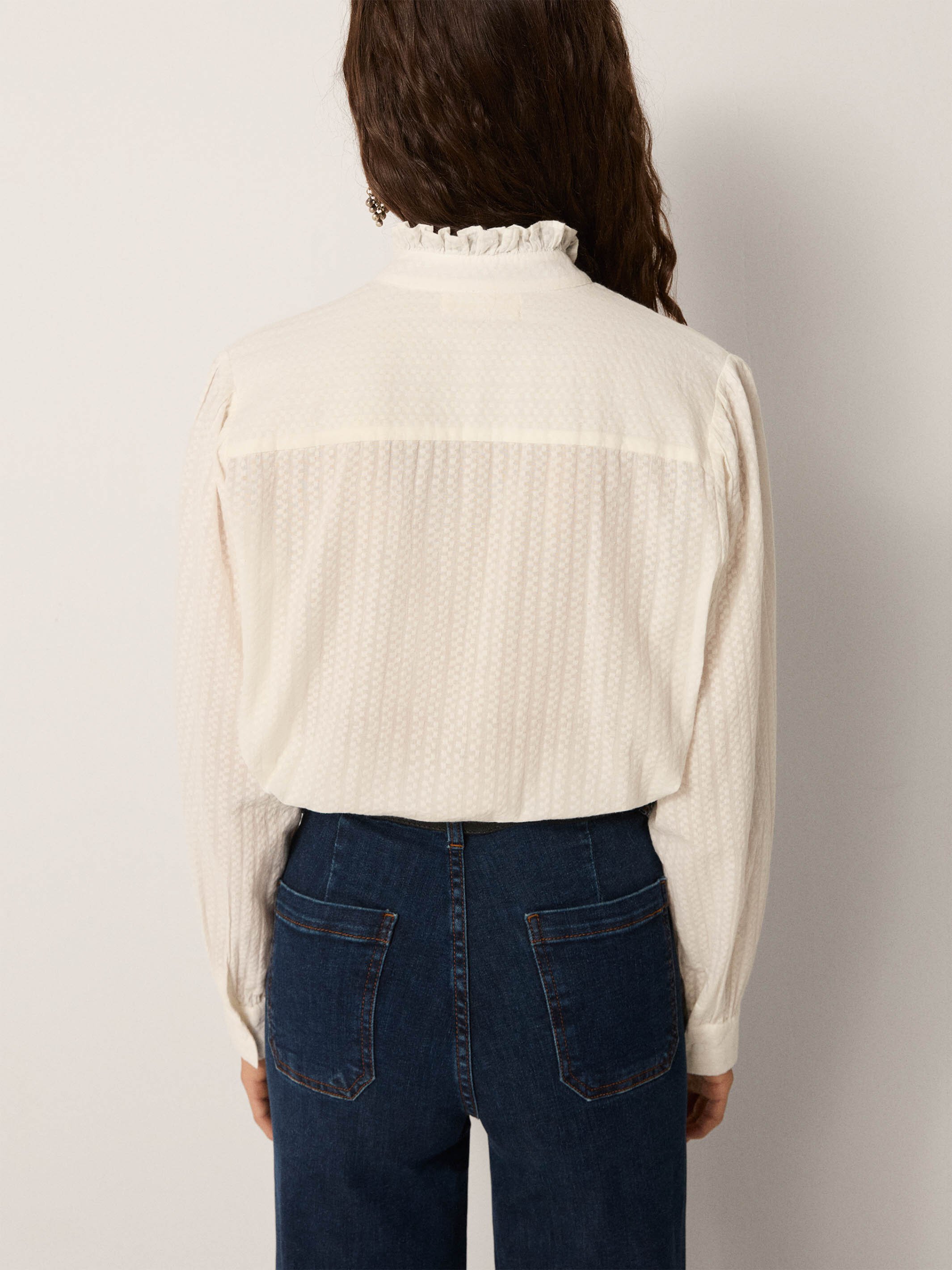 Its high neckline and feminine silhouette add a touch of elegance, while the lightweight fabric ensures ease and comfort for everyday wear. An elevated essential with timeless charm.
