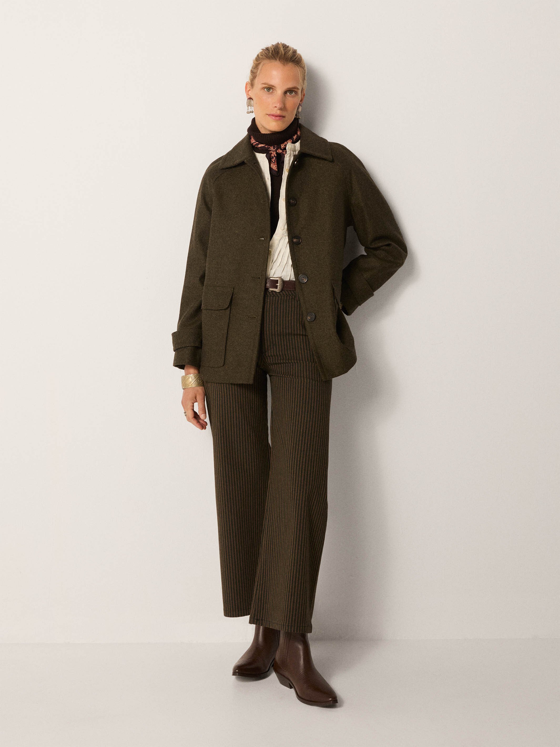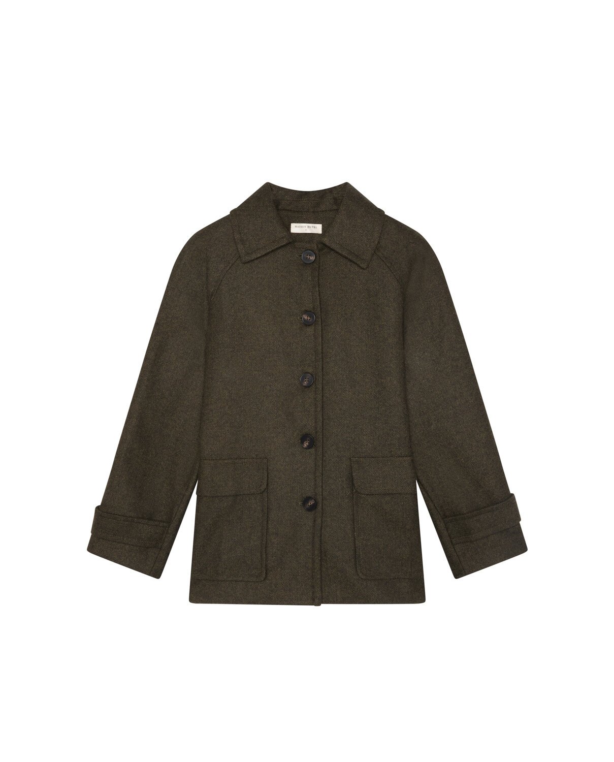 Meet Henri. Boxy, cropped and crafted in a dense wool blend, designed to feel both utilitarian and refined. Its straight cut and sharp collar make it versatile, while the deep olive tone grounds the look with earthy sophistication.