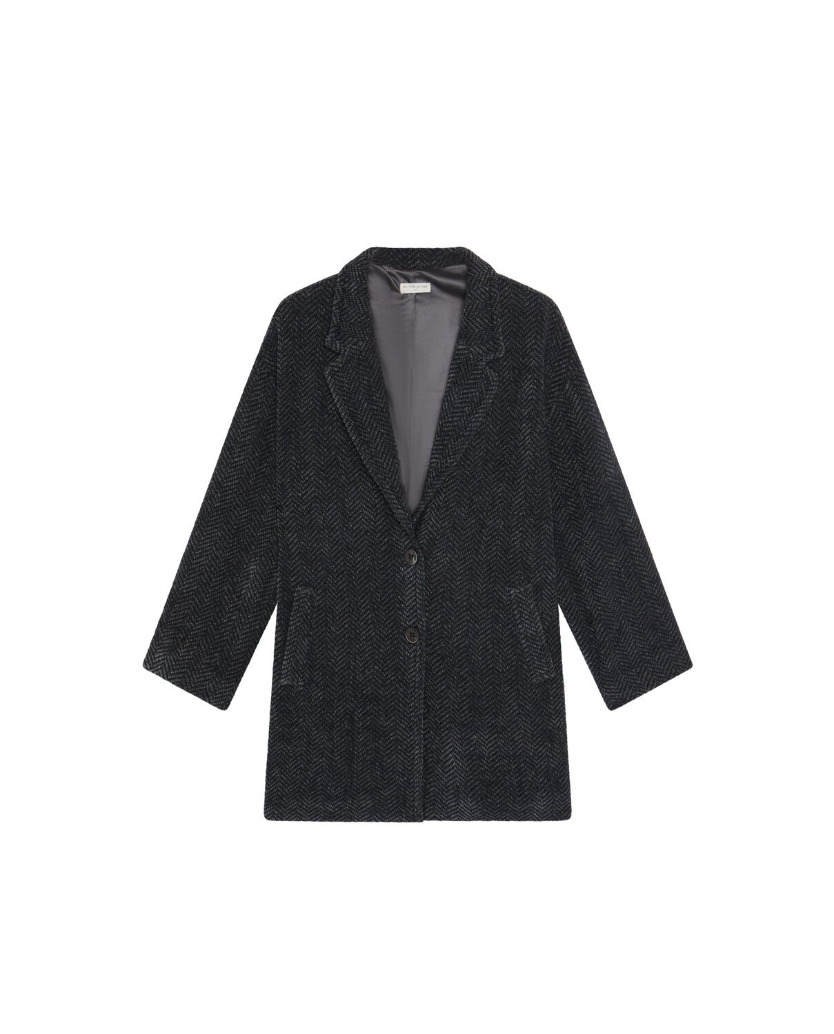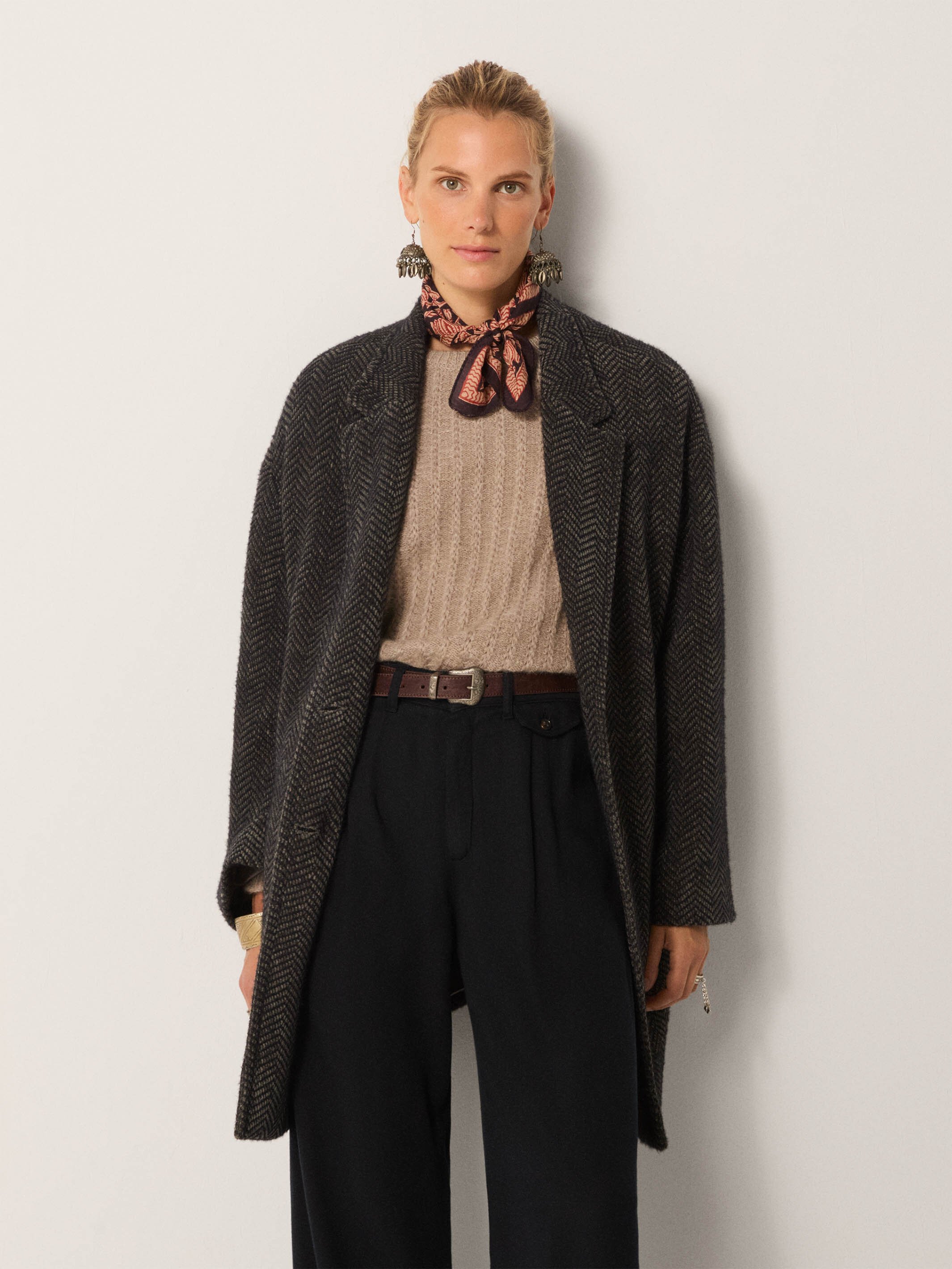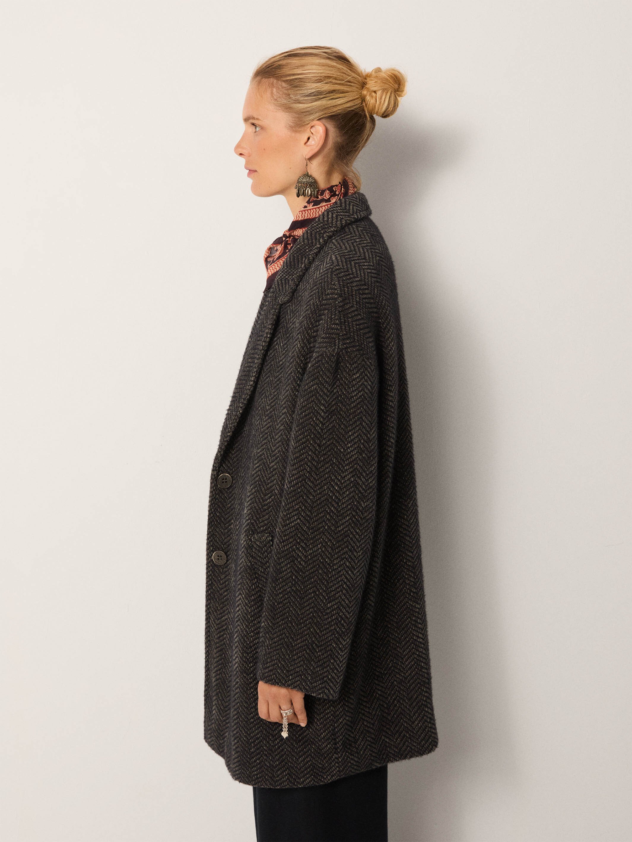 Cozy jacket in a dark herringbone, cut oversized with dropped shoulders and a long line. It has the weight and presence of a classic men’s coat, softened by volume and ease.