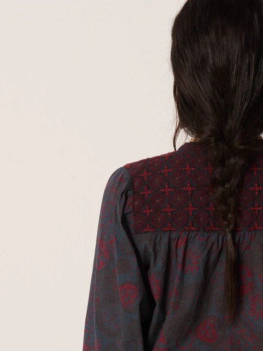 Voile cotton, light and semi–sheer, embroidered with a scattered floral pattern that beels almost hand-drawn. A blue nearing midnight, softened to ink by time.