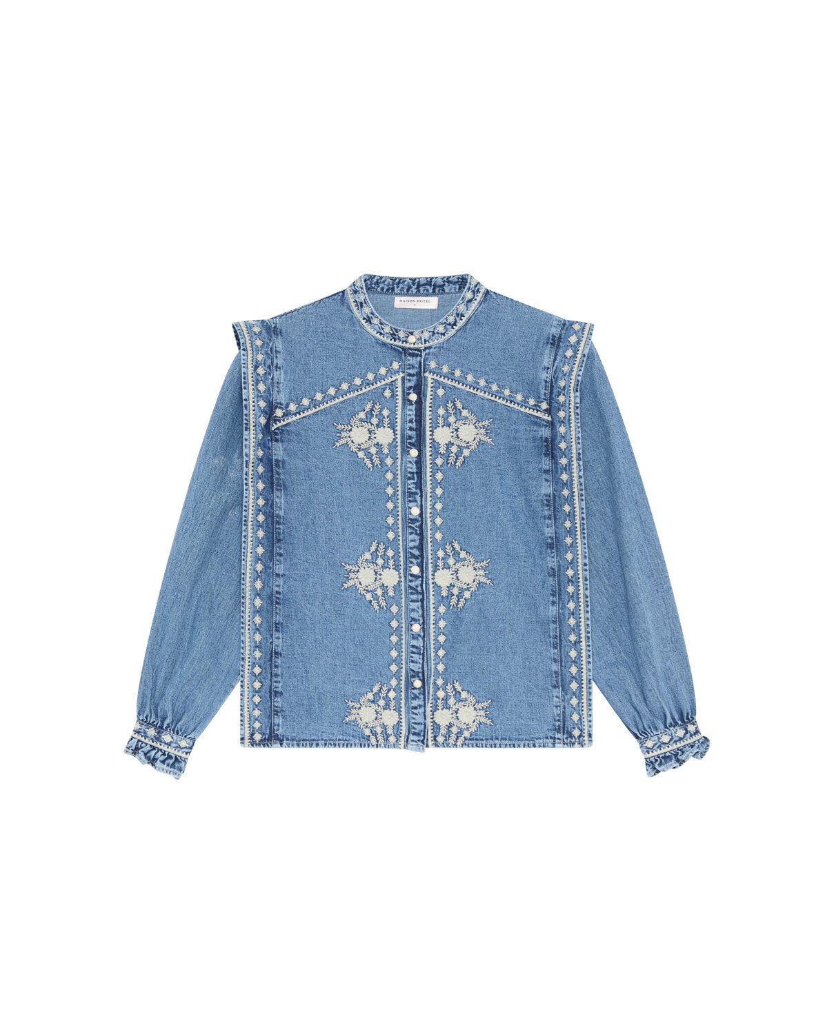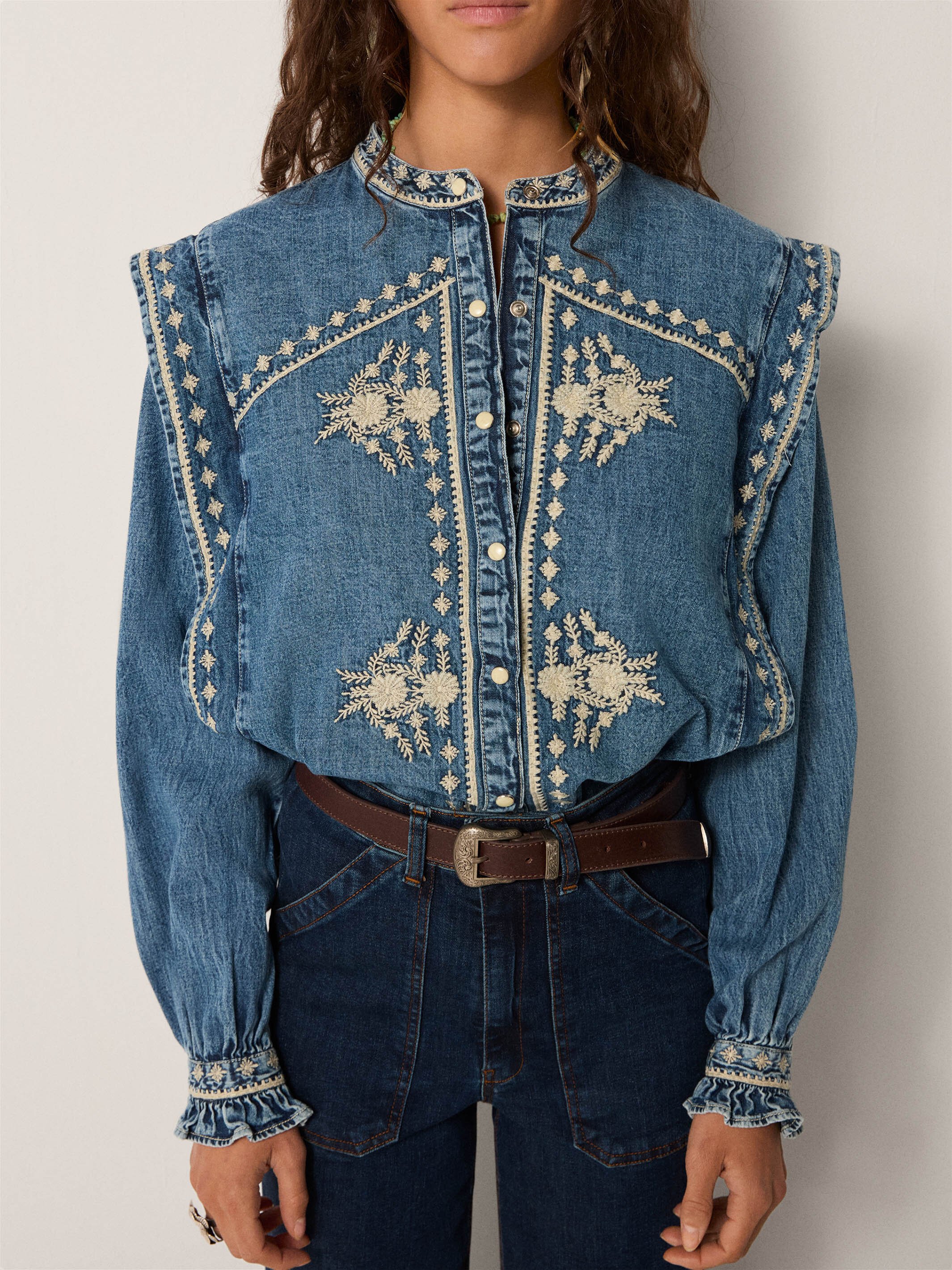 Across chest and sleeves, ivory florals unfurl like stitched gardens, adding delicacy to the rugged ground. The embroidery lightens the denim, lending movement and intricacy to a fabric built for endurance.