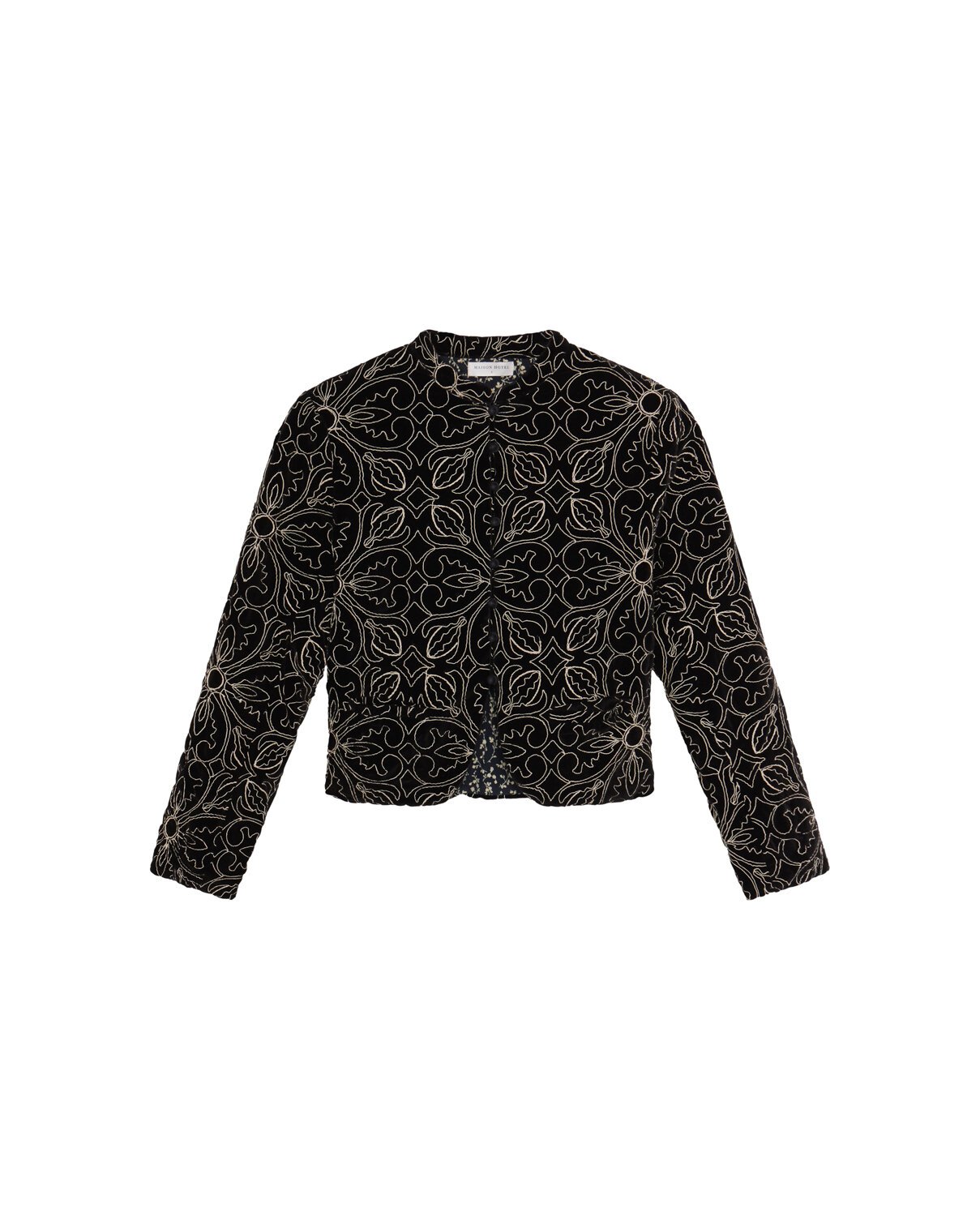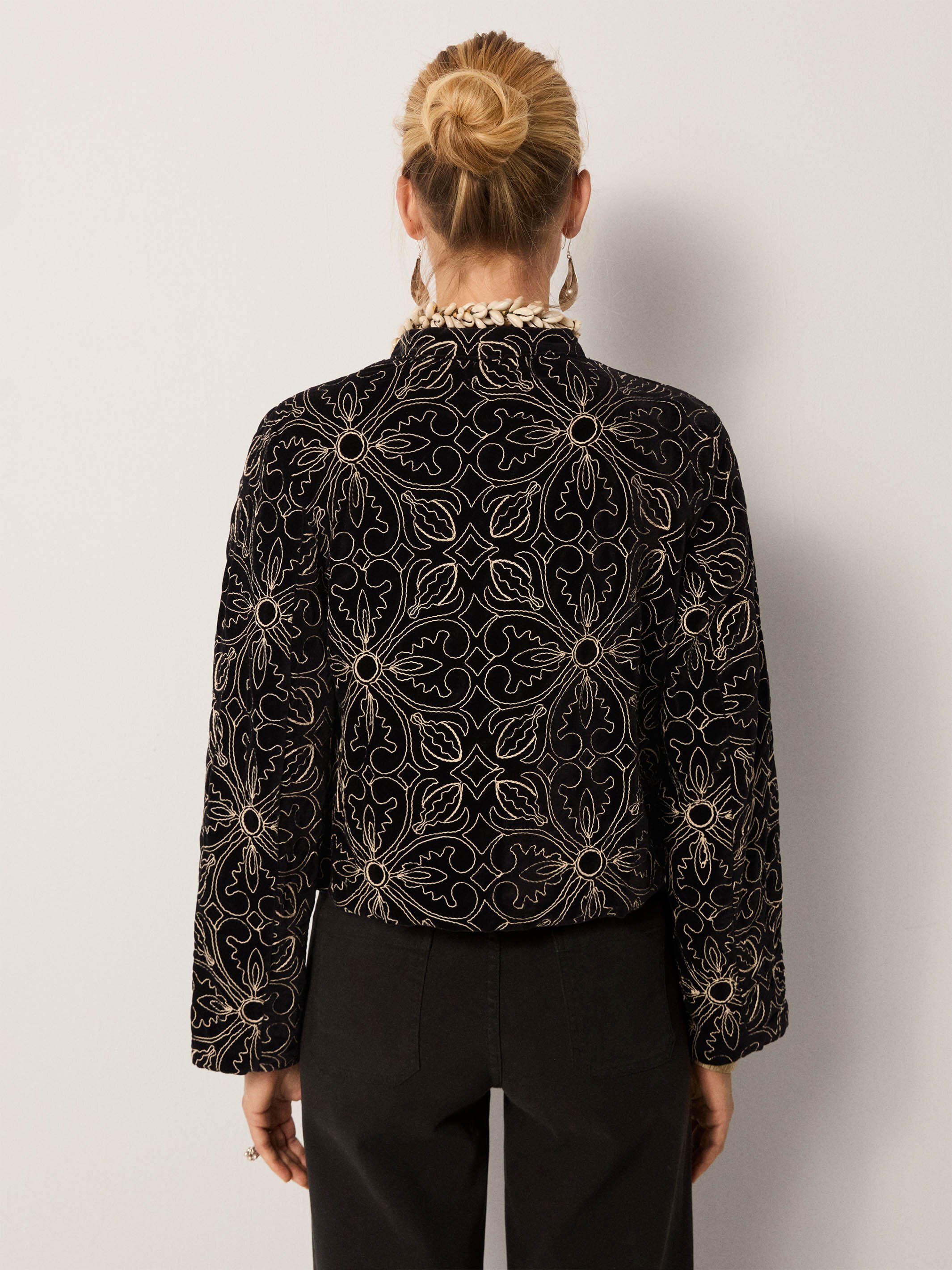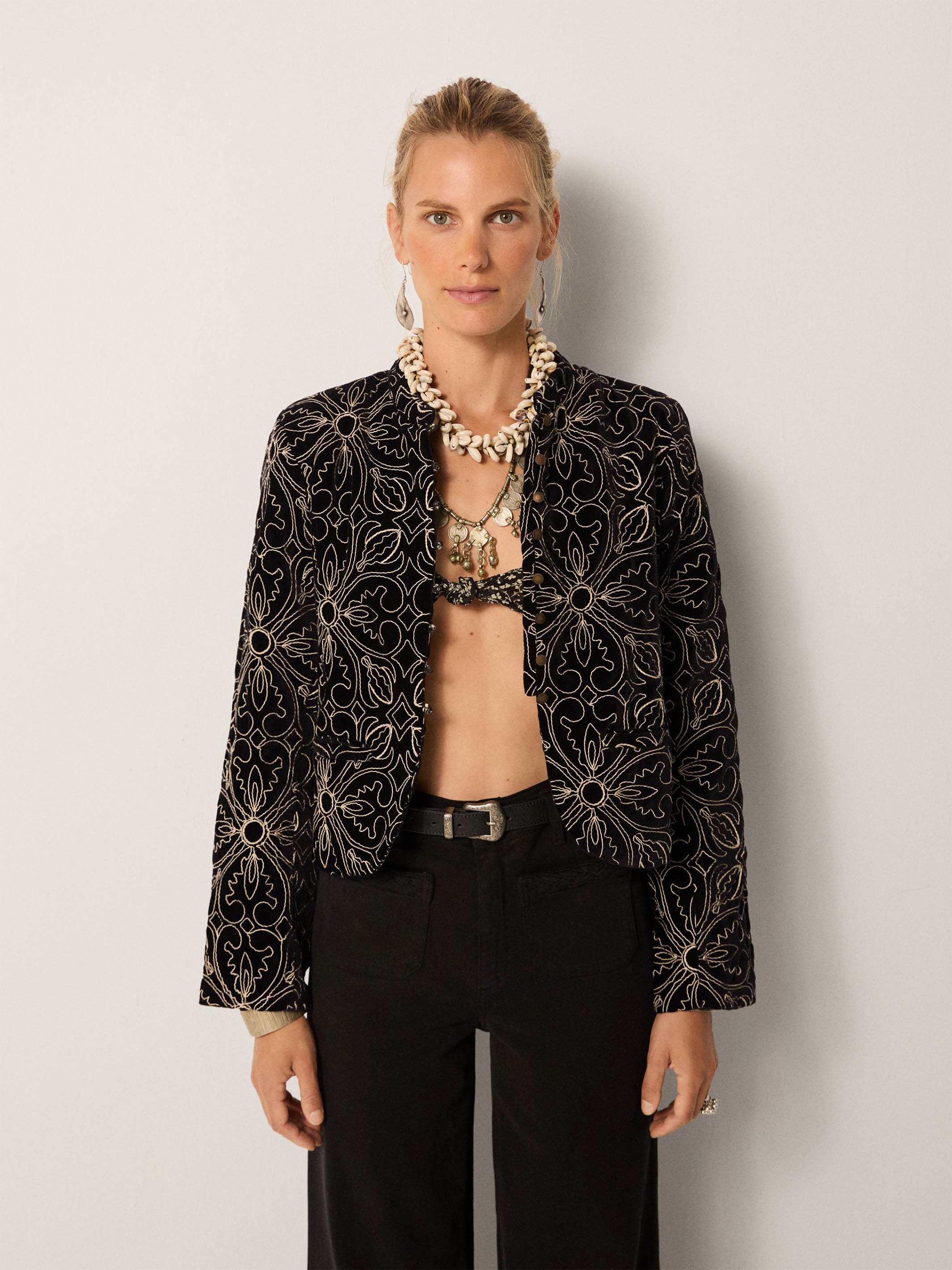 Velvet with weight, fully embroidered in golden metallic thread. The pattern runs bold and ornate, like something lifted from a baroque tapestry and cut into a jacket meant for the night. There’s a touch of the 70s in its glow. those hypnotic embroideries that could have walked straight out of a stage set, where fashion and sound blurred into pure spectacle.