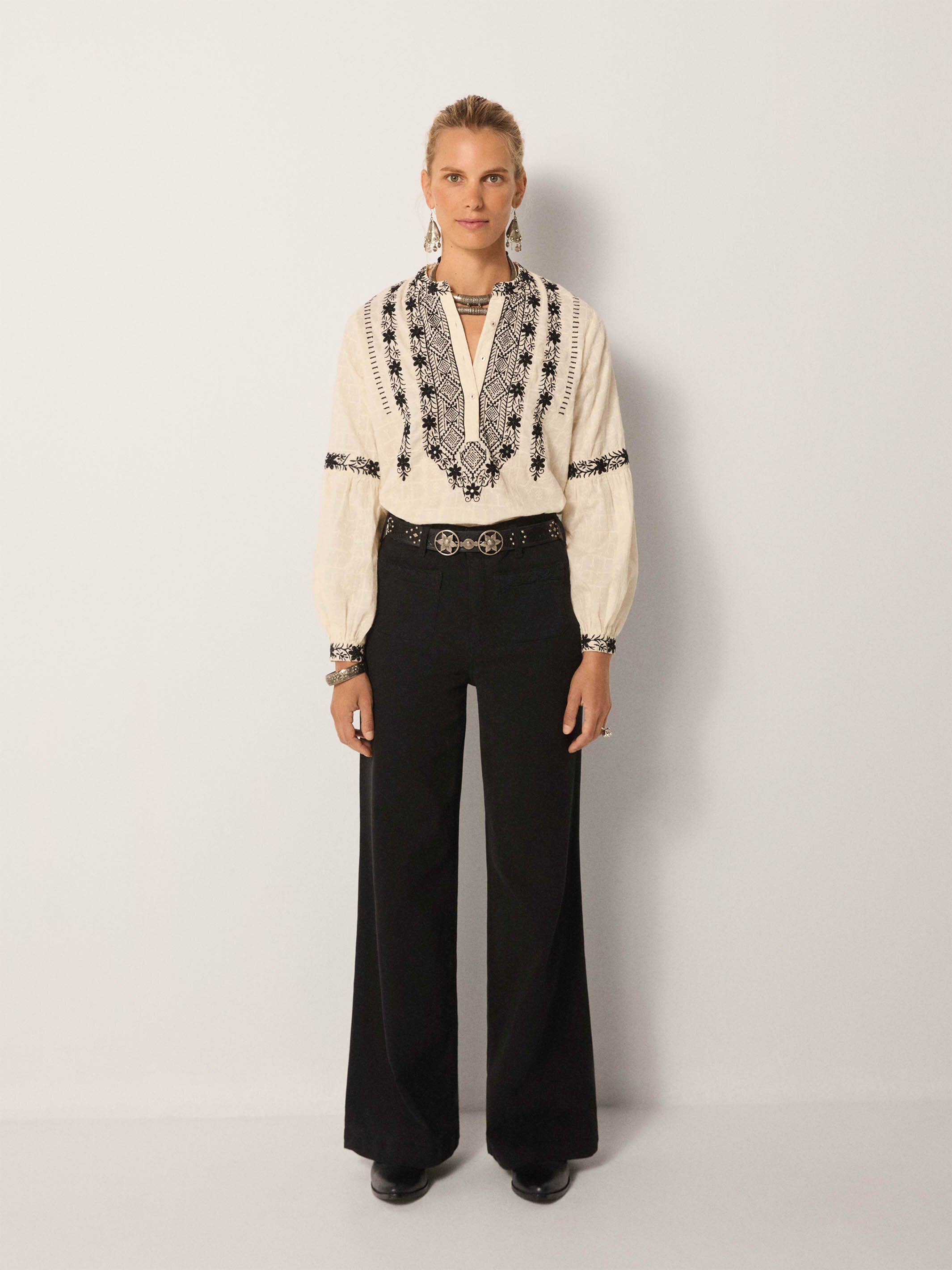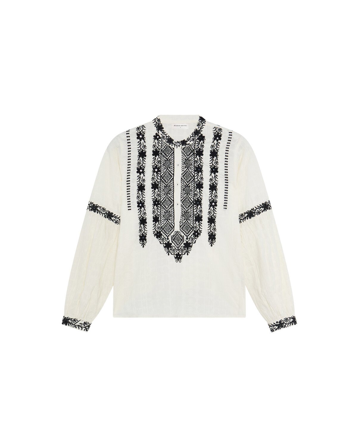 Across chest, arms and cuffs, black embroidery marks the fabric with geometric florals. The contrast is sharp and timeless, like ink pressed onto paper.