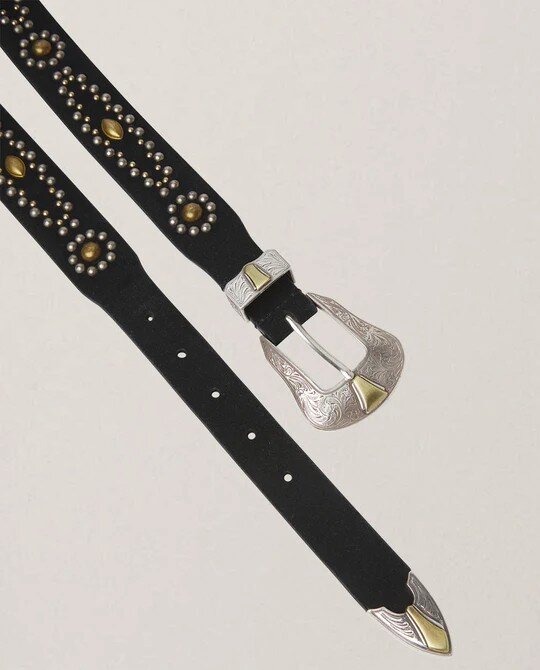The Pancho belt Midnight Silver Belt is a western-inspired piece in soft black leather. Designed with a finely engraved silver buckle featuring golden accents and studded details, it’s the perfect accessory to add character and definition to any look.