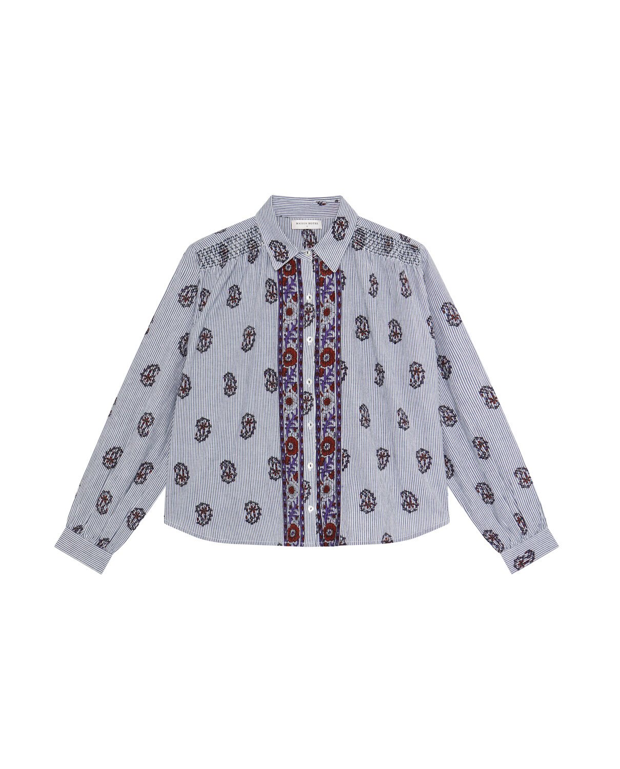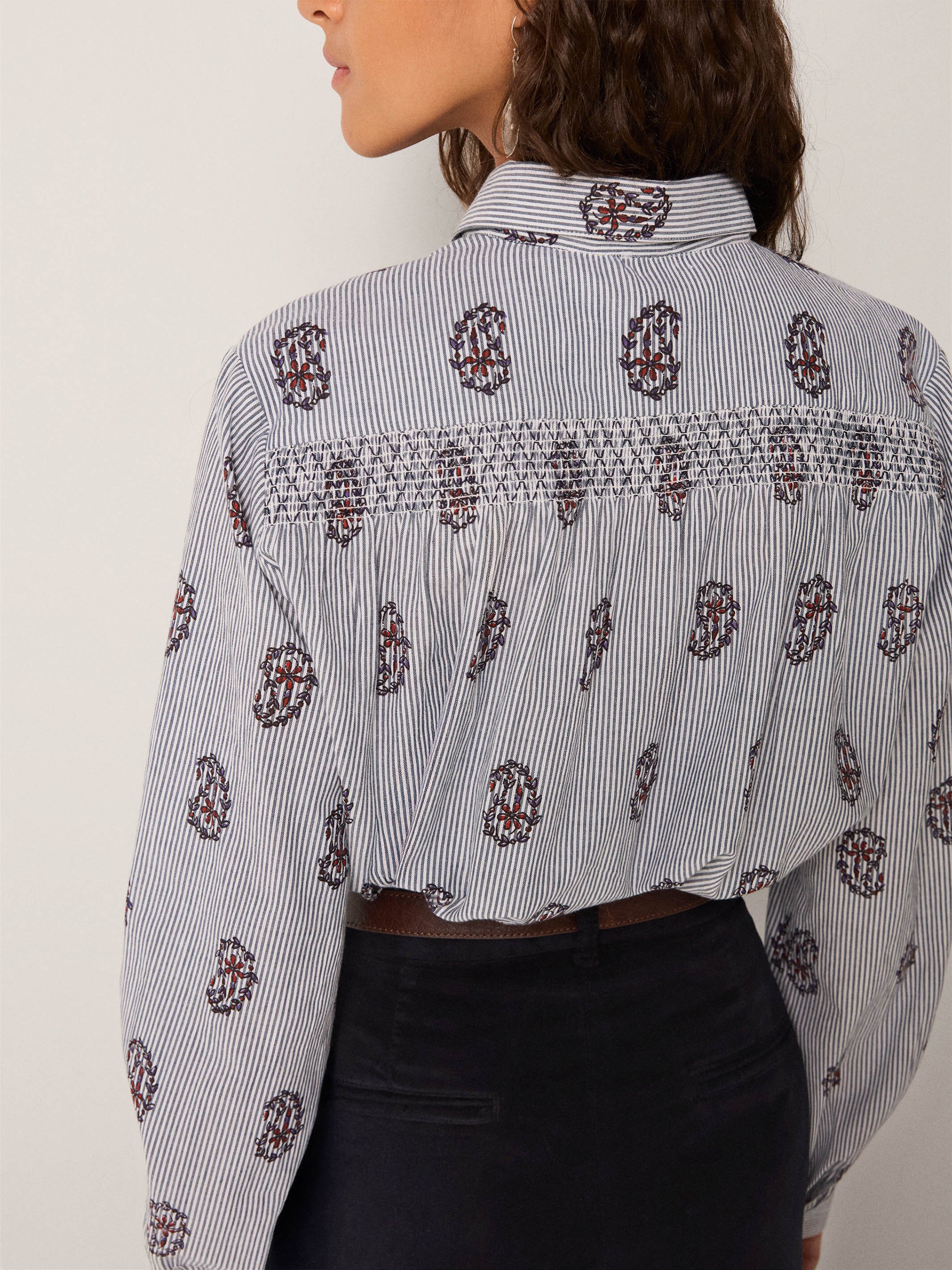 Soft cotton with a light hand forms the base of this blouse, striped in fine lines that carry subtle texture. Its relaxed fit feels effortless.