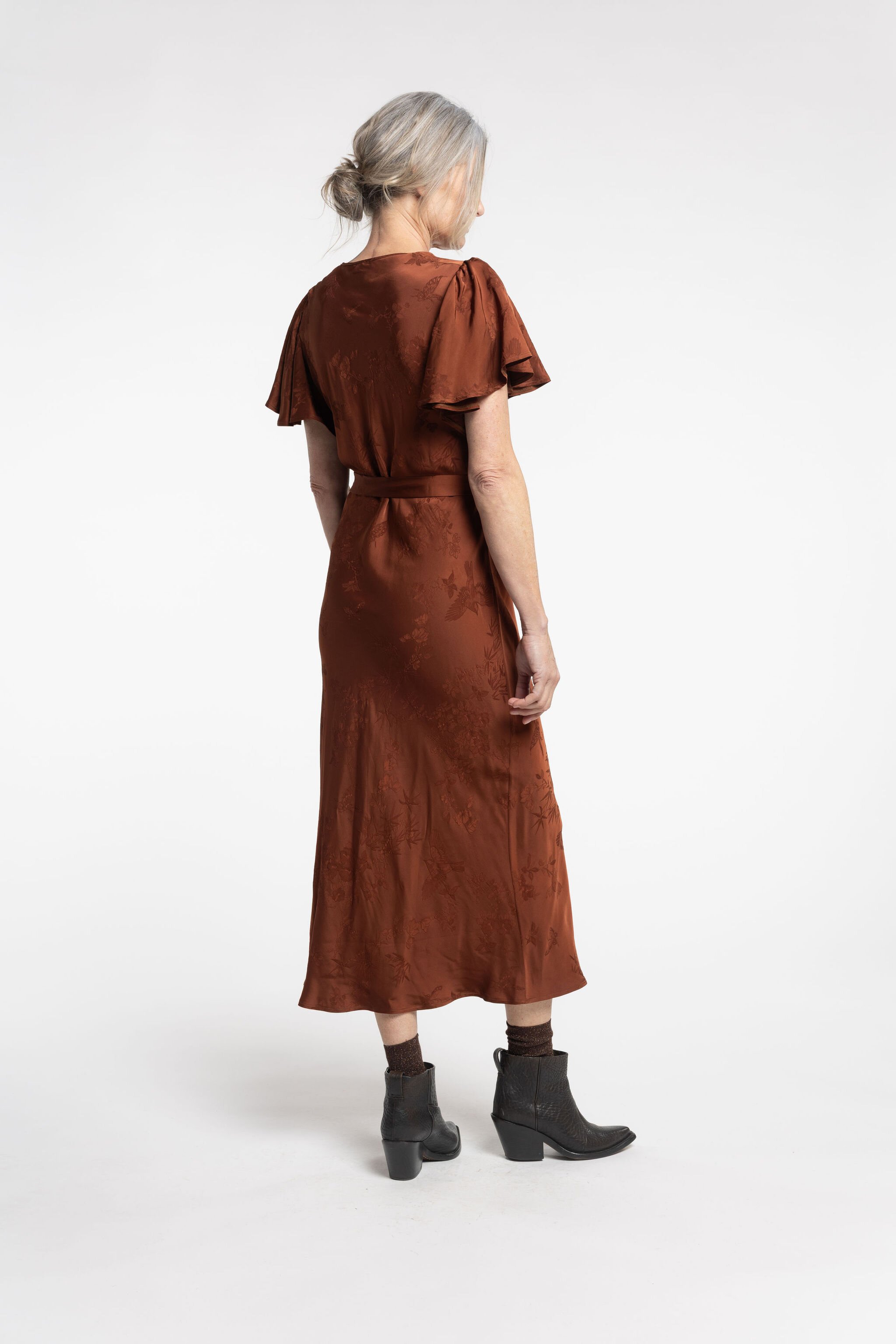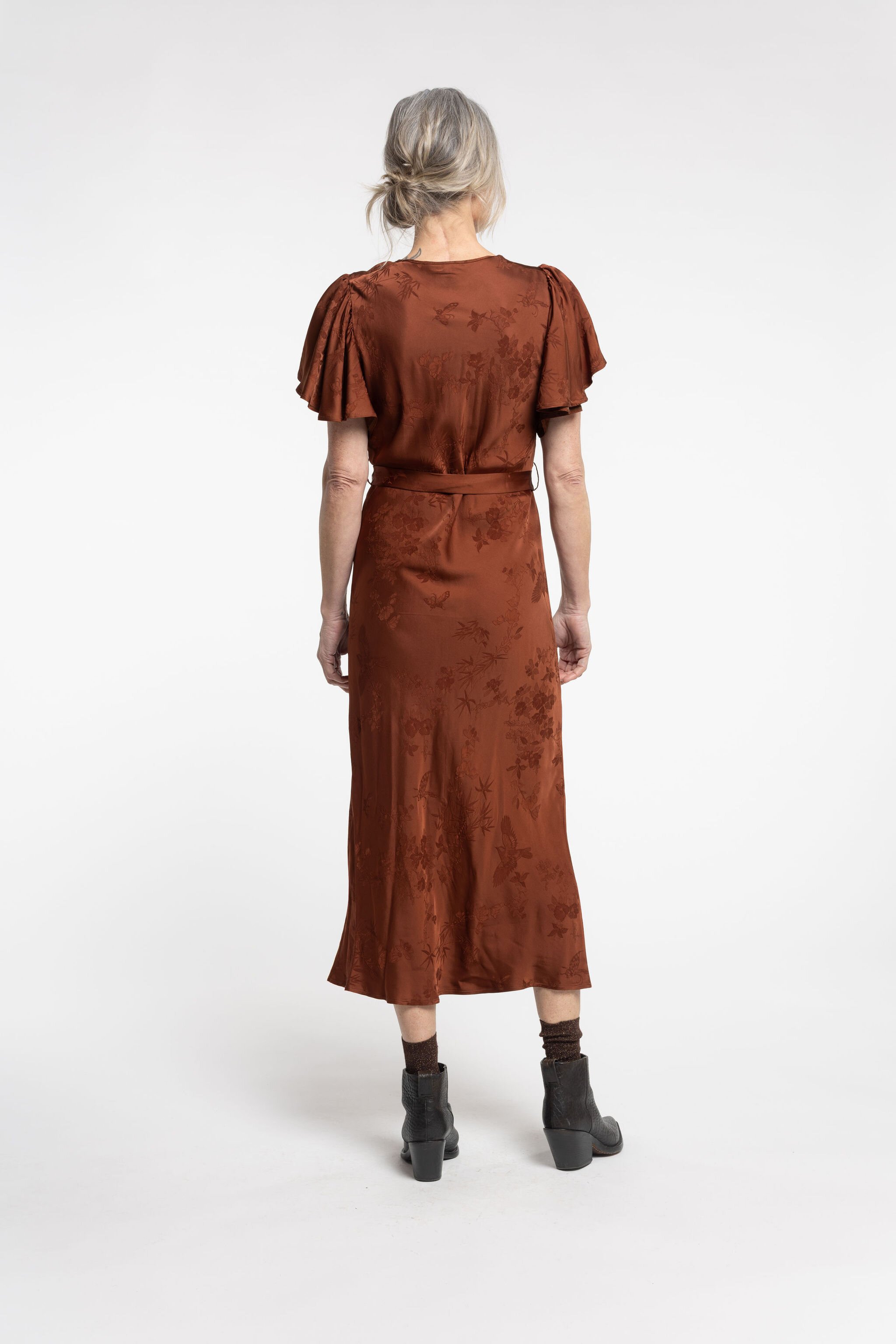 Introducing the Devon Dress in Cinnamon, an effortless silhouette designed for understated elegance and everyday wearability. Crafted from 100% viscose jacquard, the fabric features a subtle woven texture that adds depth and richness to the warm cinnamon tone. Cut on the bias, the dress gently skims the body, creating a naturally flattering drape and fluid movement with every step.