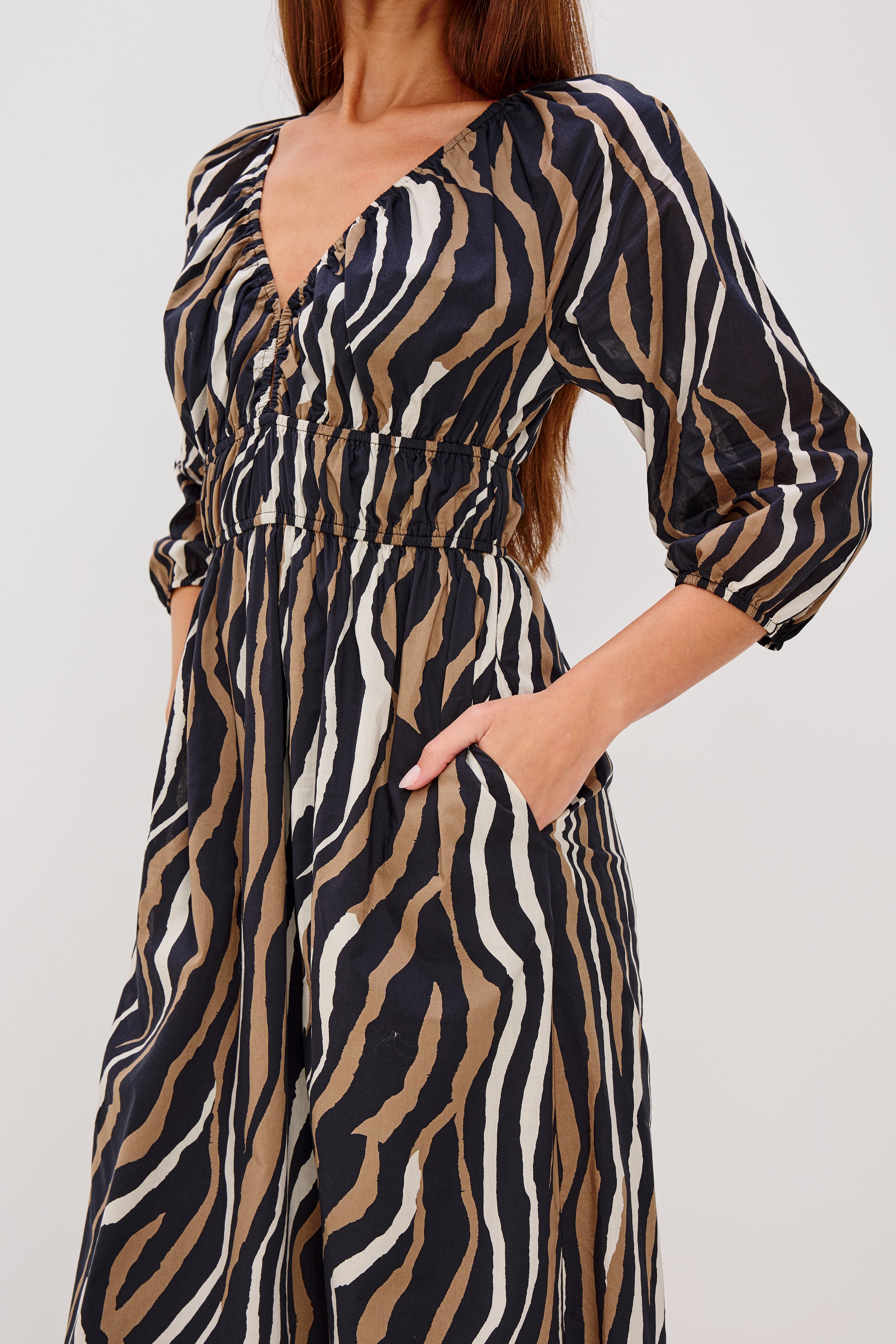 Flowy, feminine, and effortlessly breezy, the Paio maxi dress features a bold, abstract print in lightweight beach cotton. It has an elastic V-neckline, front keyhole cutout, defined waist and cuffs, billowing three-quarter sleeves, and a fully lined body.