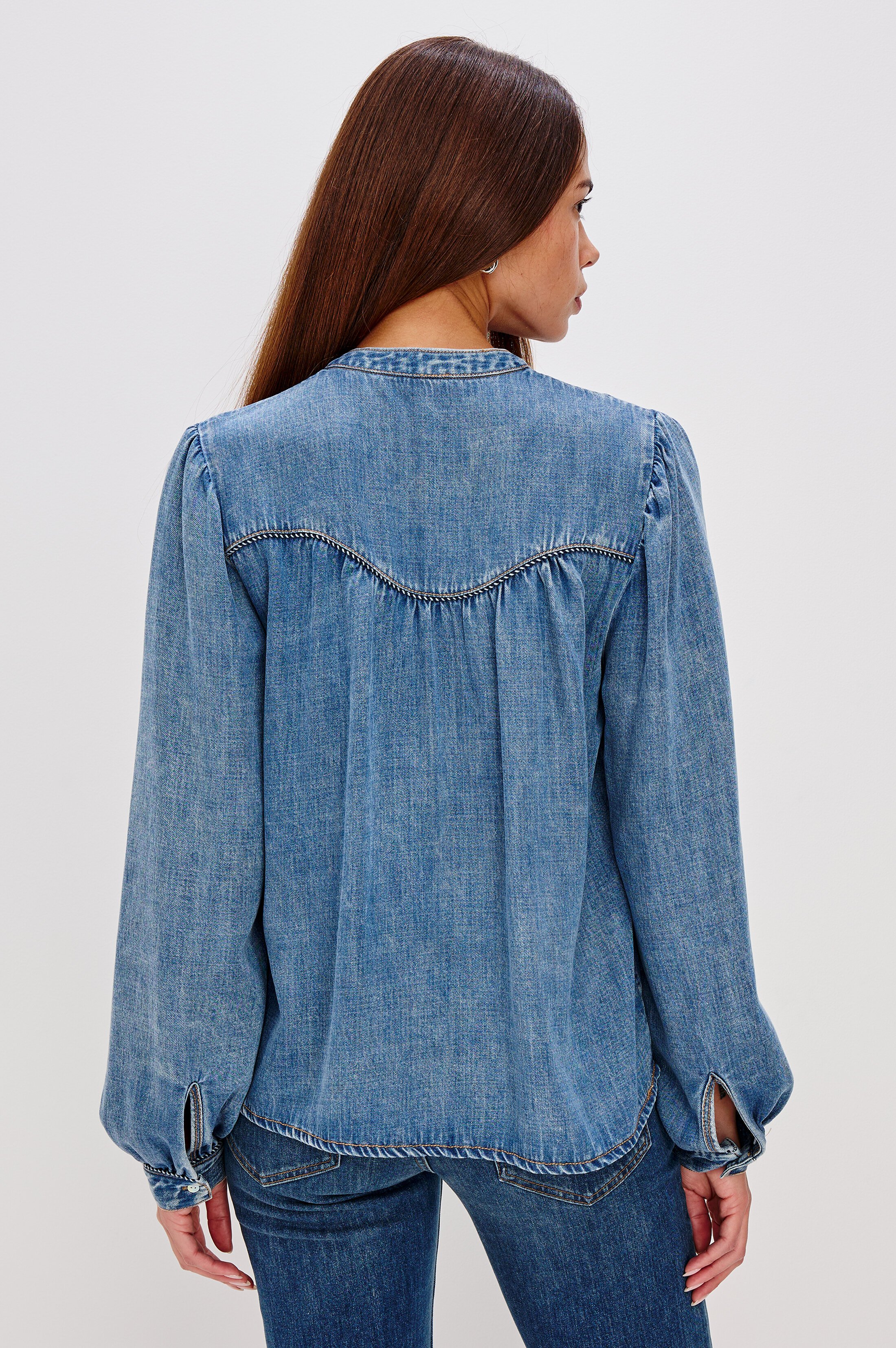 The Sunna is a timeless denim shirt with a lived-in wash. It features a half front placket with shell buttons, two-toned twist piping, a high neckline, and long puff sleeves with fitted cuffs.