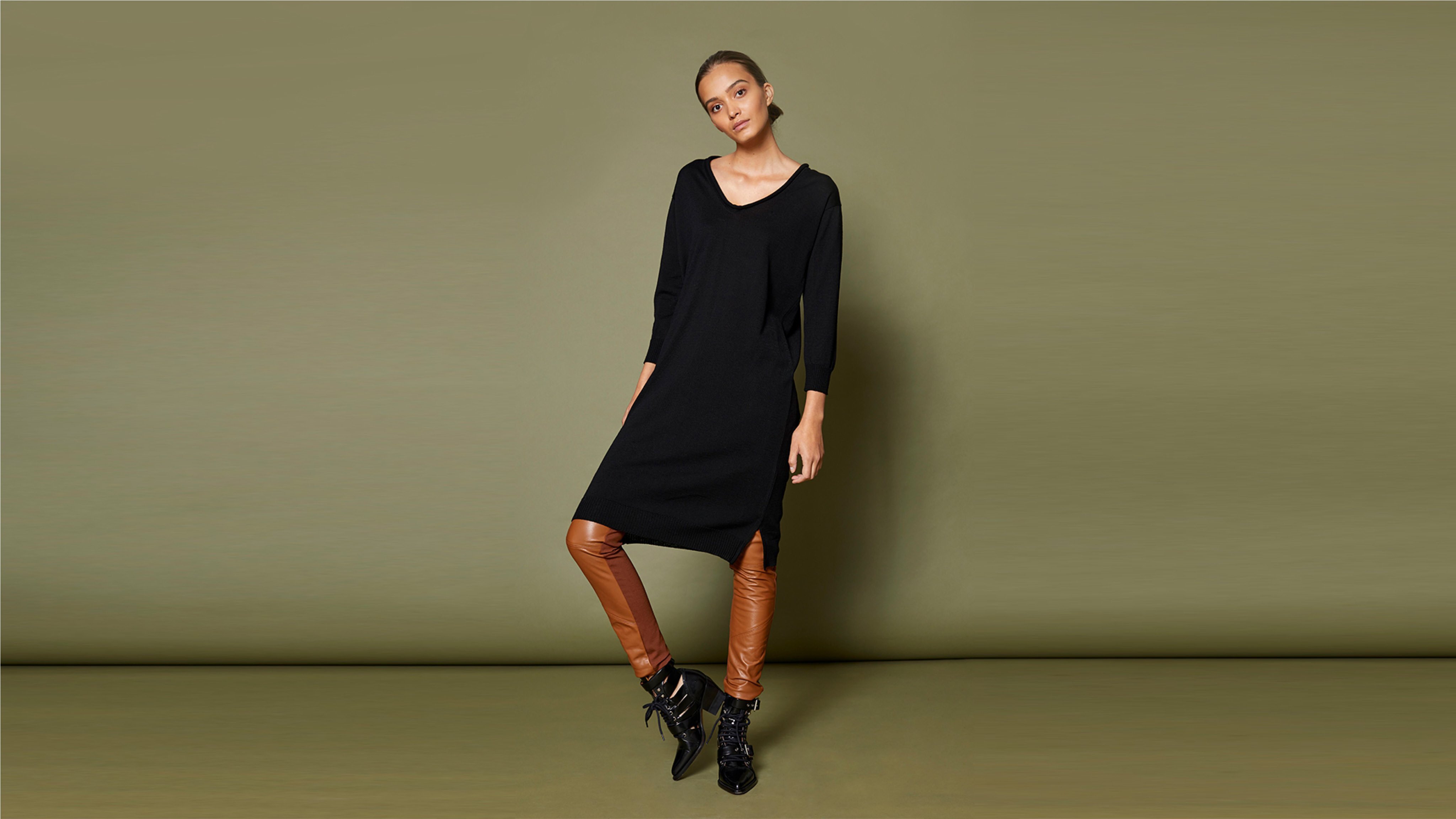 Full leather panelled front pants with ponti stretch back and elastic waistband.