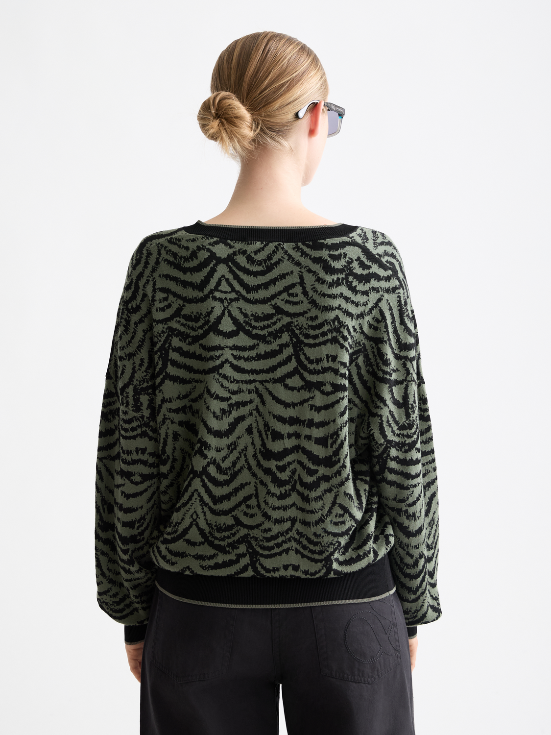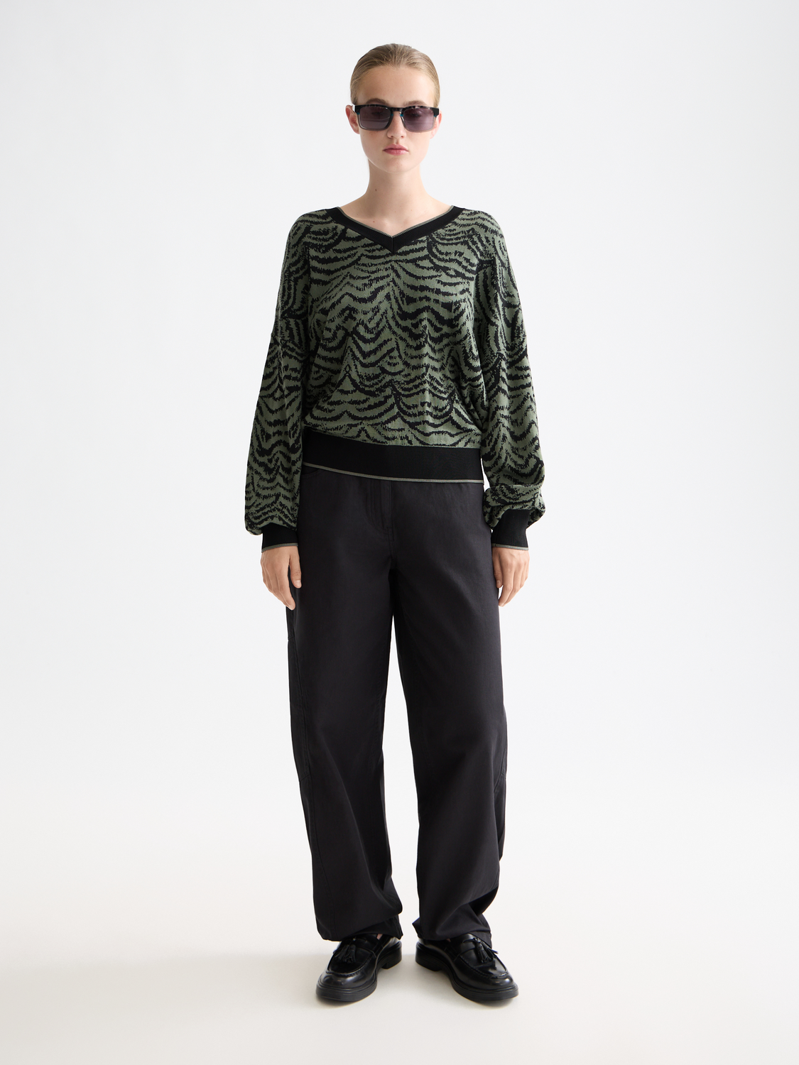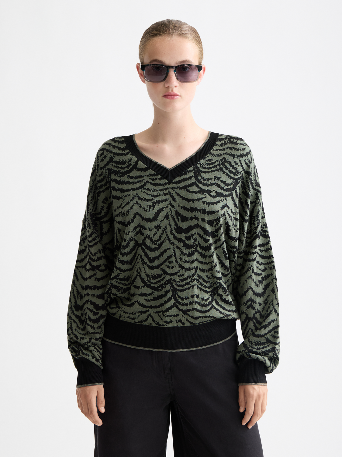 Crafted in soft jacquard, this v-neck pullover offers subtle depth and a relaxed silhouette.