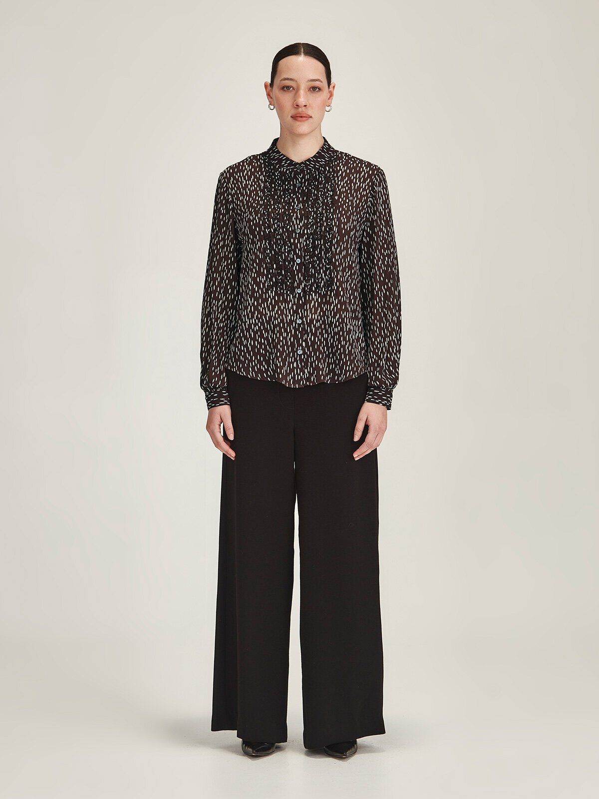 The Ami is a beautifully crafted shirt with intricate ruffle detailing. Made in the limited-edition Raindrop Spot print.