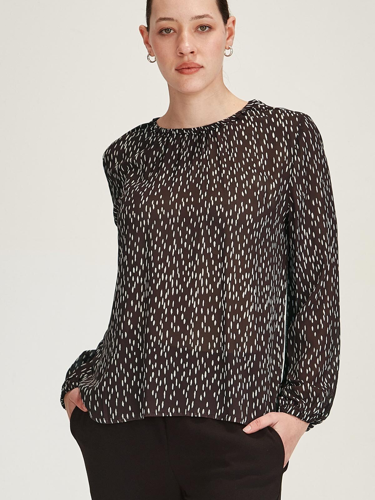 - Full-length sleeves with gathering at cuff