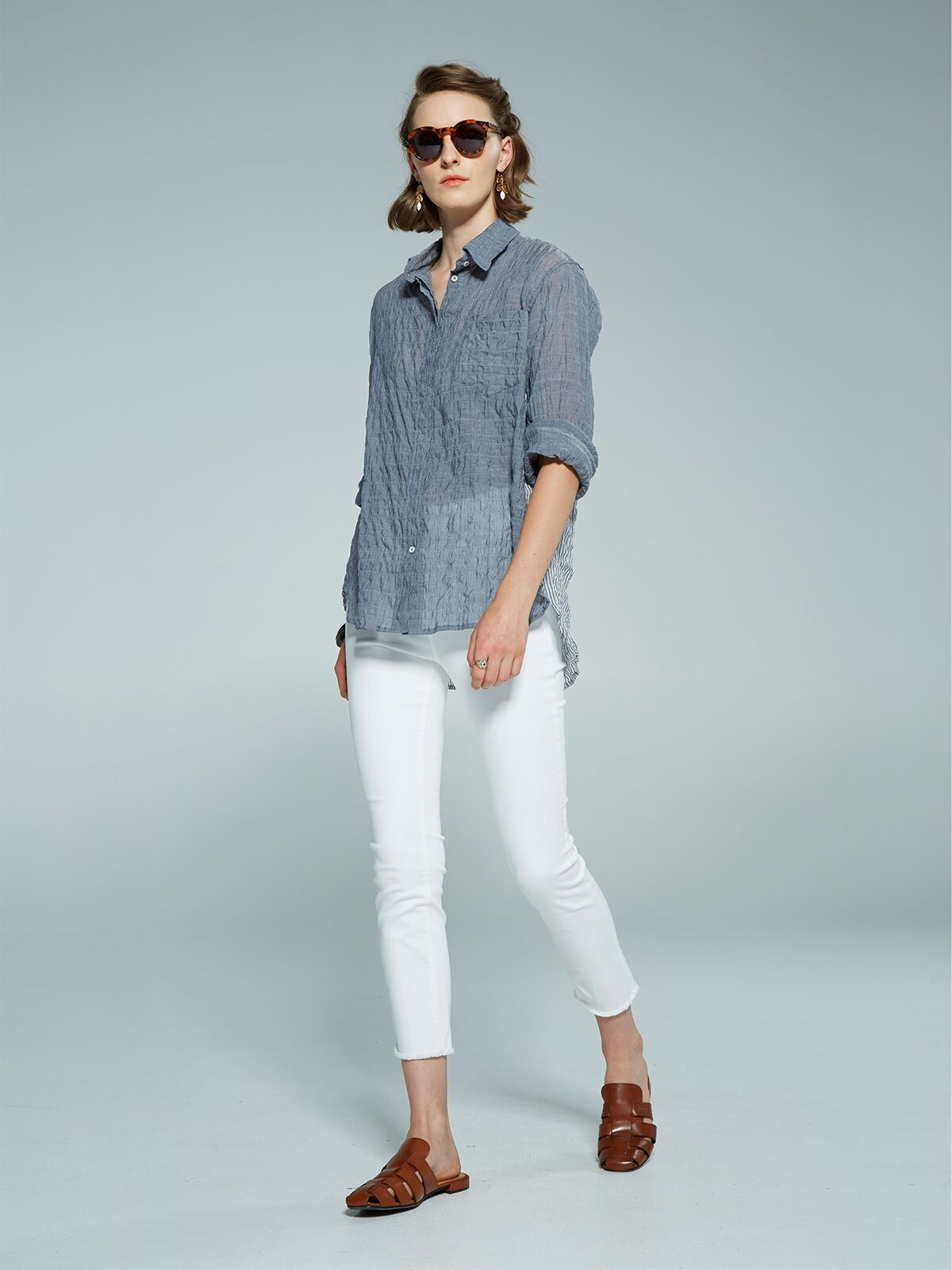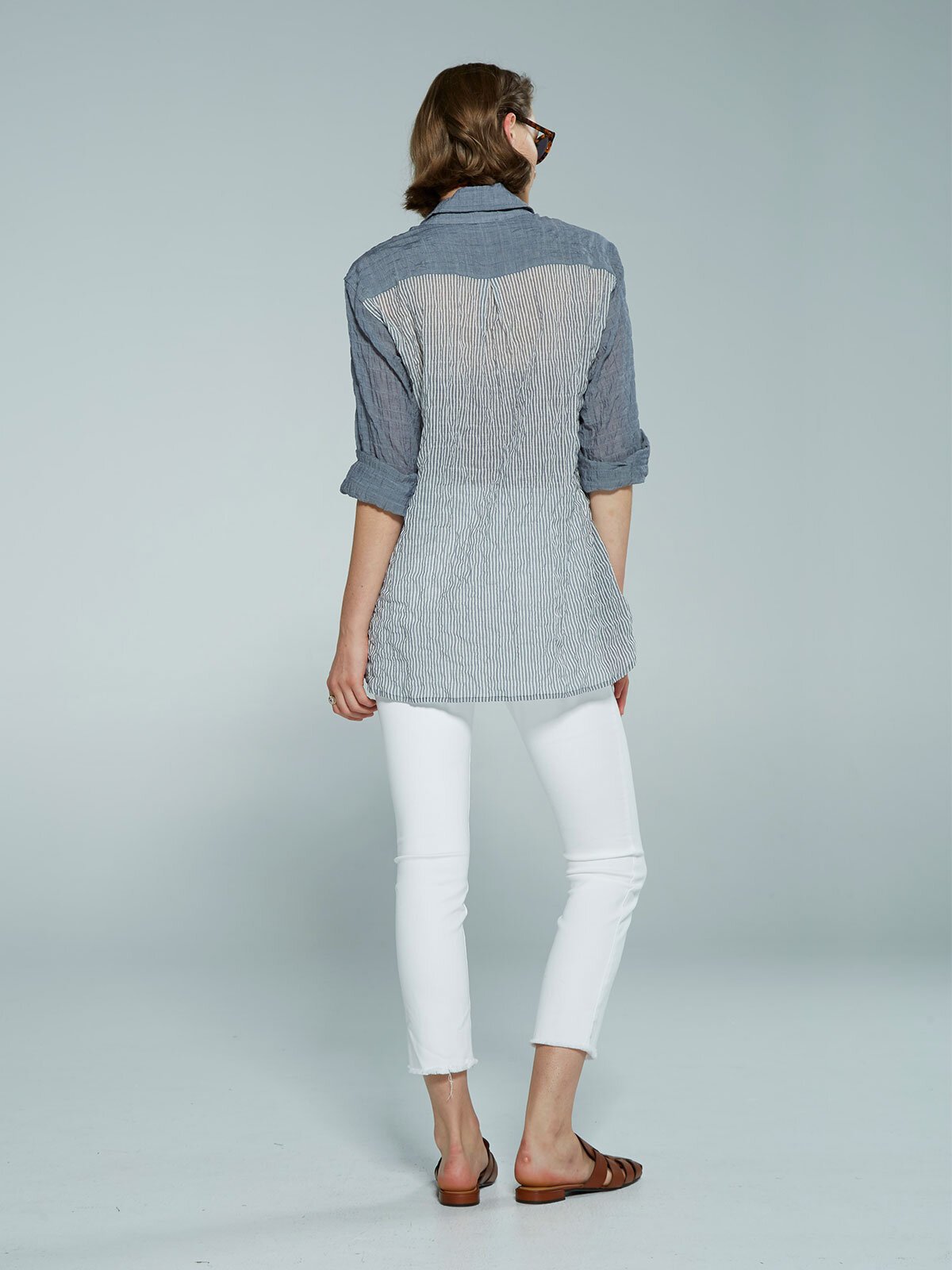 We LOVE this shirt! Made in a super soft Japanese Cotton Tencel Lawn, featuring an unexpected contrasting stripe back panel.