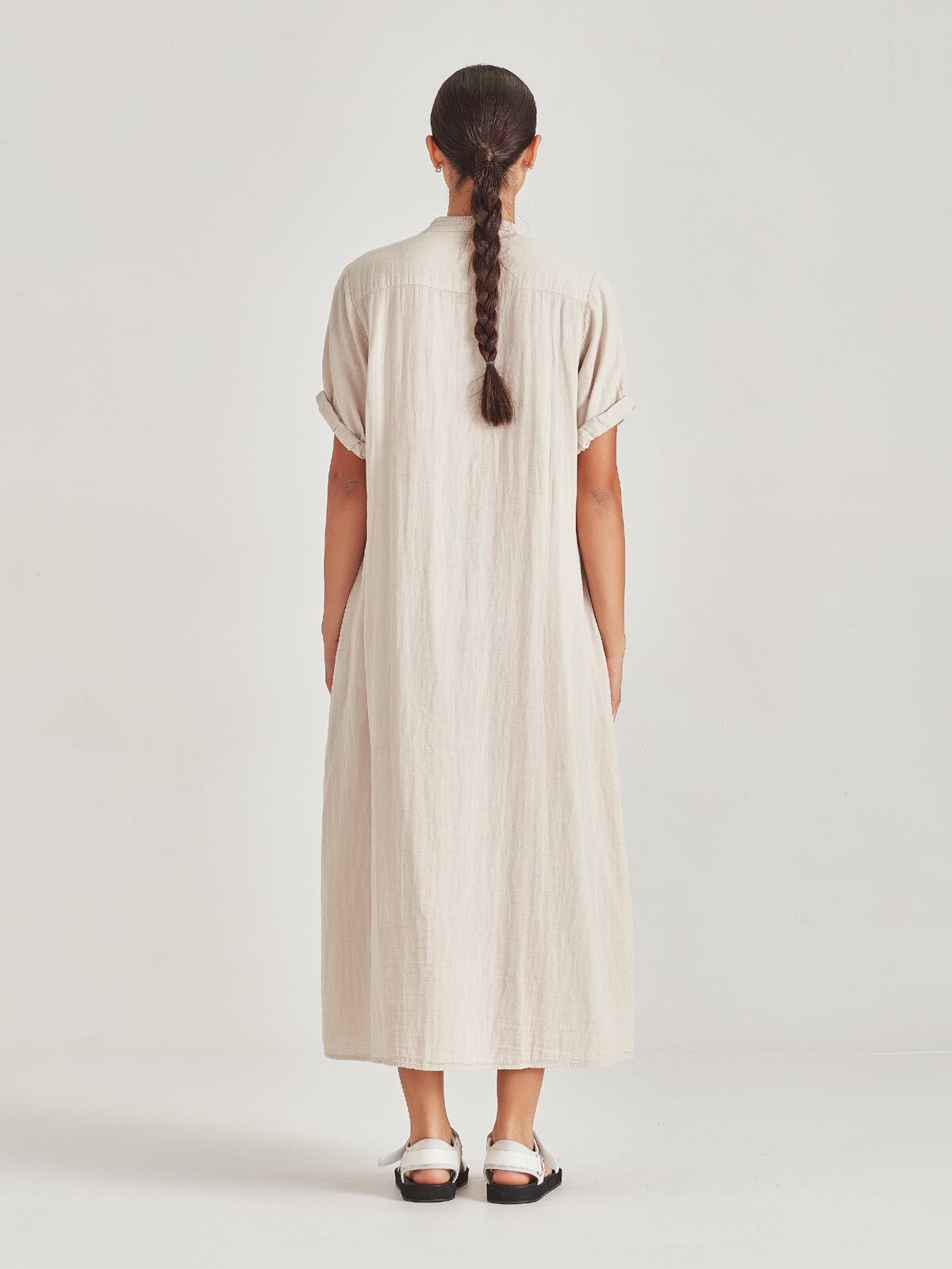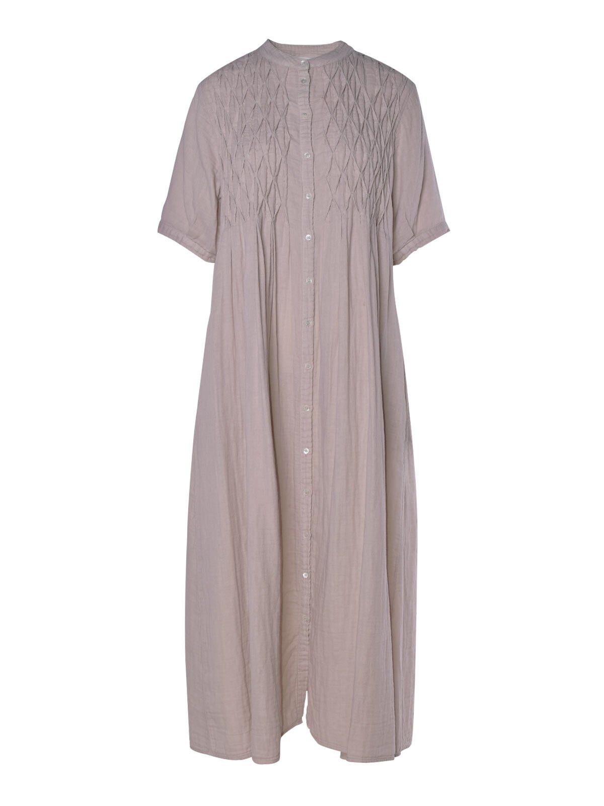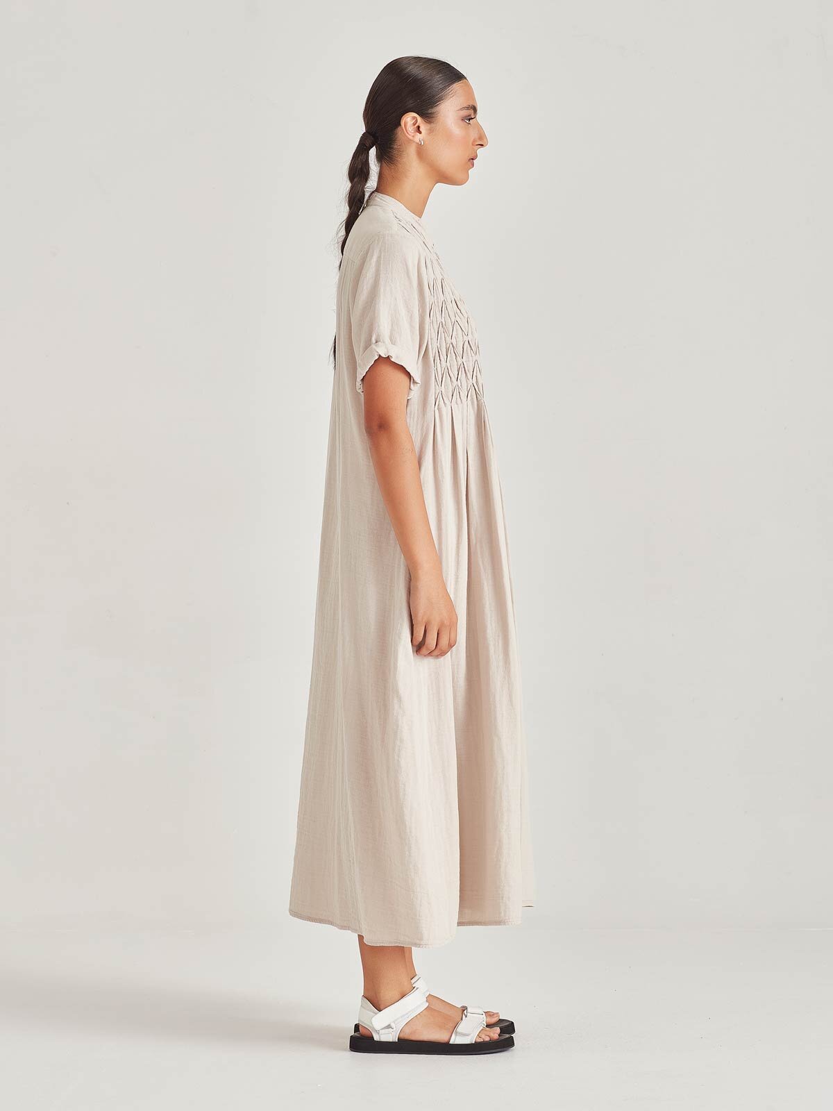 Crafted in a super-soft, double-gauze Organic Cotton, this dress is adorned with romantic diamond pintucks on the front chest. Finished with button-down fastenings down the front. Our superstar dress for the season.