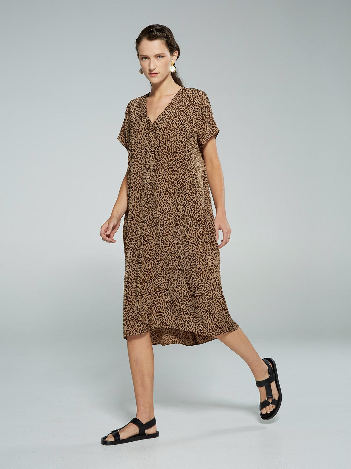 This easy throw on Dress feels like wearing nothing at all. It is the perfect travel companion in a light airy Polyester Leopard Print.