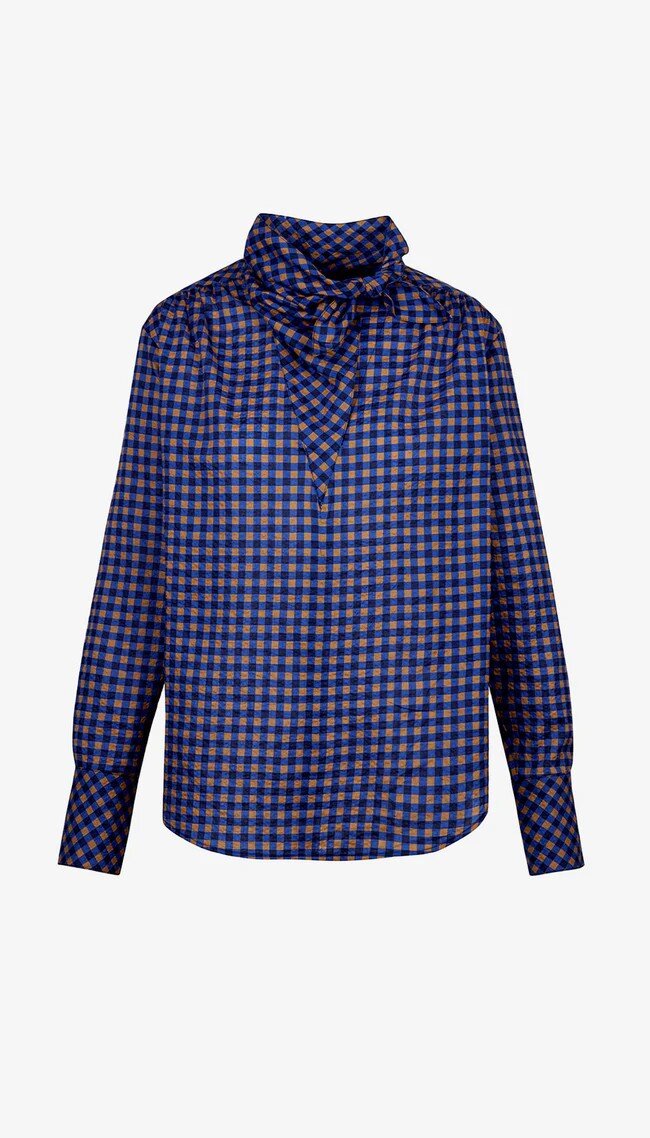 Details: Moderately tailored, this over-the-head shirt features a tie neck detail and shirring at the shoulder seam. This garment fits true to size, take your usual size.